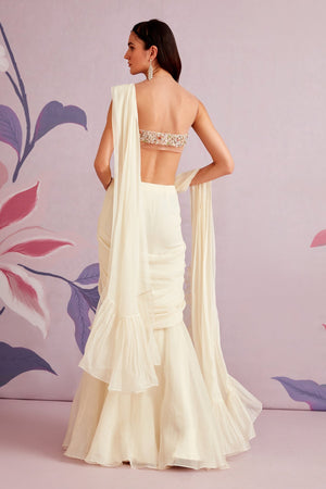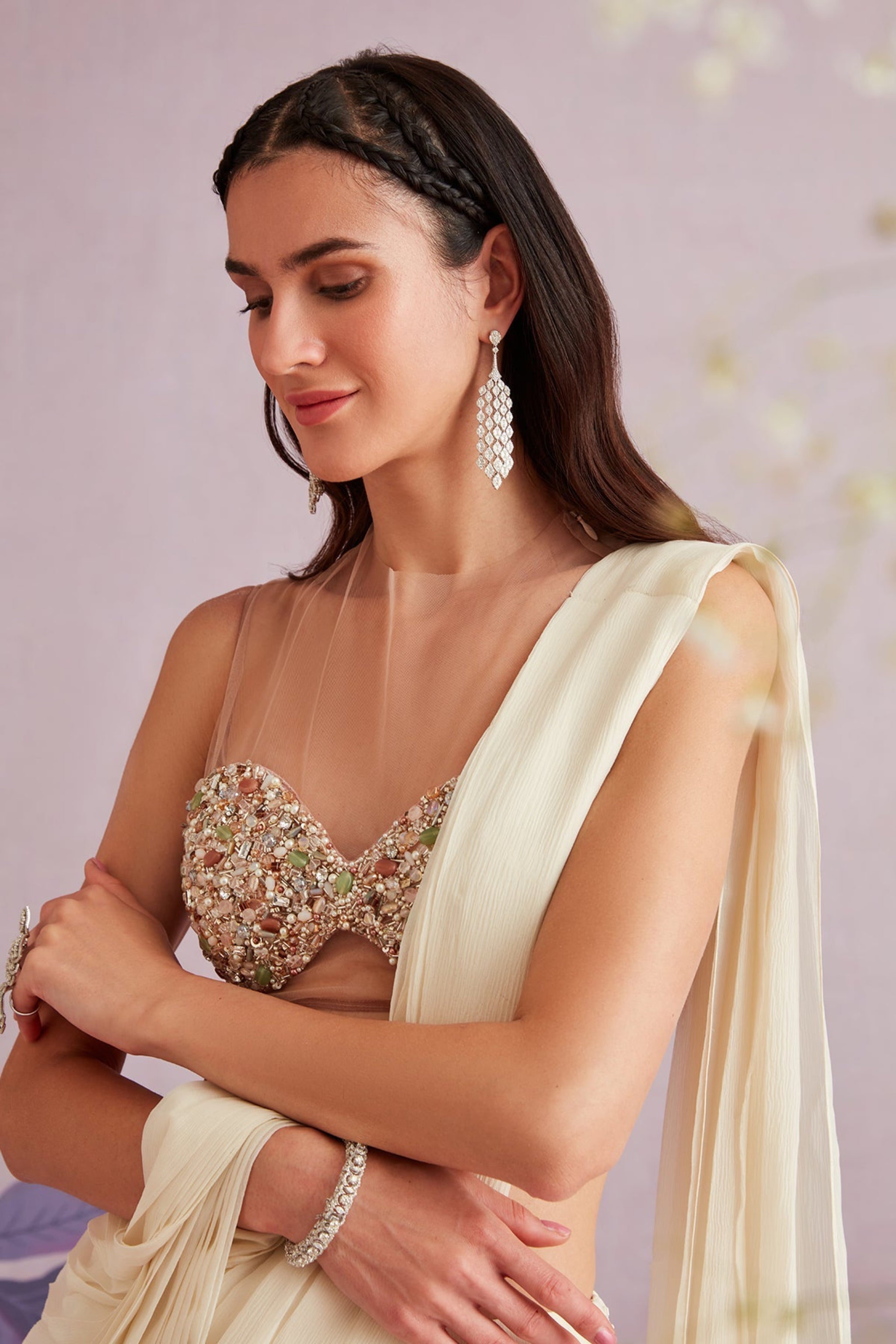 • Embroidered net blouse with organza draped saree paired with embroidered belt