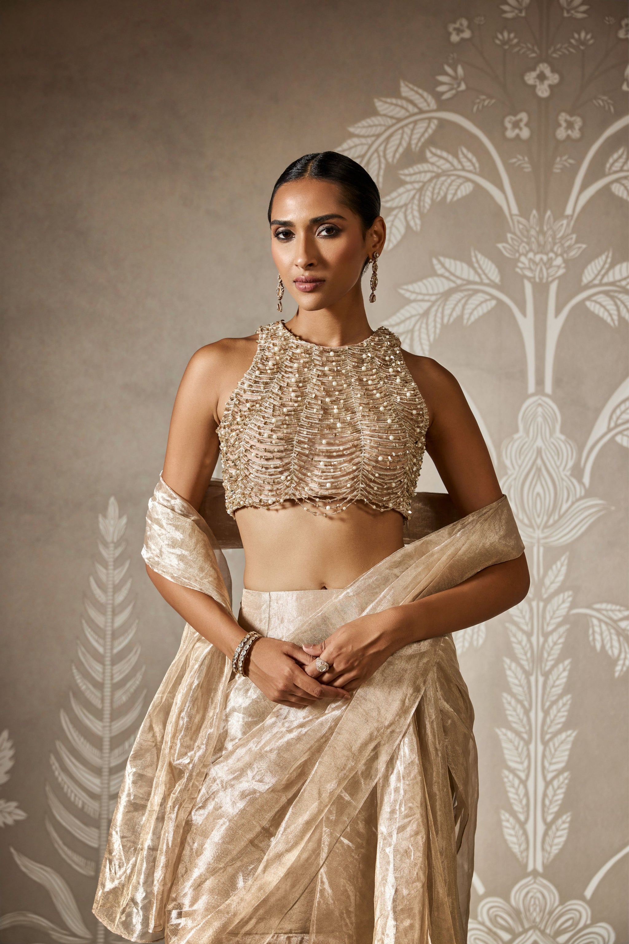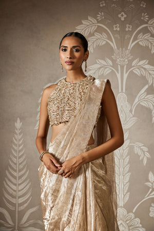 • Allover embroidered net sleeveless blouse paired with plain tissue draped saree