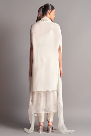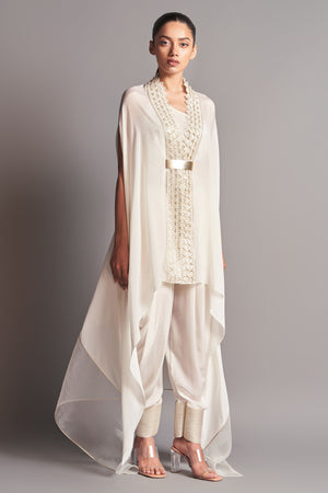 • Cape with hand woven metallic polymer and embroidered lace placket paired with draped pants