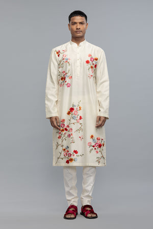 • Elevate your festive and occasion wear with this elegant men's kurta set crafted in rich chanderi fabric. The kurta features detailed resham thread work, showcasing refined hand embroidery that adds a touch of tradition and sophistication. Paired with a matching pant for a complete look. Perfect for weddings, celebrations, or cultural gatherings.
