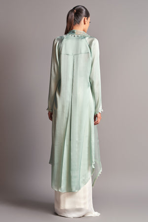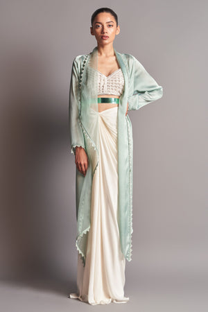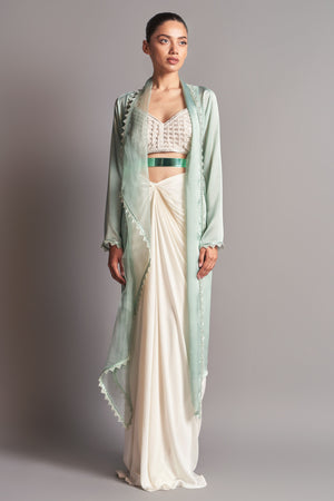 • Shawl collar cape paired with hand woven & embroidered metallic polymer lace blouse and draped skirt