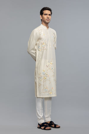 • Elevate your festive wardrobe with this elegant men's kurta crafted from rich chanderi fabric. Featuring fine machine embroidery that resembles delicate handwork, this kurta blends tradition with subtle sophistication. Paired with matching pants, it offers a complete and comfortable ensemble perfect for special occasions and celebrations.