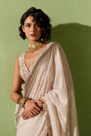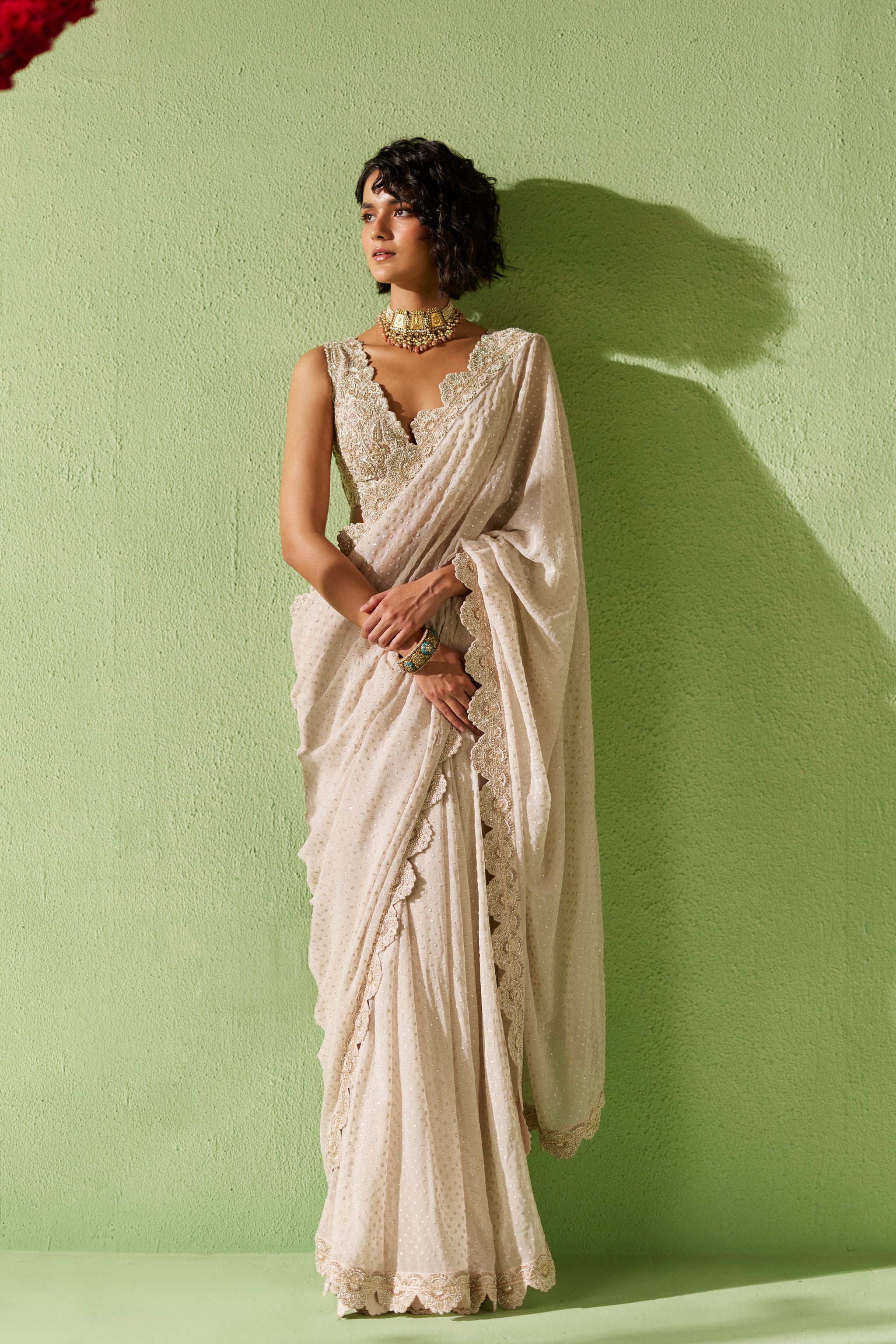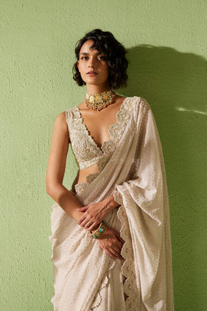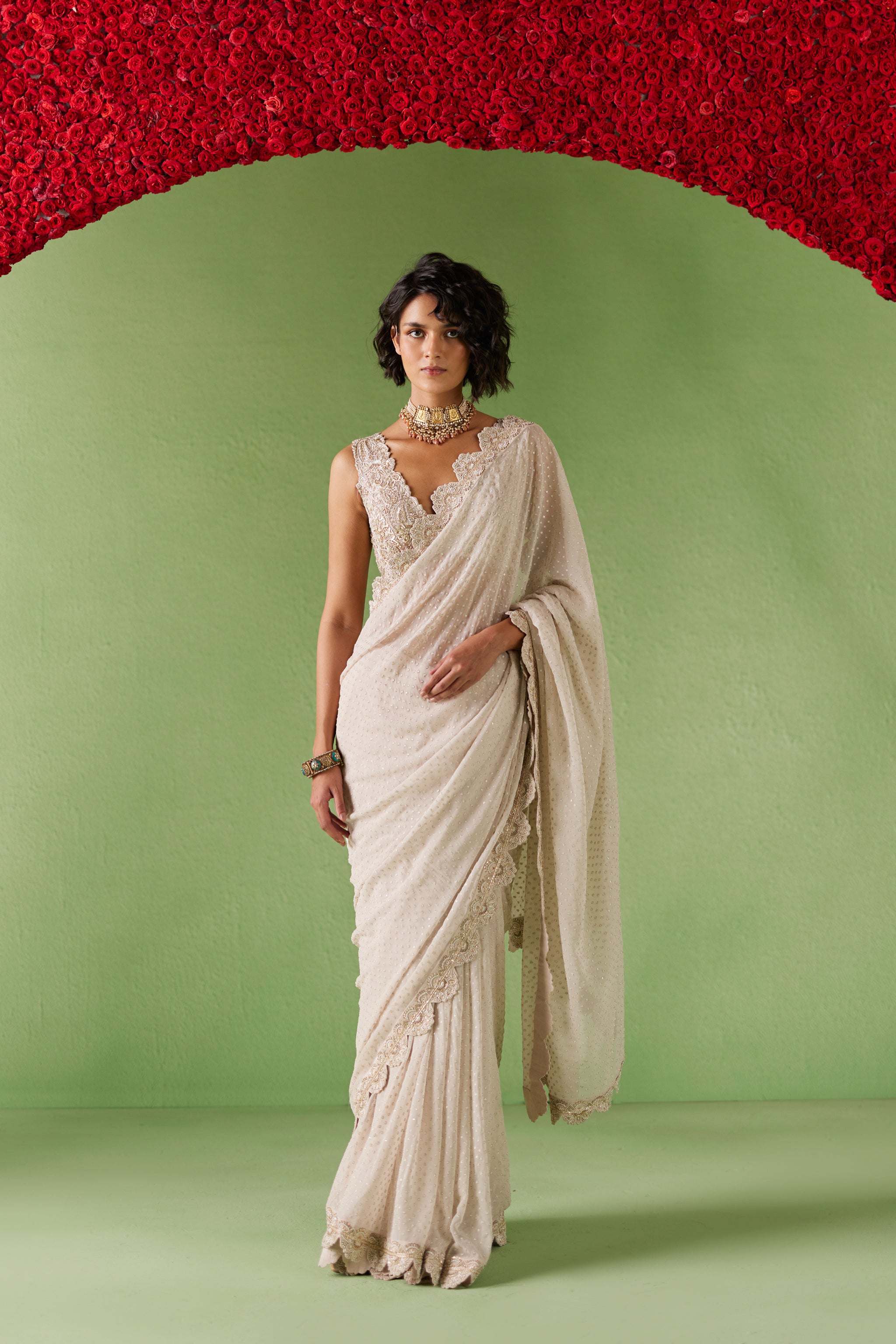 • Ivory sleeveless blouse with plunge neckline and ivory resham, zardozi and pearls hand embroidery.