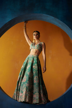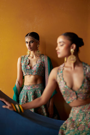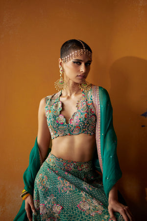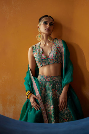 • Rama green blouse with resham and zardozi embroidery with plunge scalloped neckline. Paired with Rama green lehenga and organza dupatta with resham and zardozi embroidery along with badla checks texture. Components: 3 Fit: True to Size.