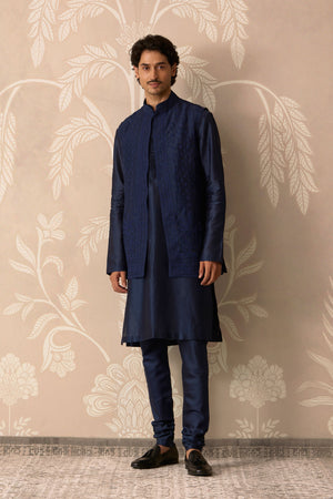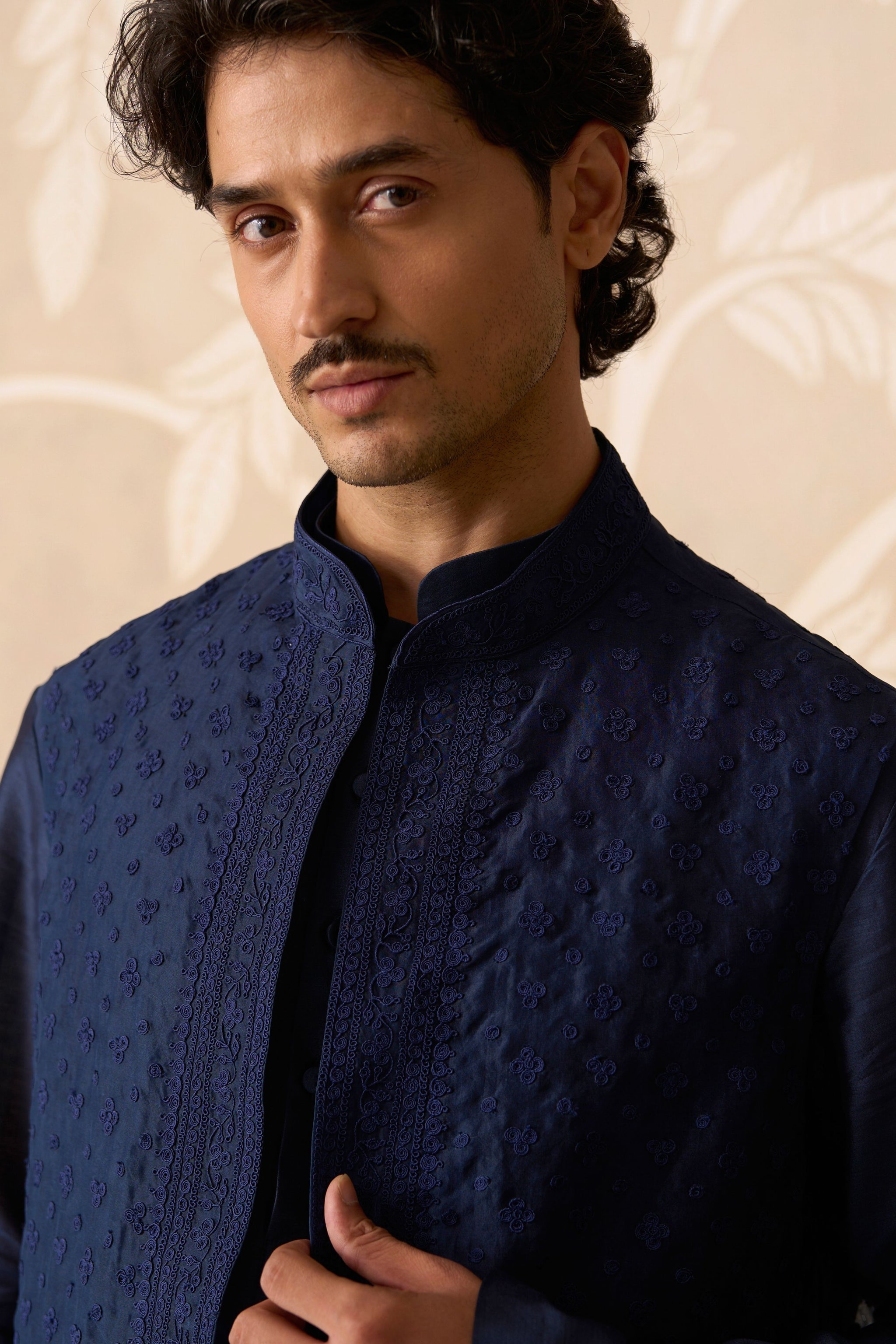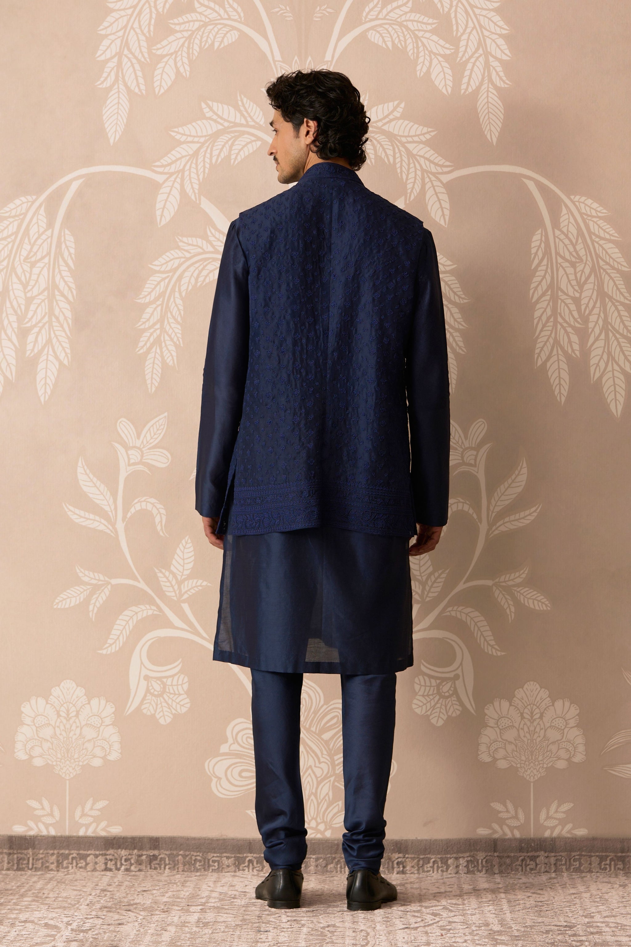 • Organza allover embroidered sleeveless short bandi paired with chanderi kurta and trouser