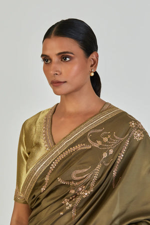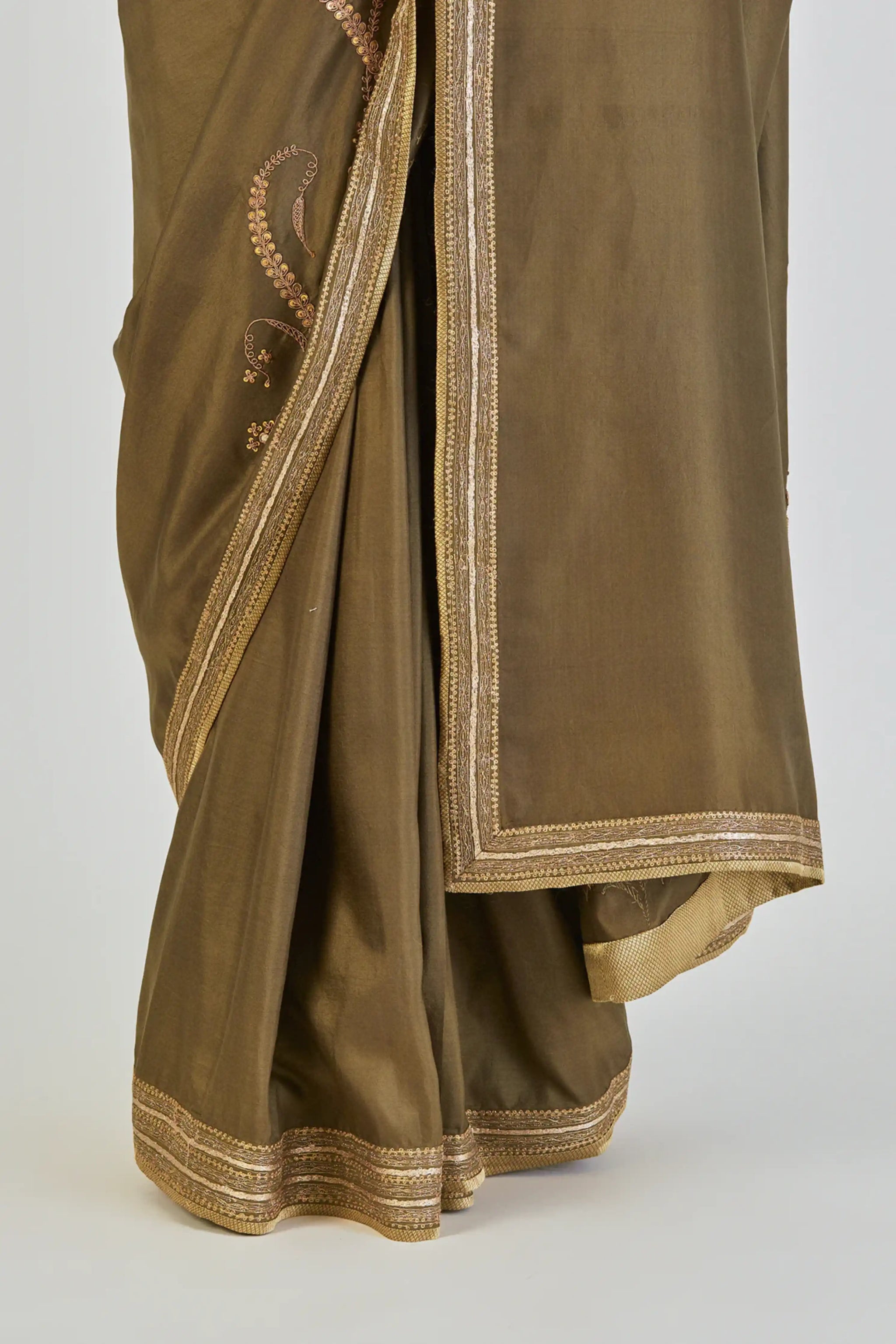 • Nikita saree is crafted in fine handwoven silk. It has floral motifs embroidered in marodi technique and borders with lace-like embroidery. Blouse worn by the model is not included. Saree dimensions: length 215 inches x width 44 inches