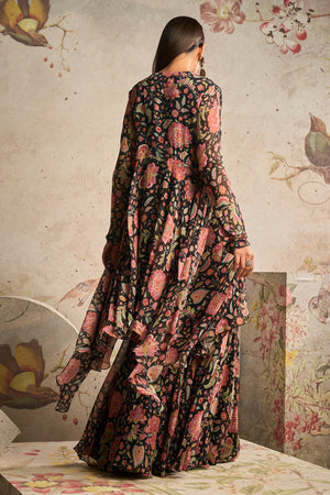 • Black printed chiffon embroidered draped tunic with printed chiffon garara