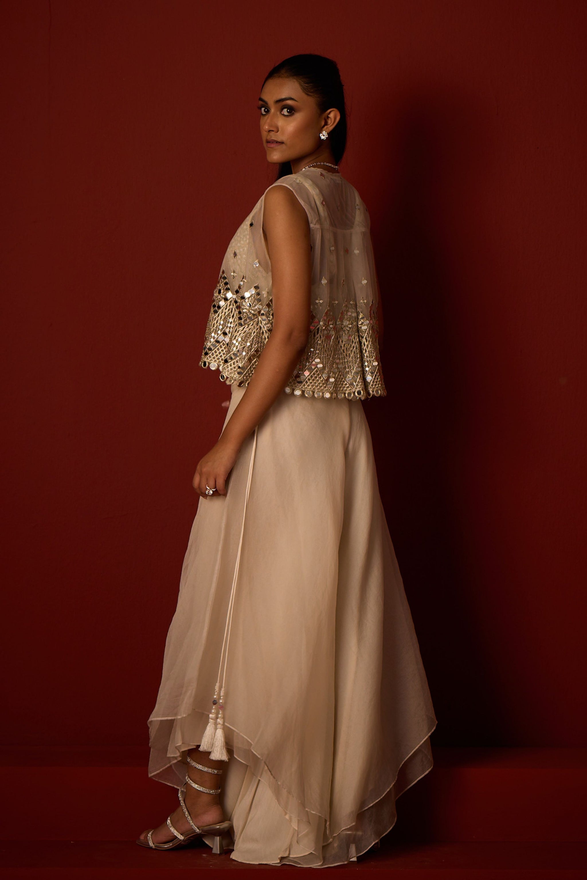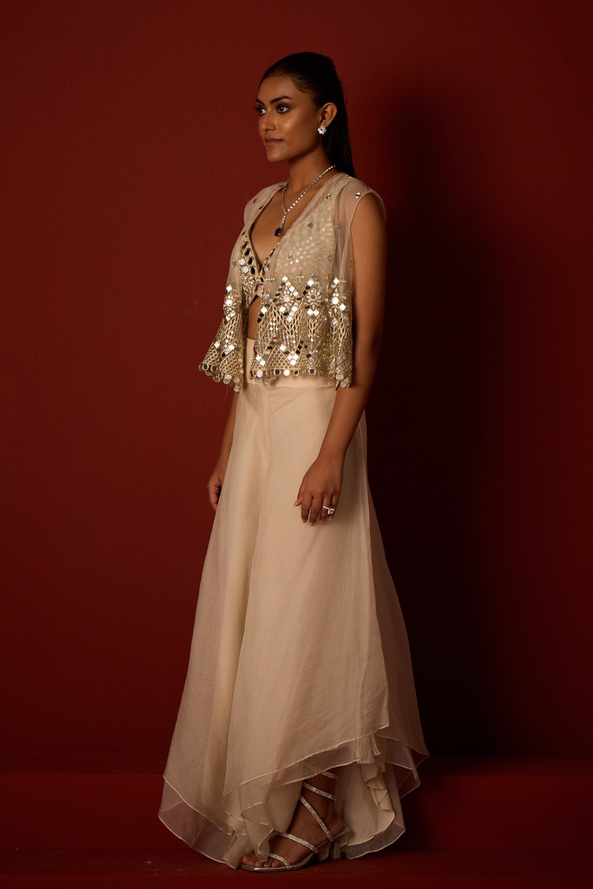 • Aari mirror work asymmetrical gilet with zari mirror work jali details