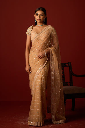 • A classic saree adorned with intricate mirror work spread and embellished mirror work borders. Beaded tassels on the pallu, paired with a beautifully structured blouse, fitted with delicate crystal laces , this ensemble blends timeless artistry with modern sophistication. Deep neck blouse embellished with beads sequins mirror work.