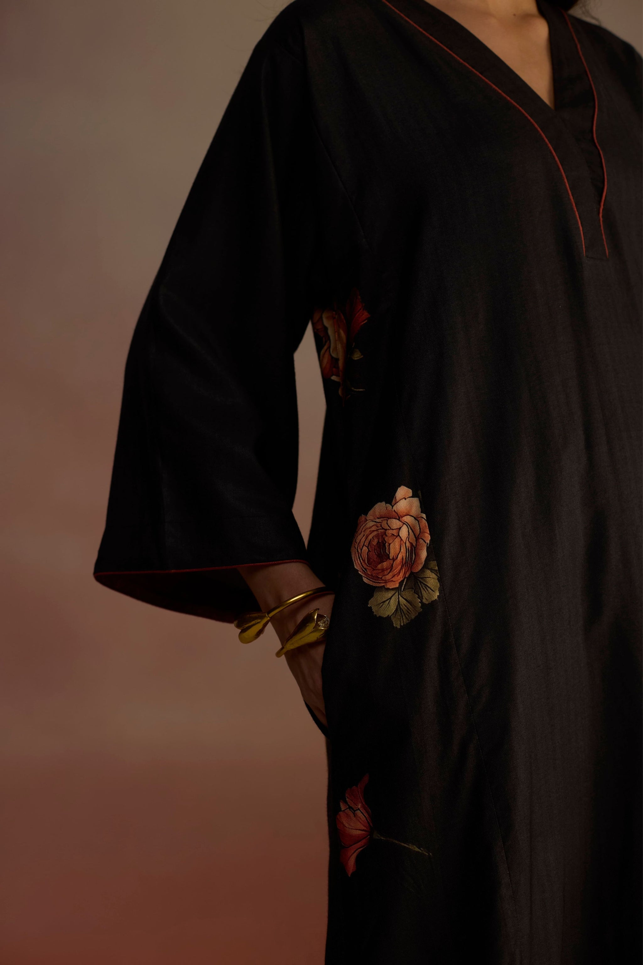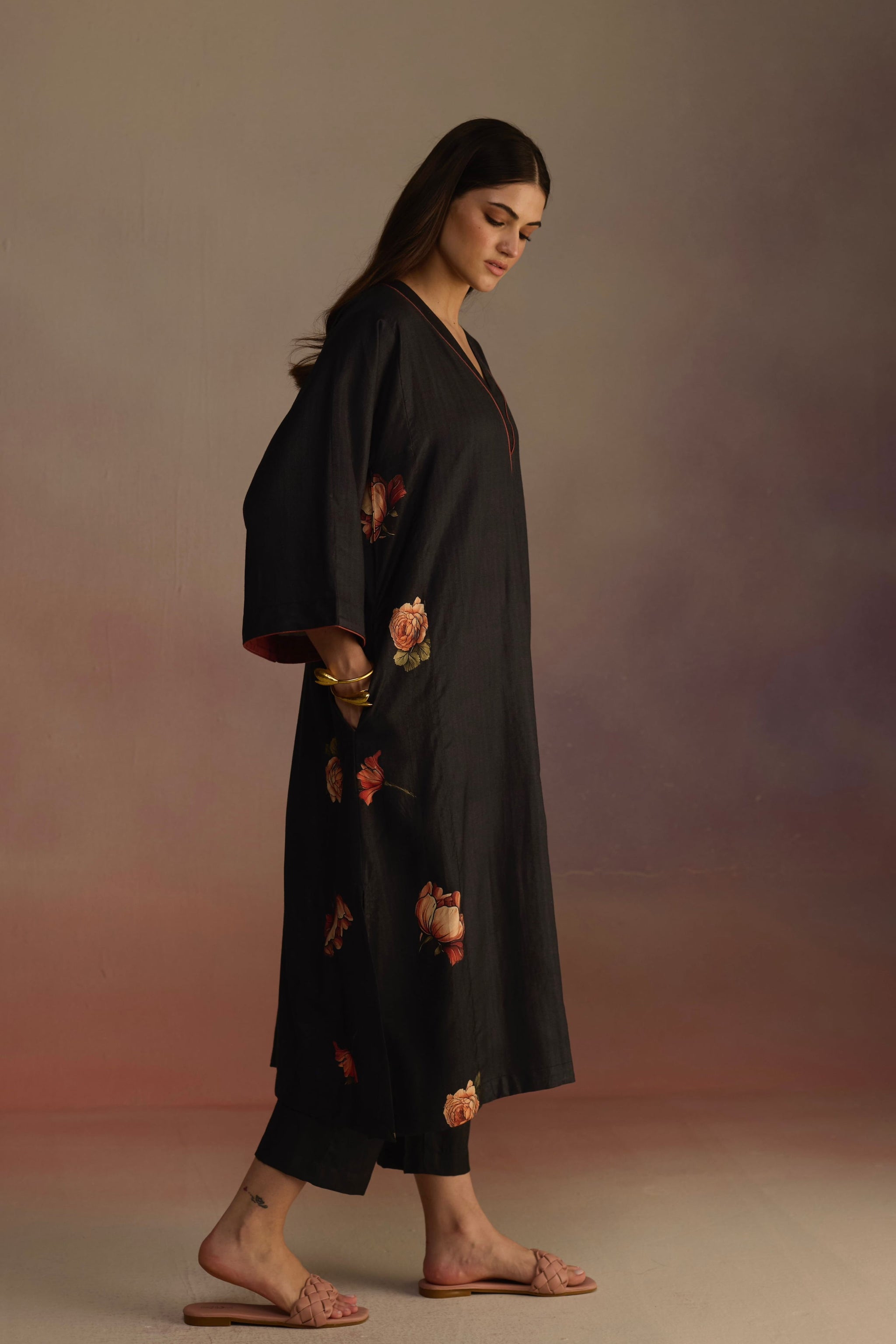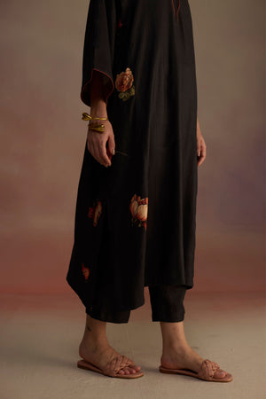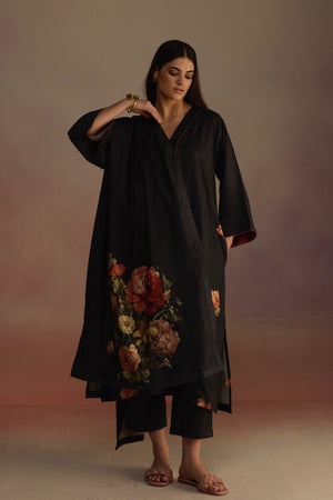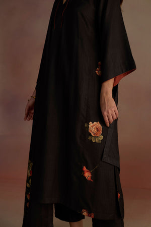 • A-line kurta with contrasting color lining on the neck and sleeves, adorned with watercolor hand-drawn floral motifs across the kurta. Paired with straight pants and a floral stole for a cozy look.