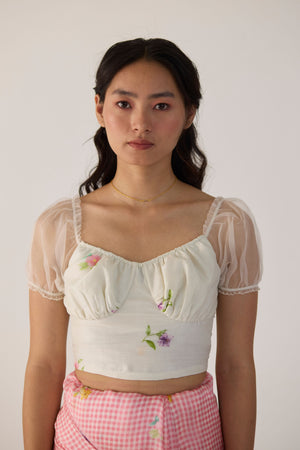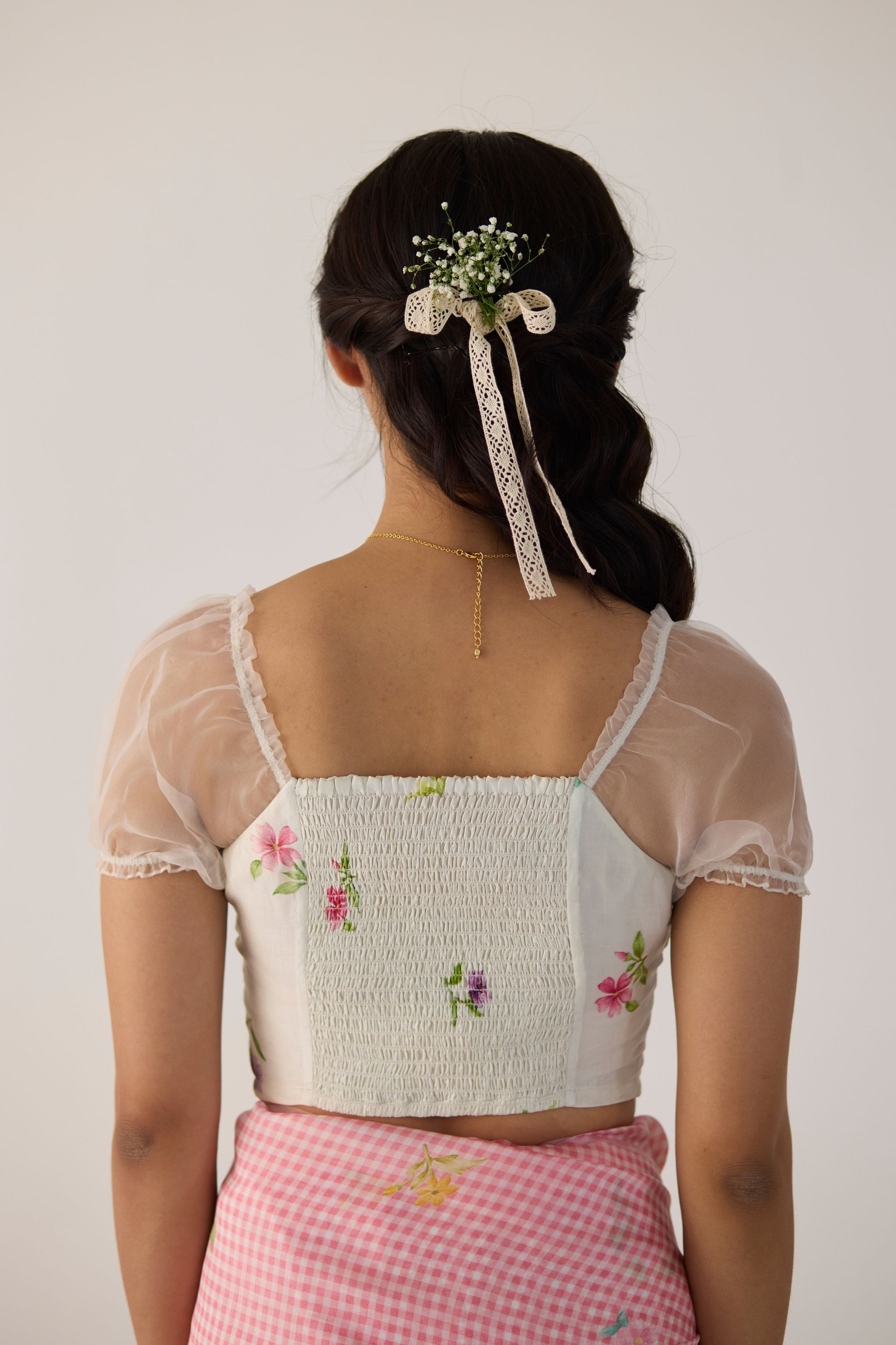 • Mulberry silk and organza sleeve blouse with smocking at back. Worn from top. No opening.