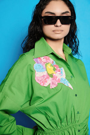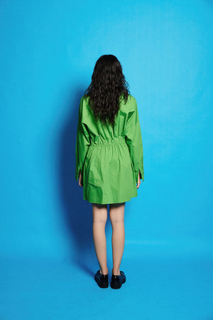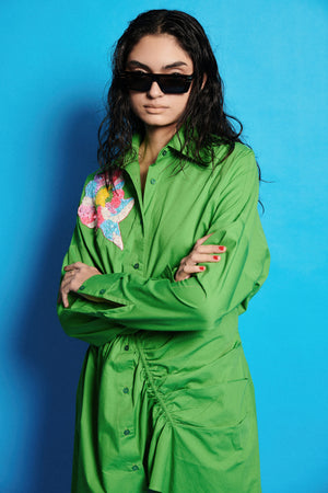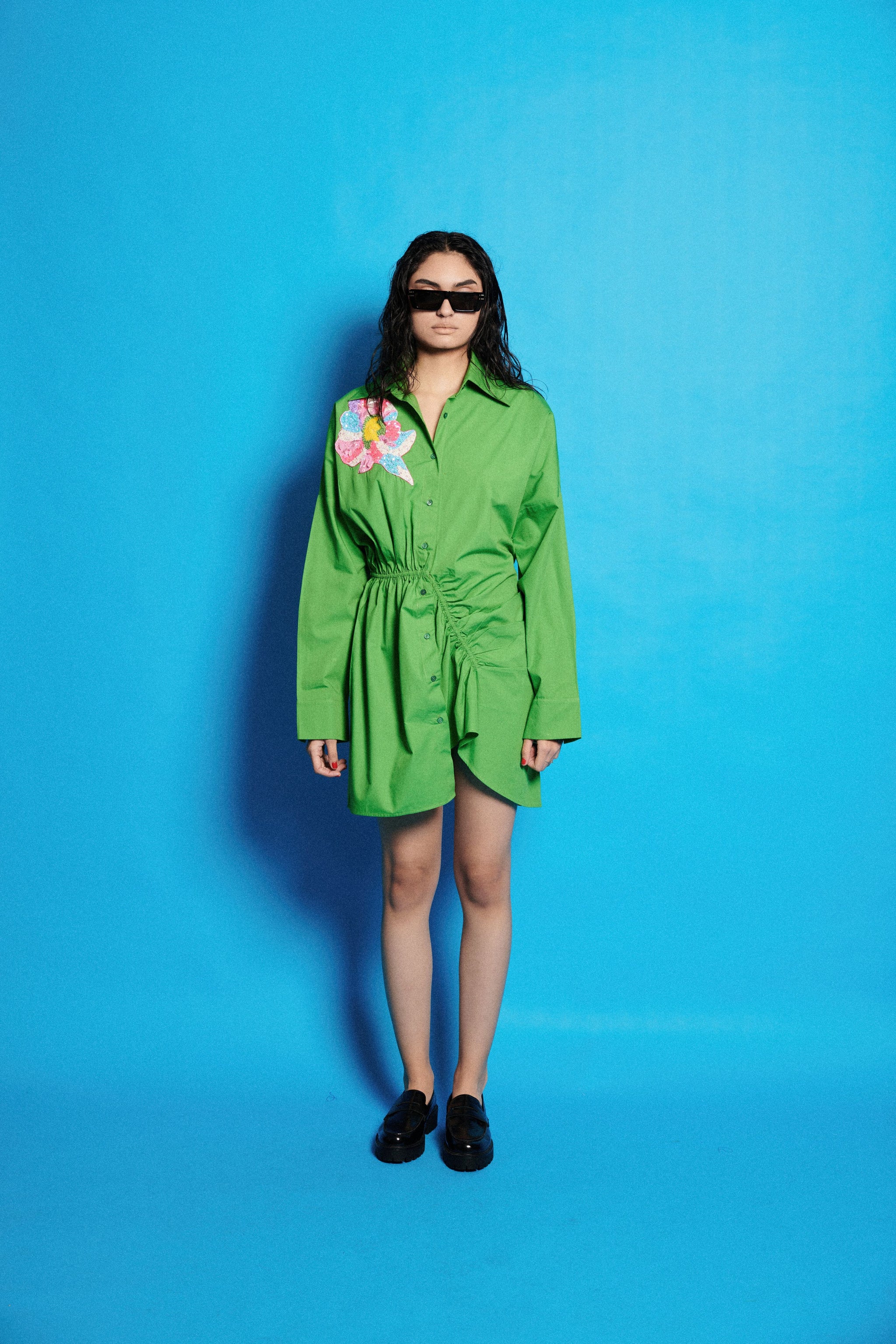 • A green dress with asymmetrical hem and ruched details creates a stylish and dynamic look effortlessly