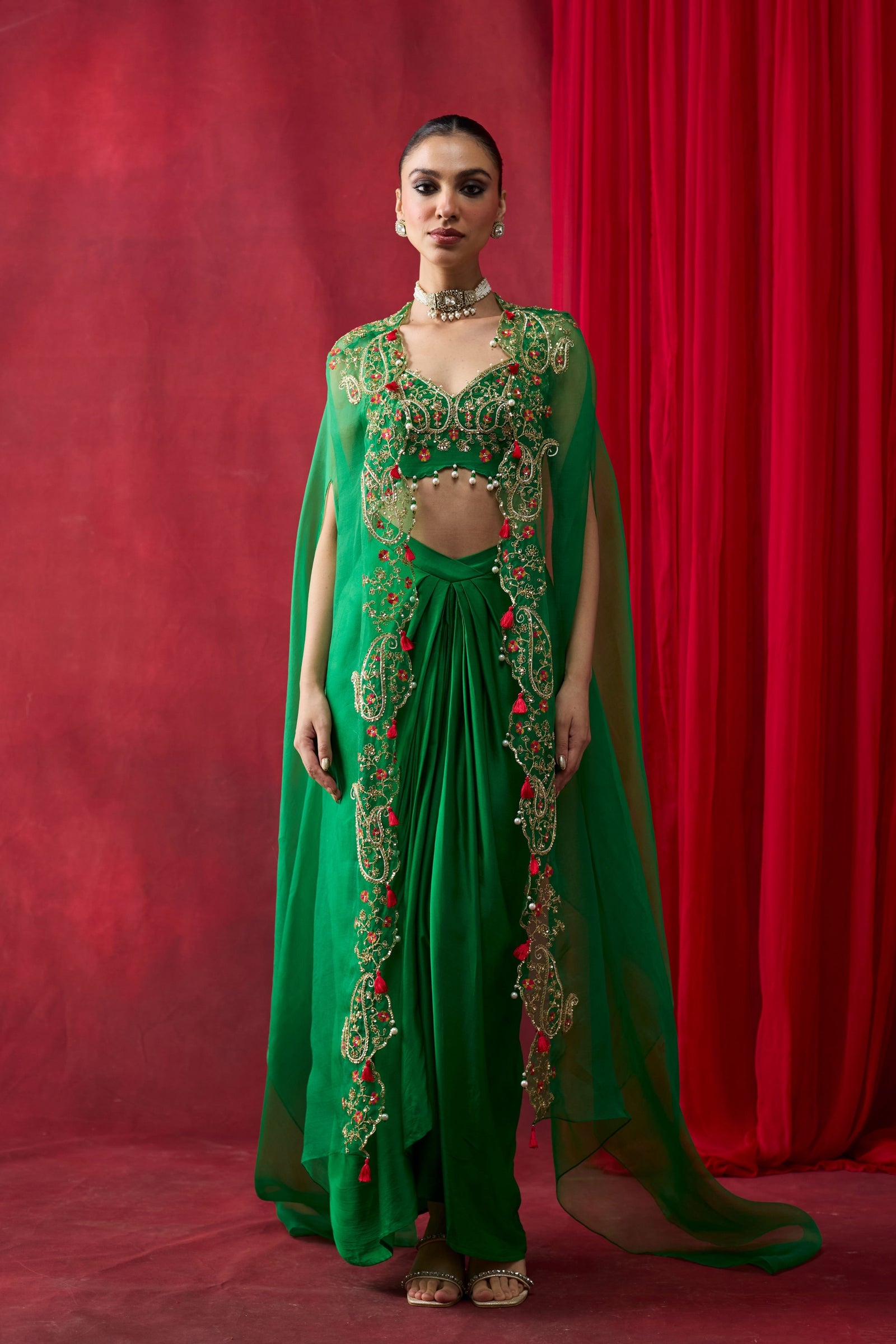 • Green silk chanderi a-line top with thread and hand embroidery. Paired with silk satin cowl pants.