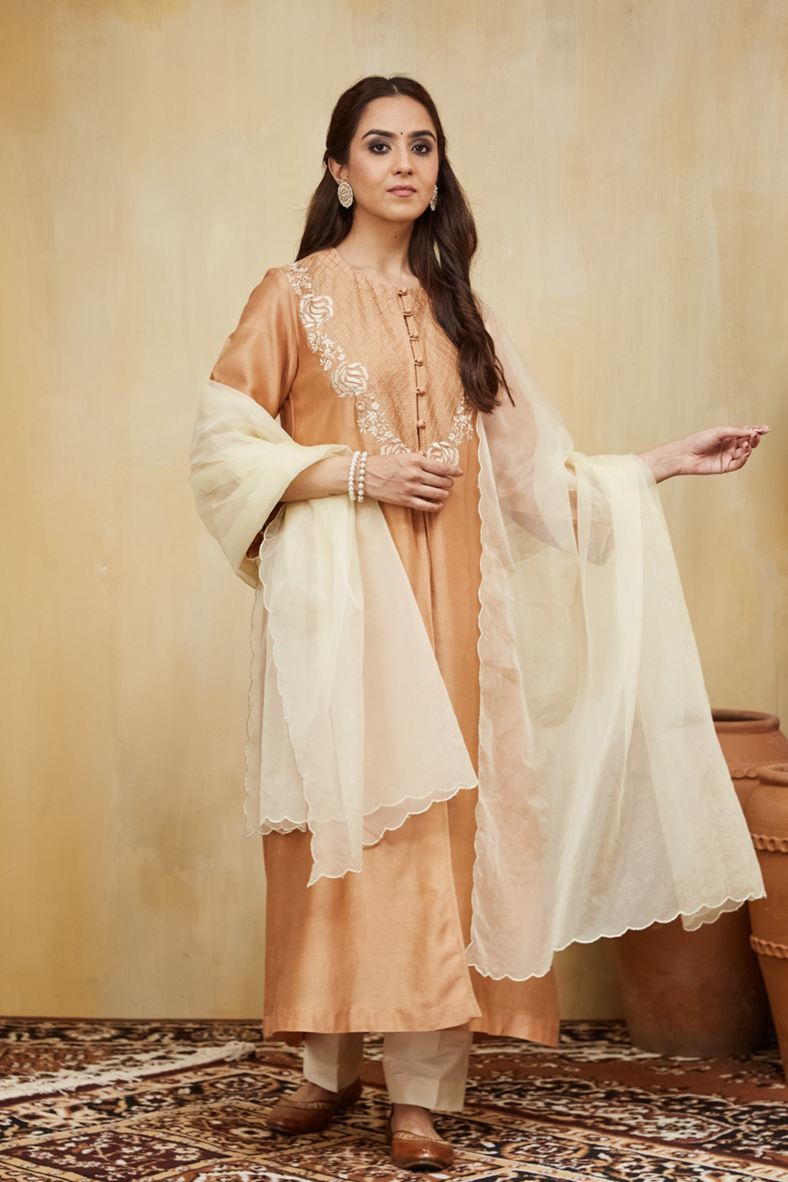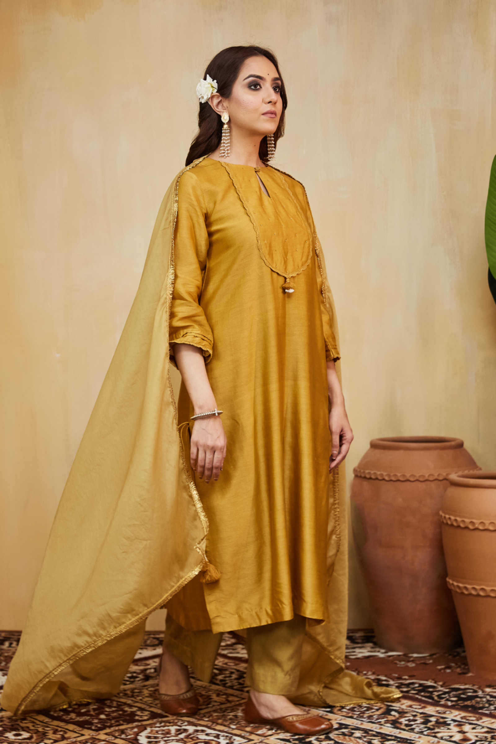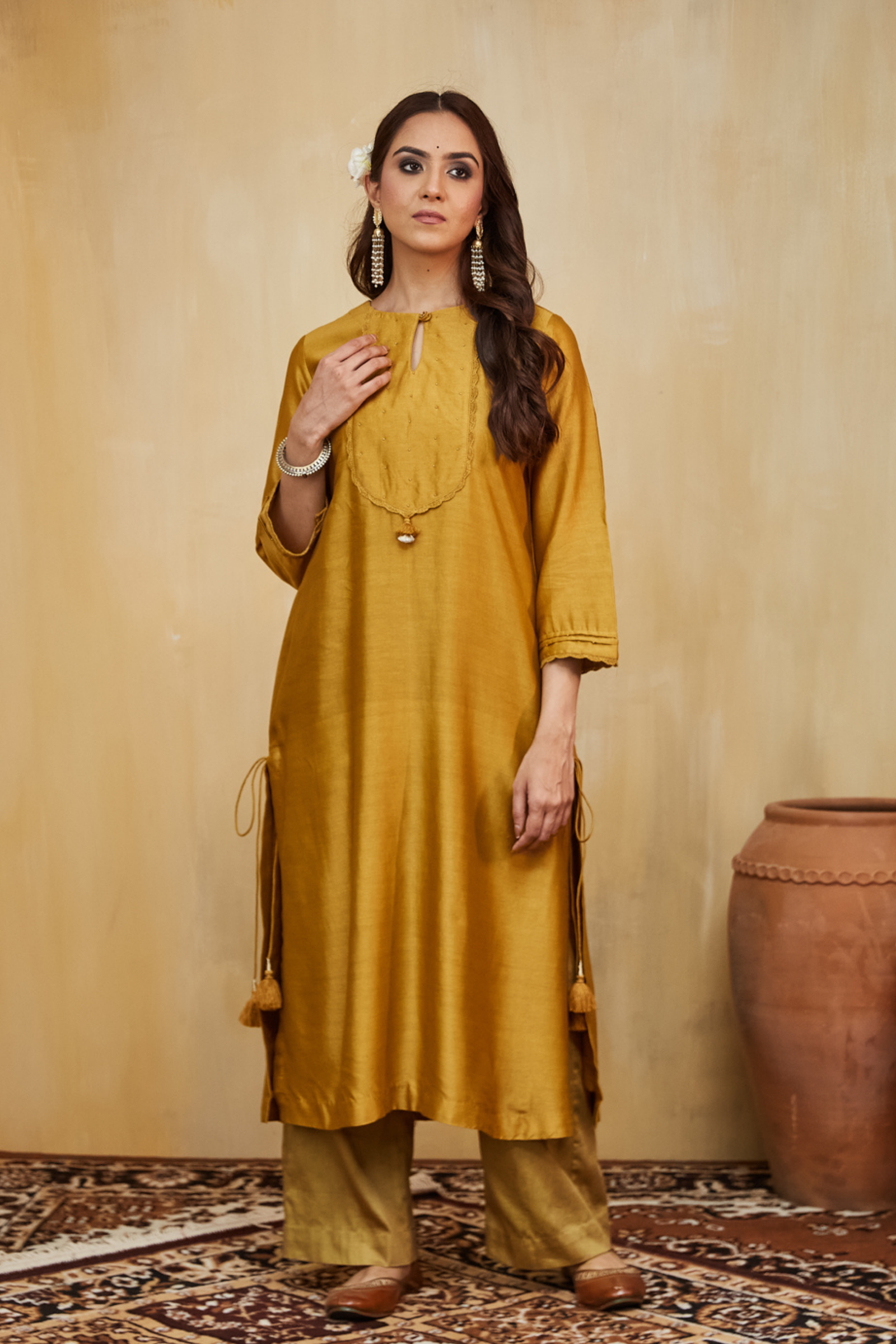 • Beige gold cotton silk pants with an elasticated waist and front dori tie-up.