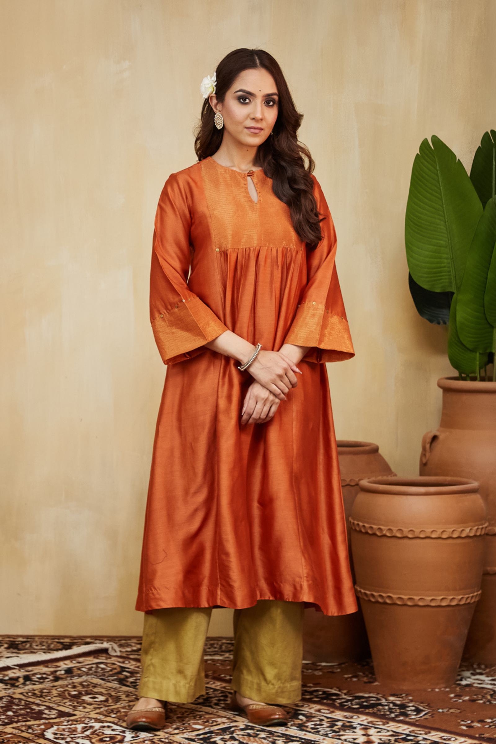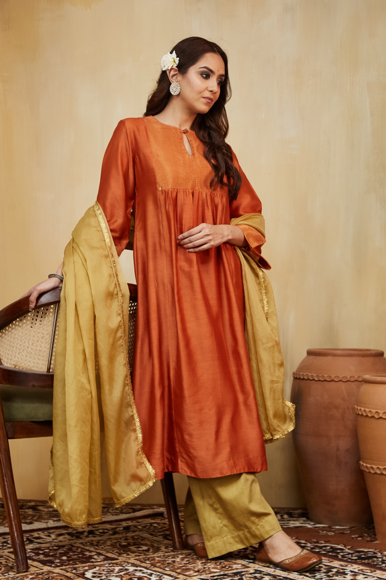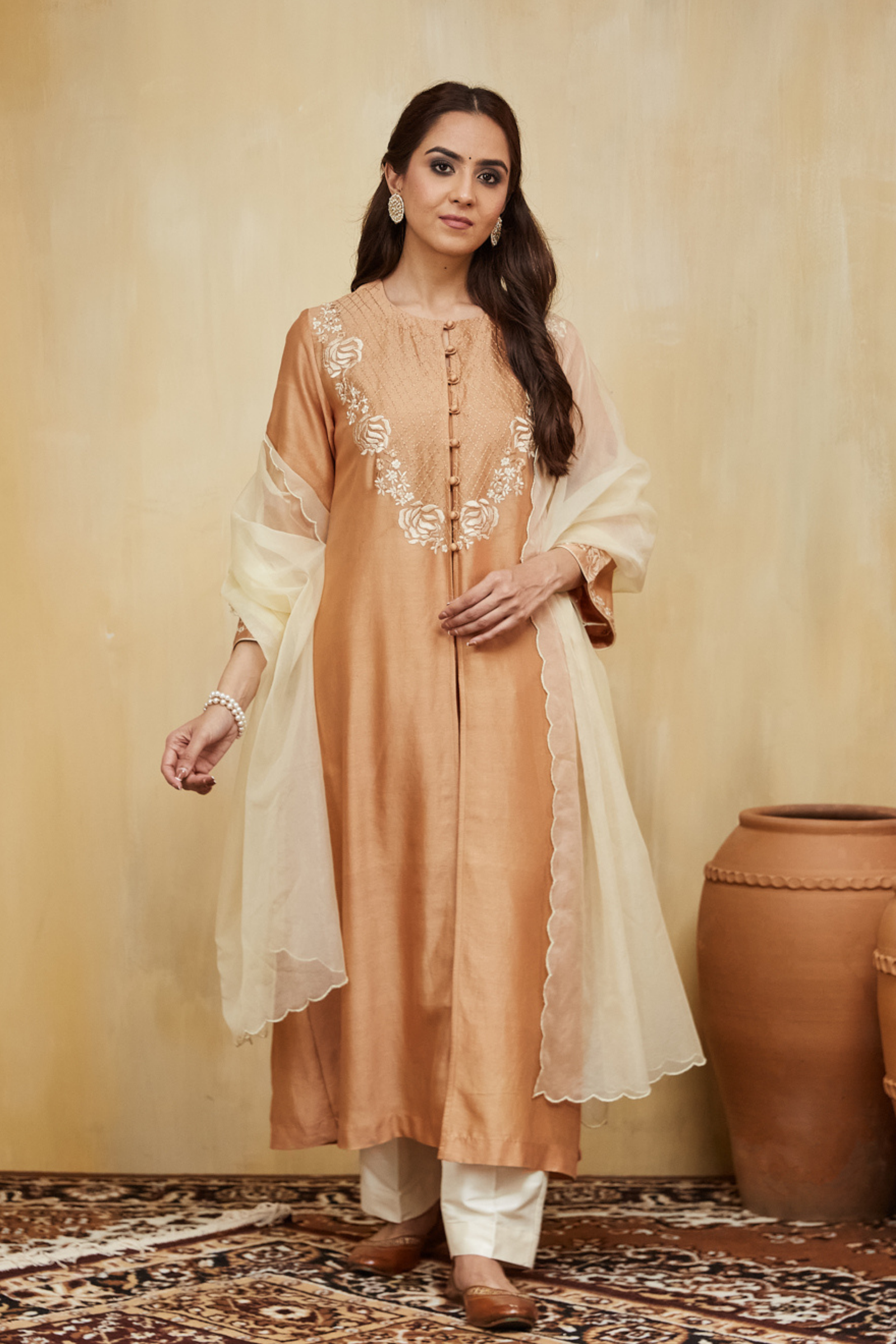 • Beige gold cotton silk pants with an elasticated waist and front dori tie-up.