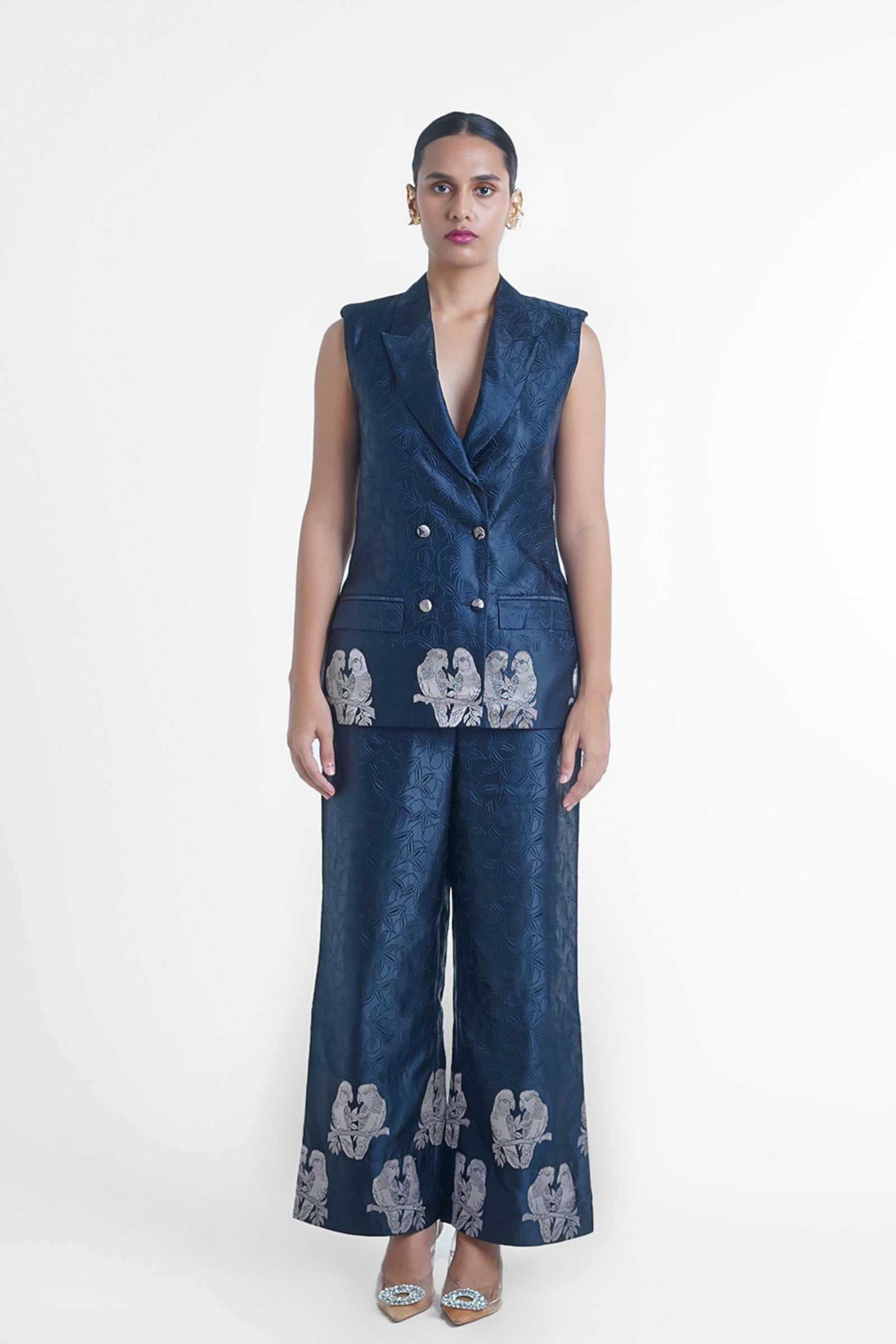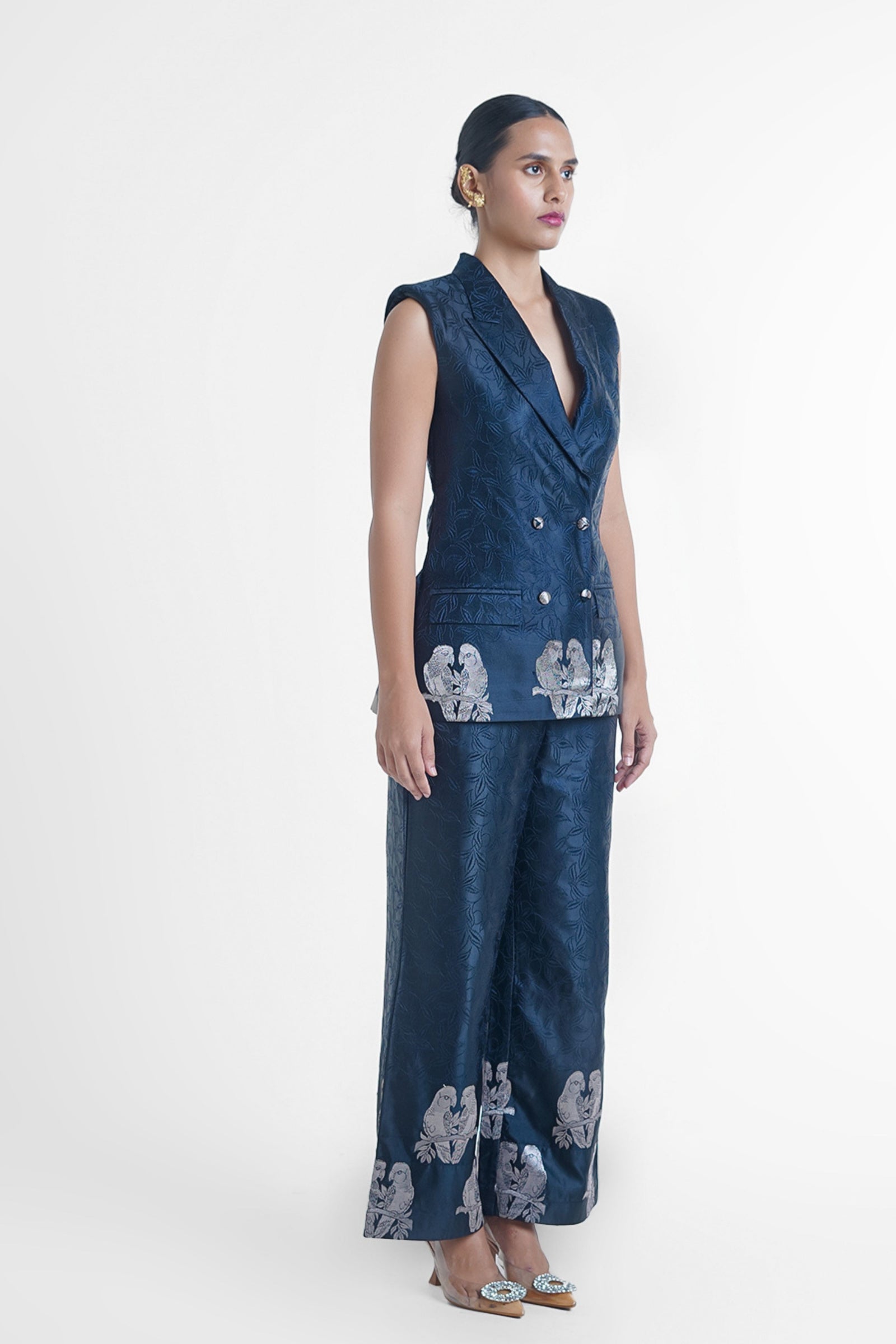 • Black silk waistcoat is made on the bed of silk weaved with intricate floral jaal motif. It has rectangular gold metal button.