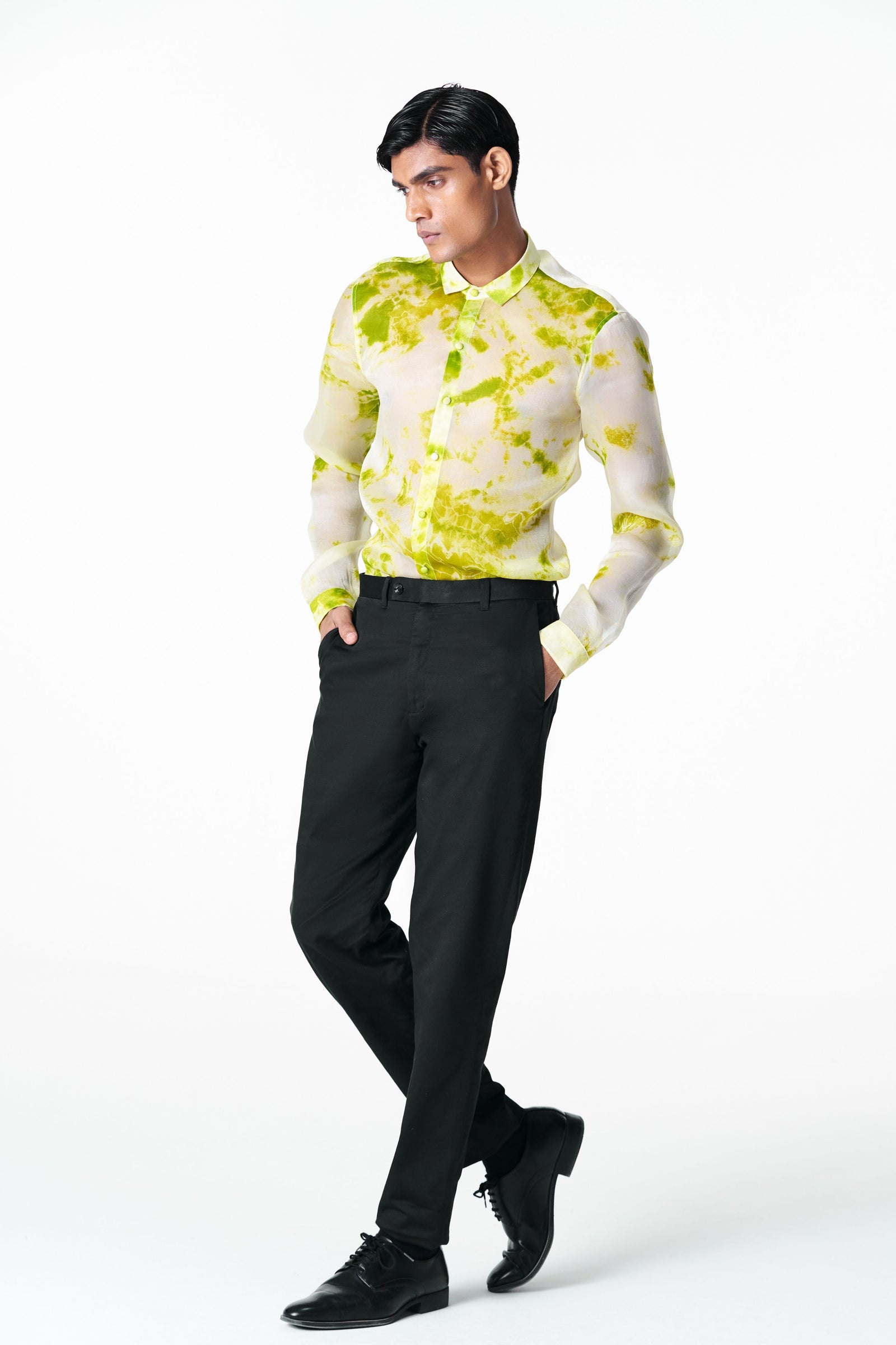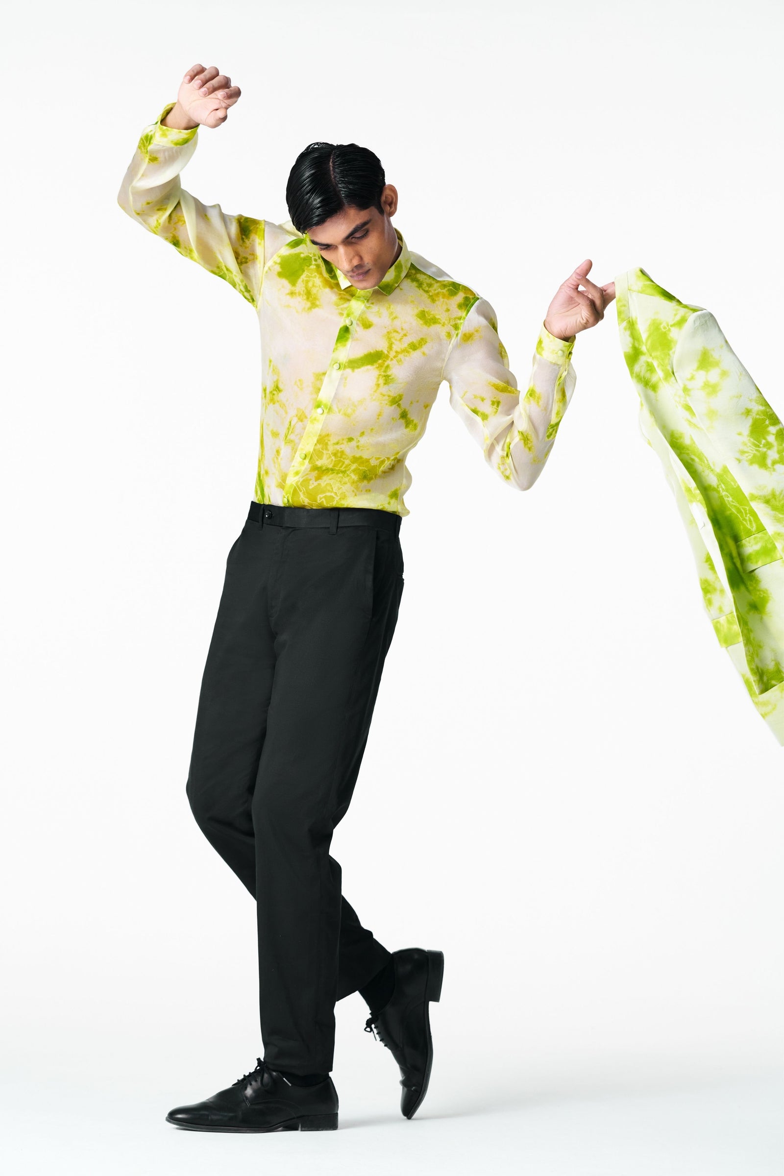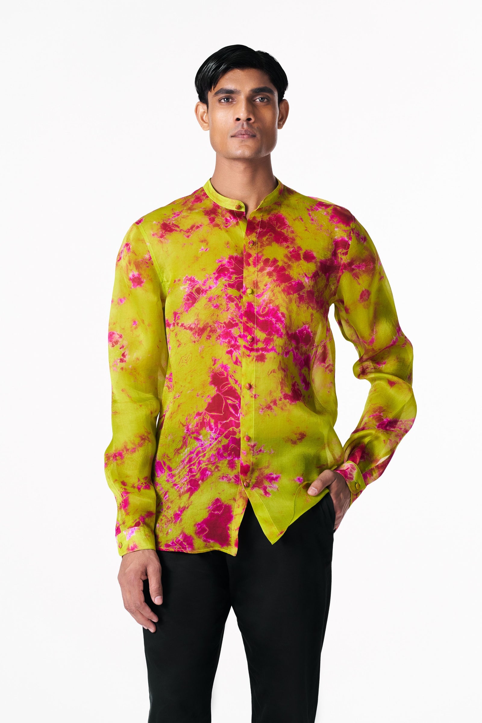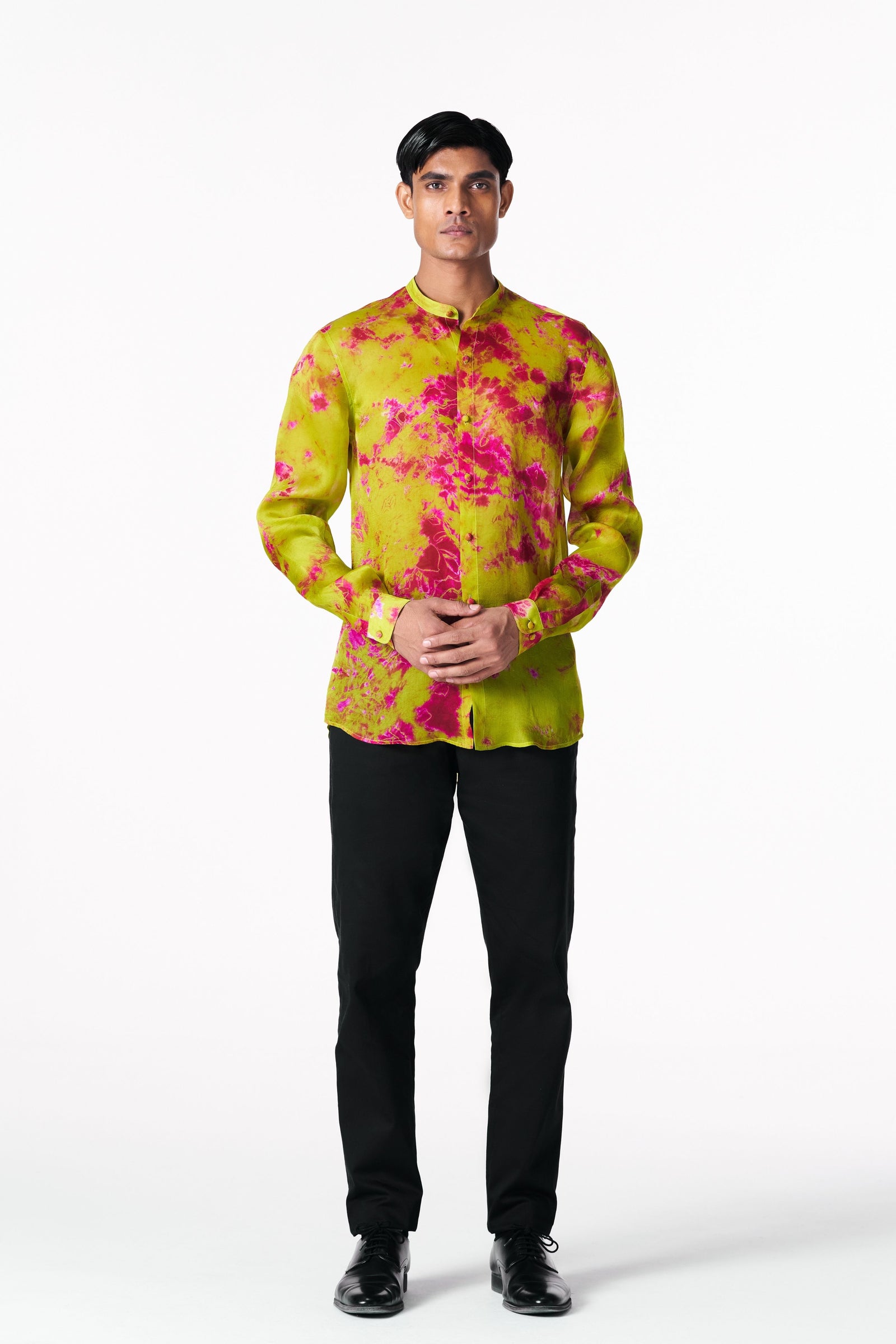 • Slim fit shirt in chartreuse dews hand-dyed surface design. Crafted in luxurious silk with inside seams thoroughly piped in satin. The shirt comes with self fabric buttons, shirt collar and two-buttoned cuffs.