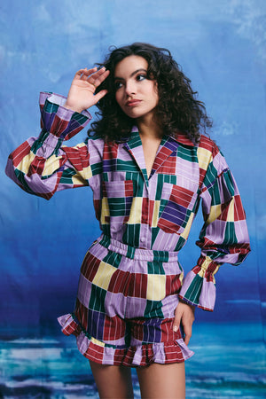 • The matching shorts have ruffles at the bottom and continue the patchwork pattern of the shirt, creating a cohesive and playful ensemble.