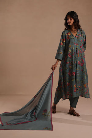 • A chanderi stole in blue, adorned with contrasting magenta floral motifs. Versatile and elegant, perfect to style with roza outfits. The Dupatta length-95'' and the Dupatta width-32''