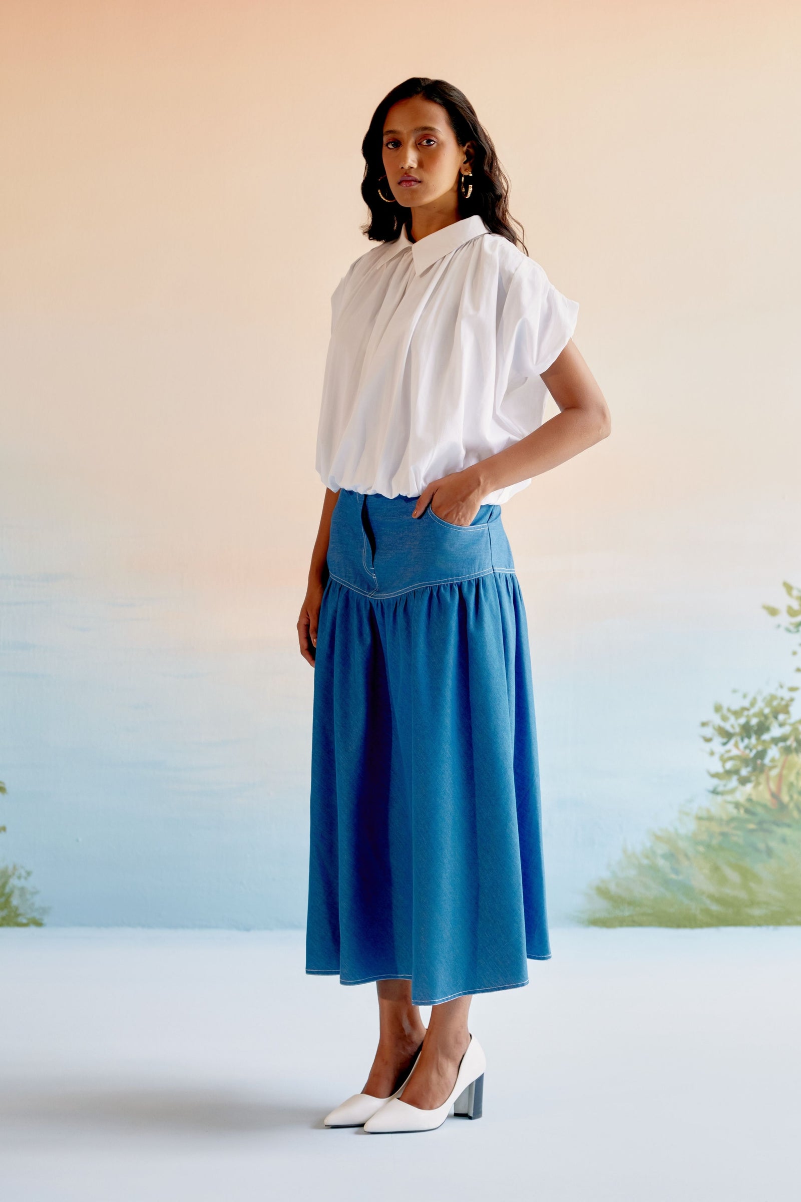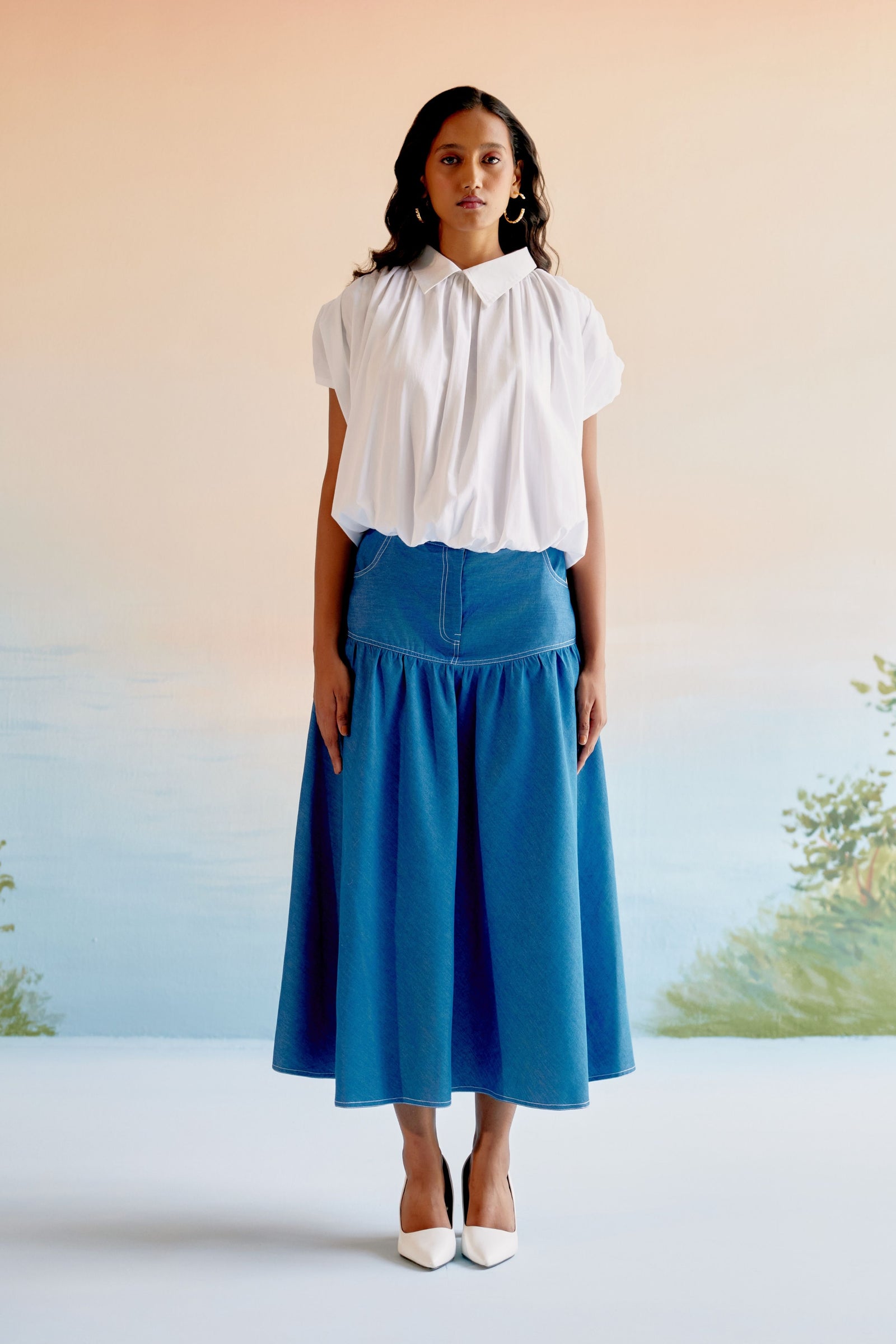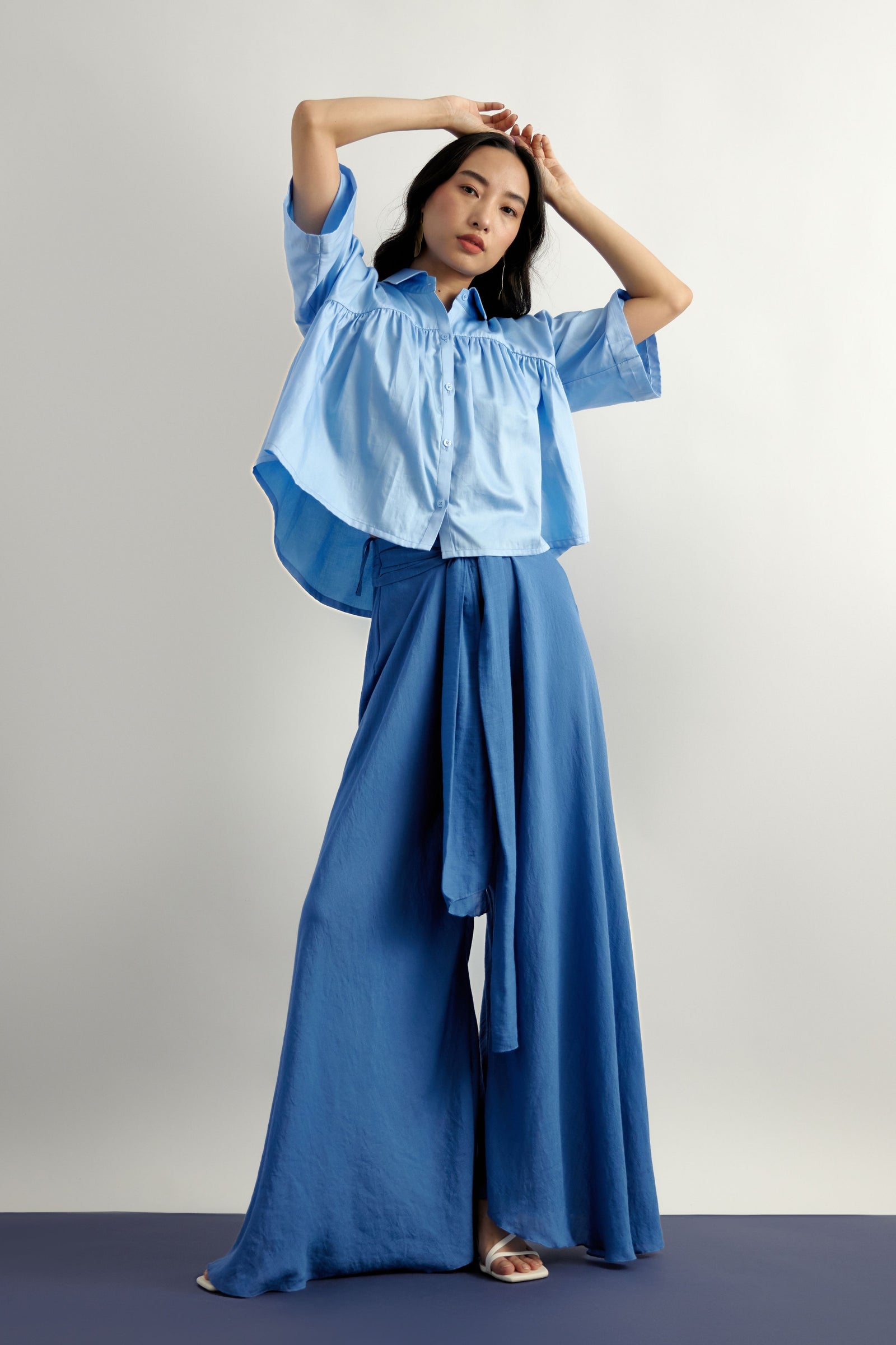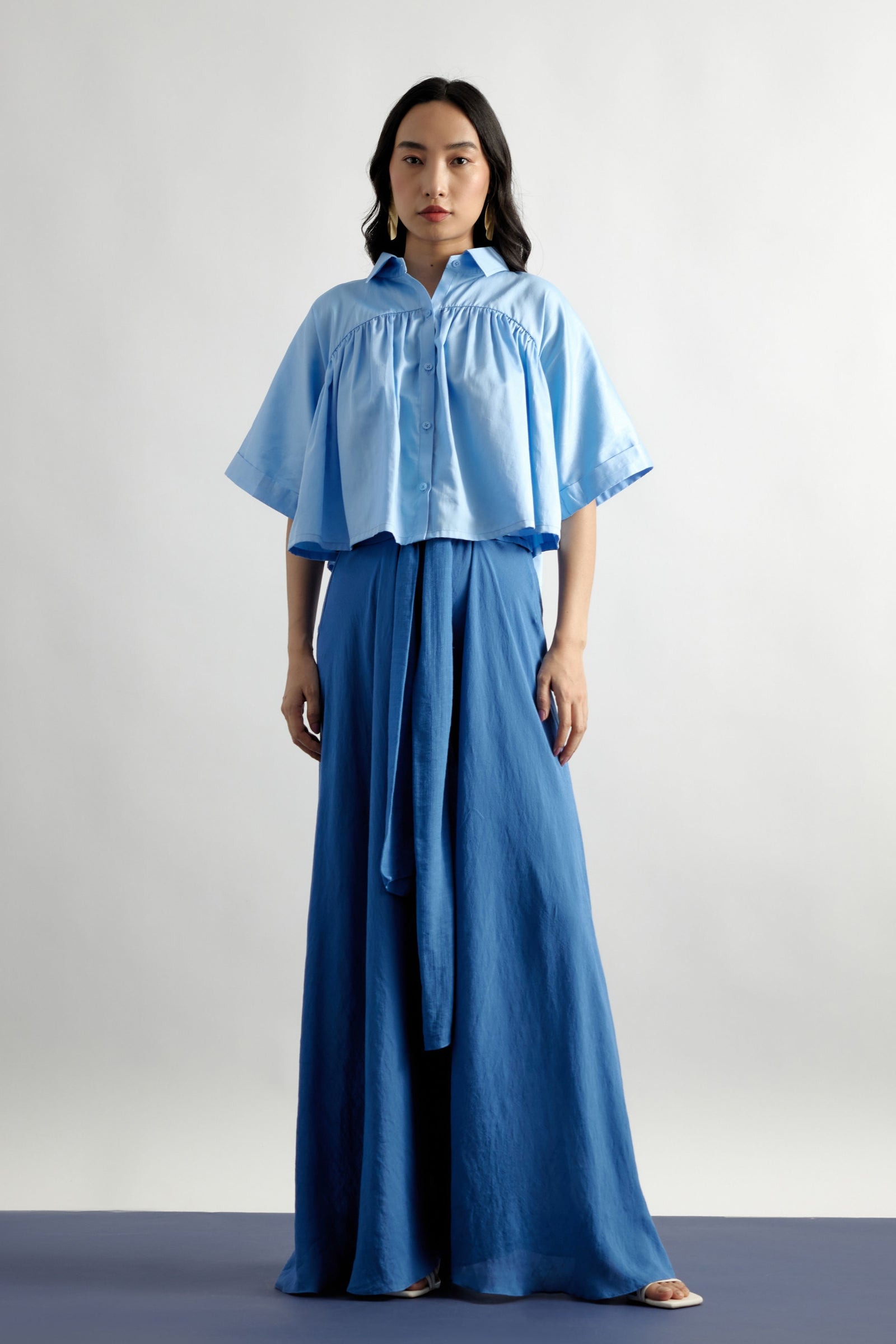 • Echo blue cropped shirt is crafted in cotton satin. This well tailored, collared button down is gathered from the shoulder down . The shirt is loose fit , perfect for the summer . It is easy to wear and pair this easy breezy shirt .Looks best with our flared pants in a complementing tone of blue .