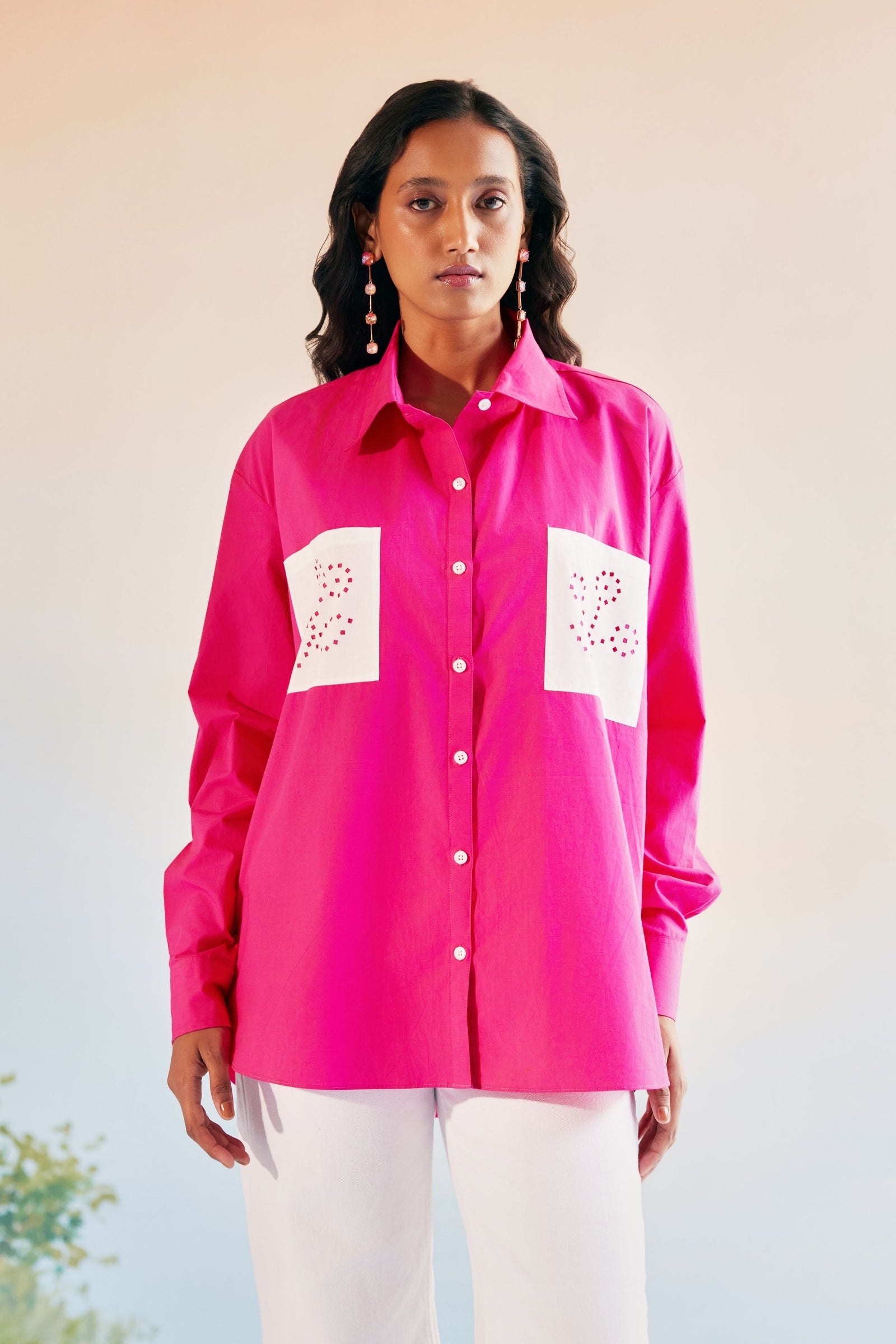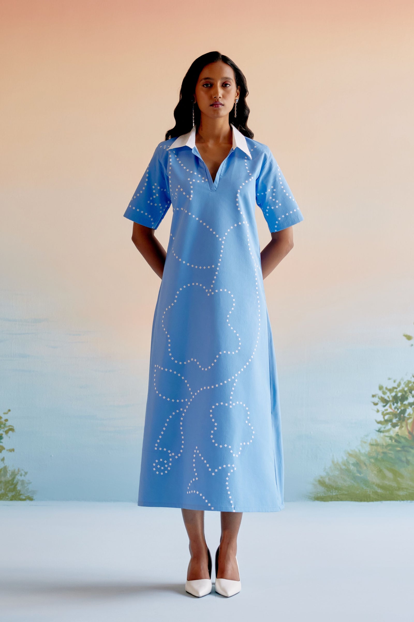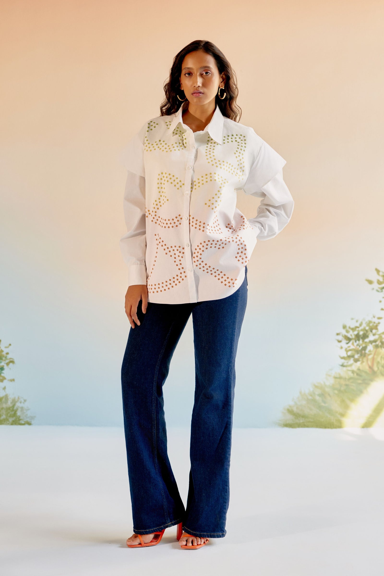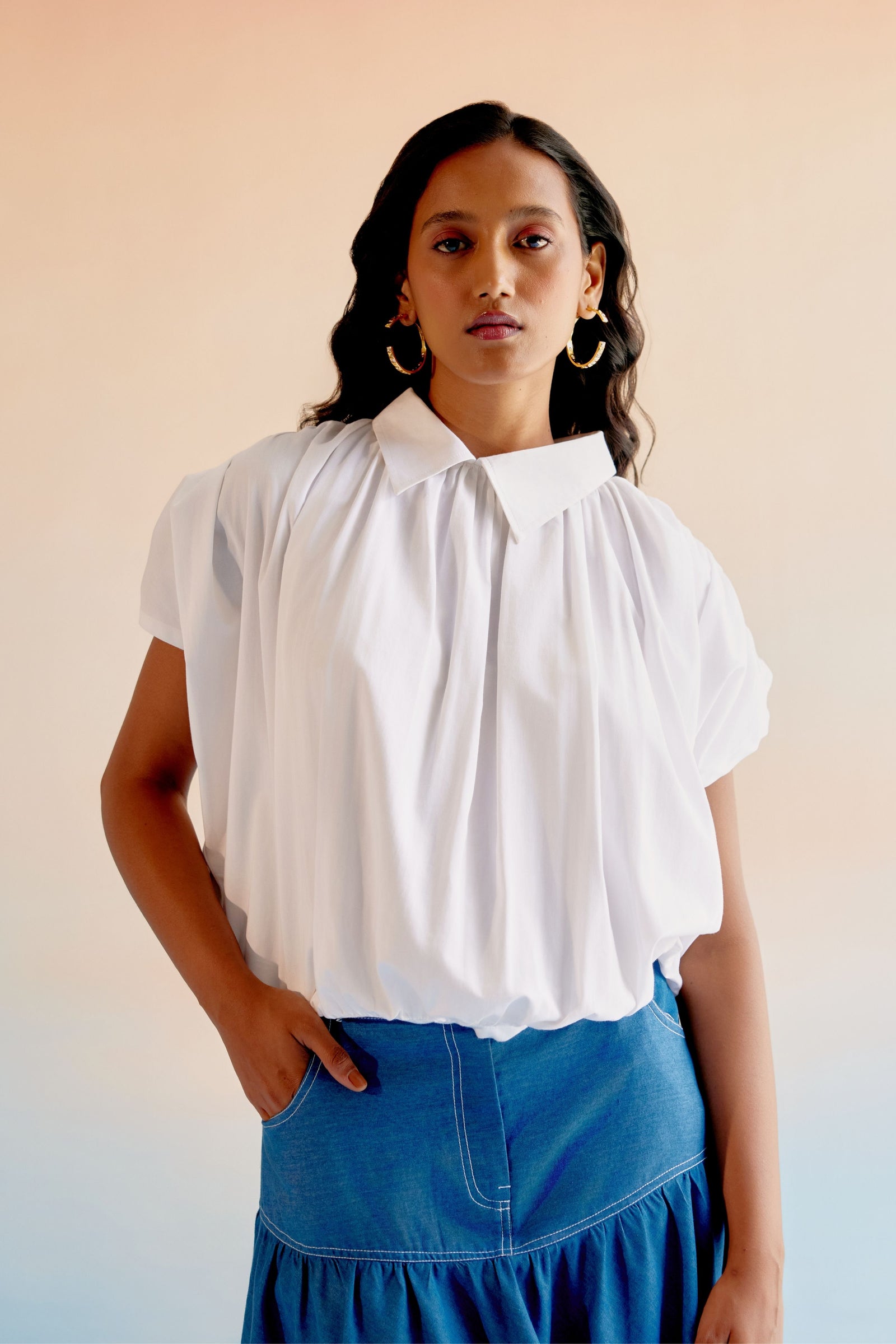 • Echo blue cropped shirt is crafted in cotton satin. This well tailored, collared button down is gathered from the shoulder down . The shirt is loose fit , perfect for the summer . It is easy to wear and pair this easy breezy shirt .Looks best with our flared pants in a complementing tone of blue .