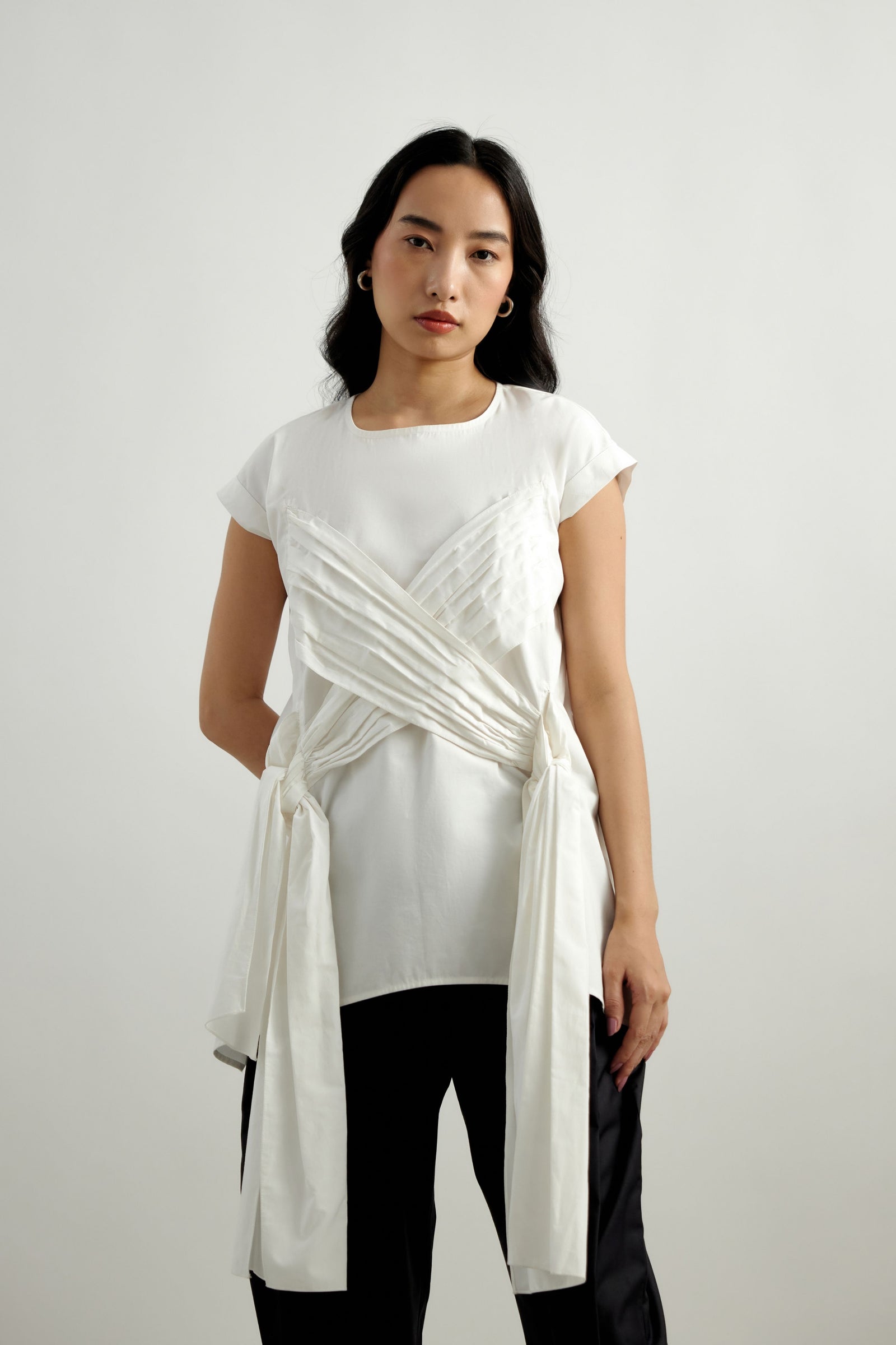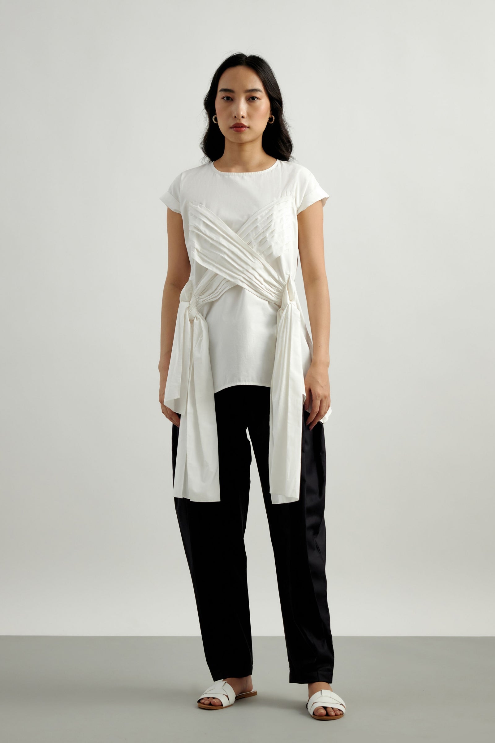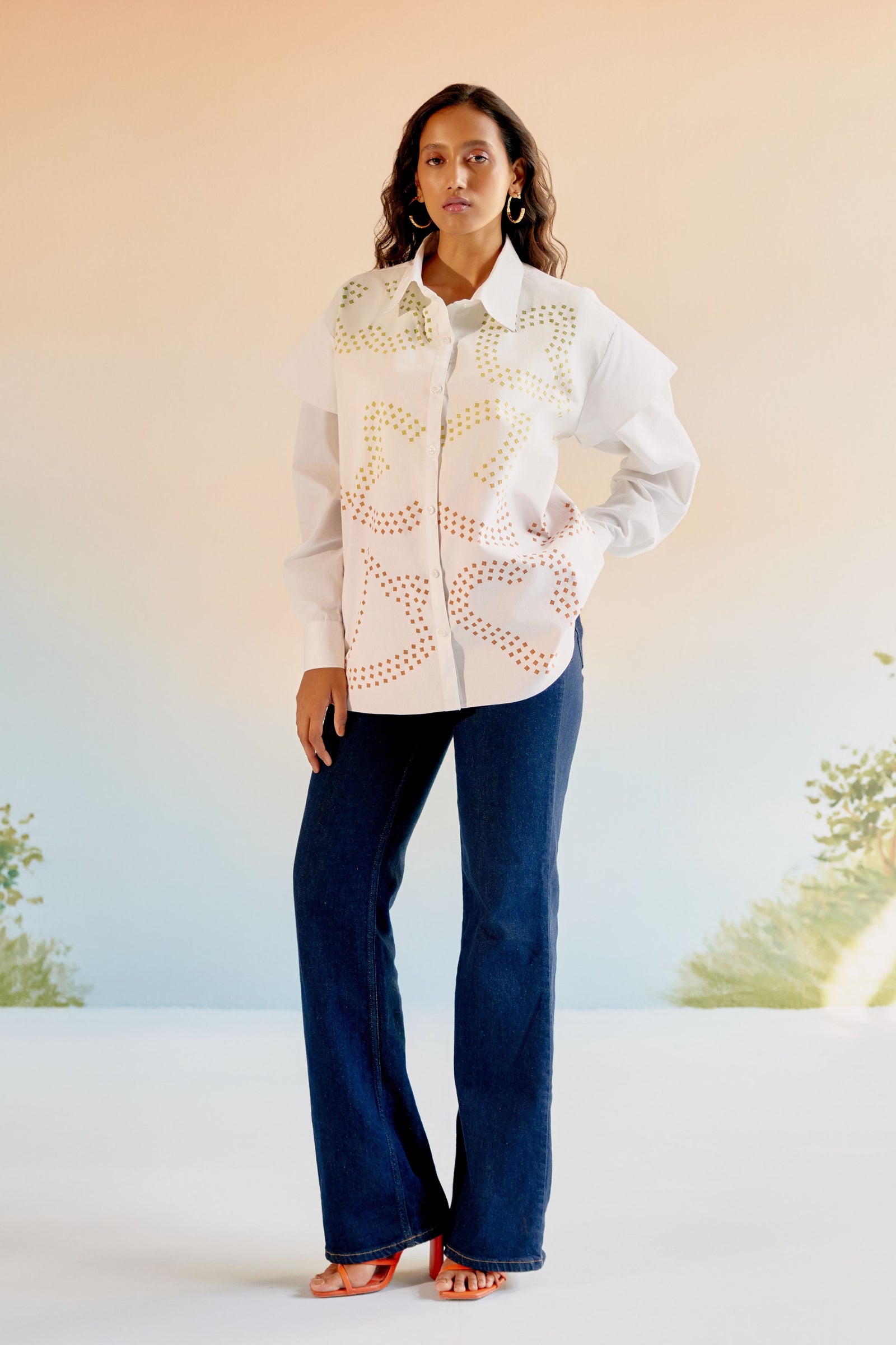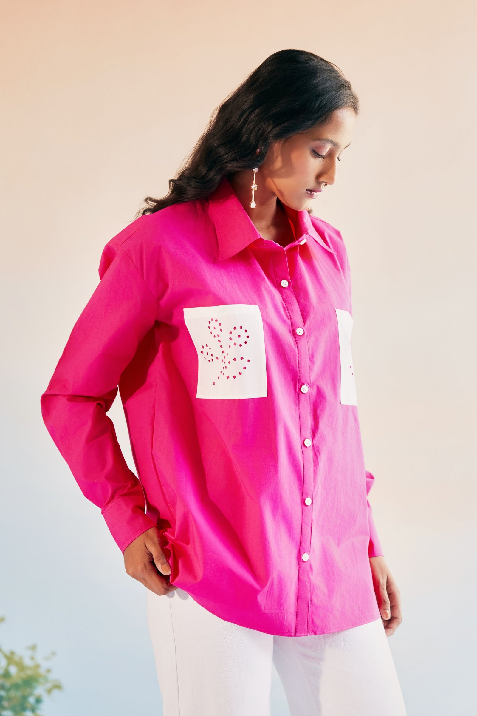 • Echo blue cropped shirt is crafted in cotton satin. This well tailored, collared button down is gathered from the shoulder down . The shirt is loose fit , perfect for the summer . It is easy to wear and pair this easy breezy shirt .Looks best with our flared pants in a complementing tone of blue .
