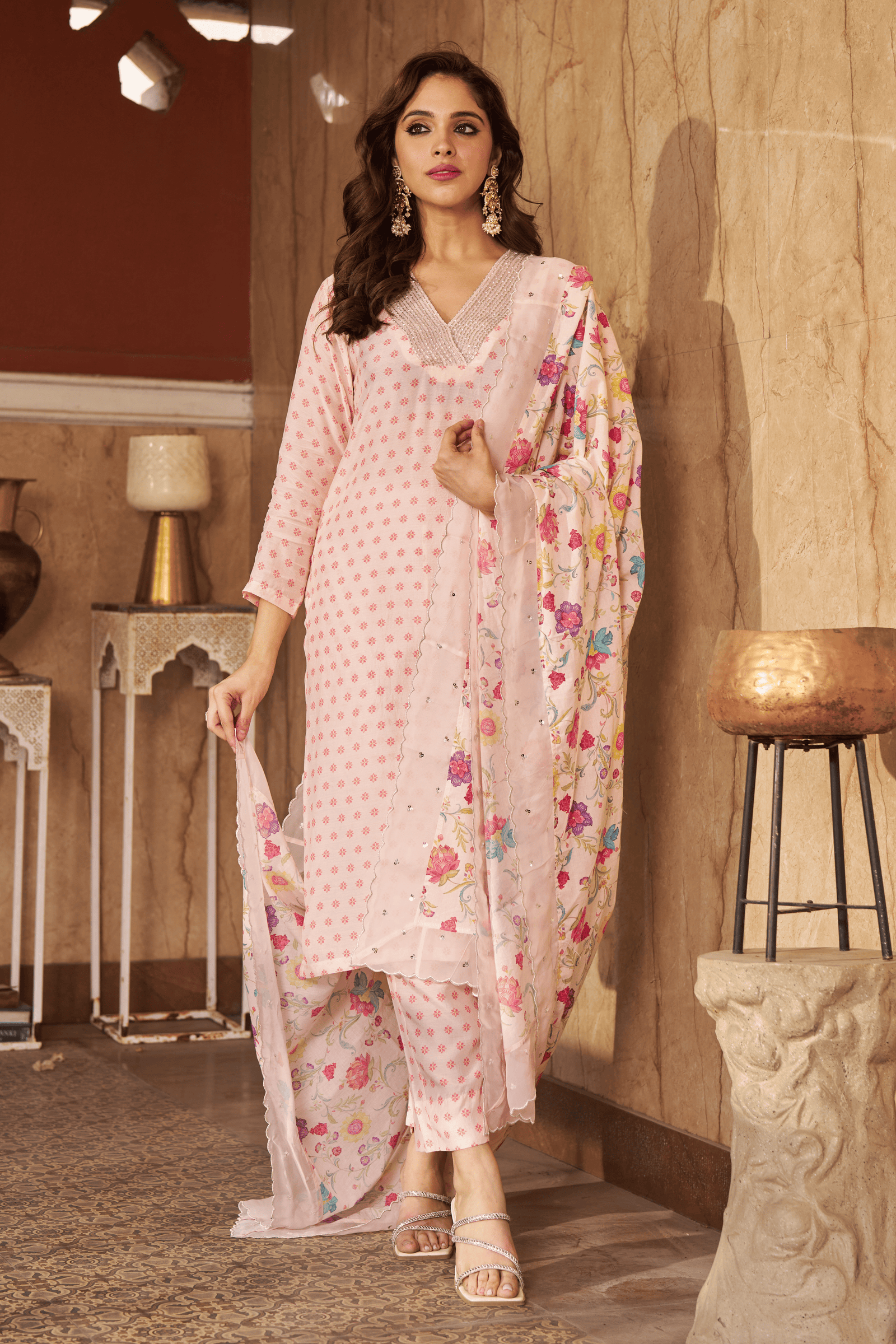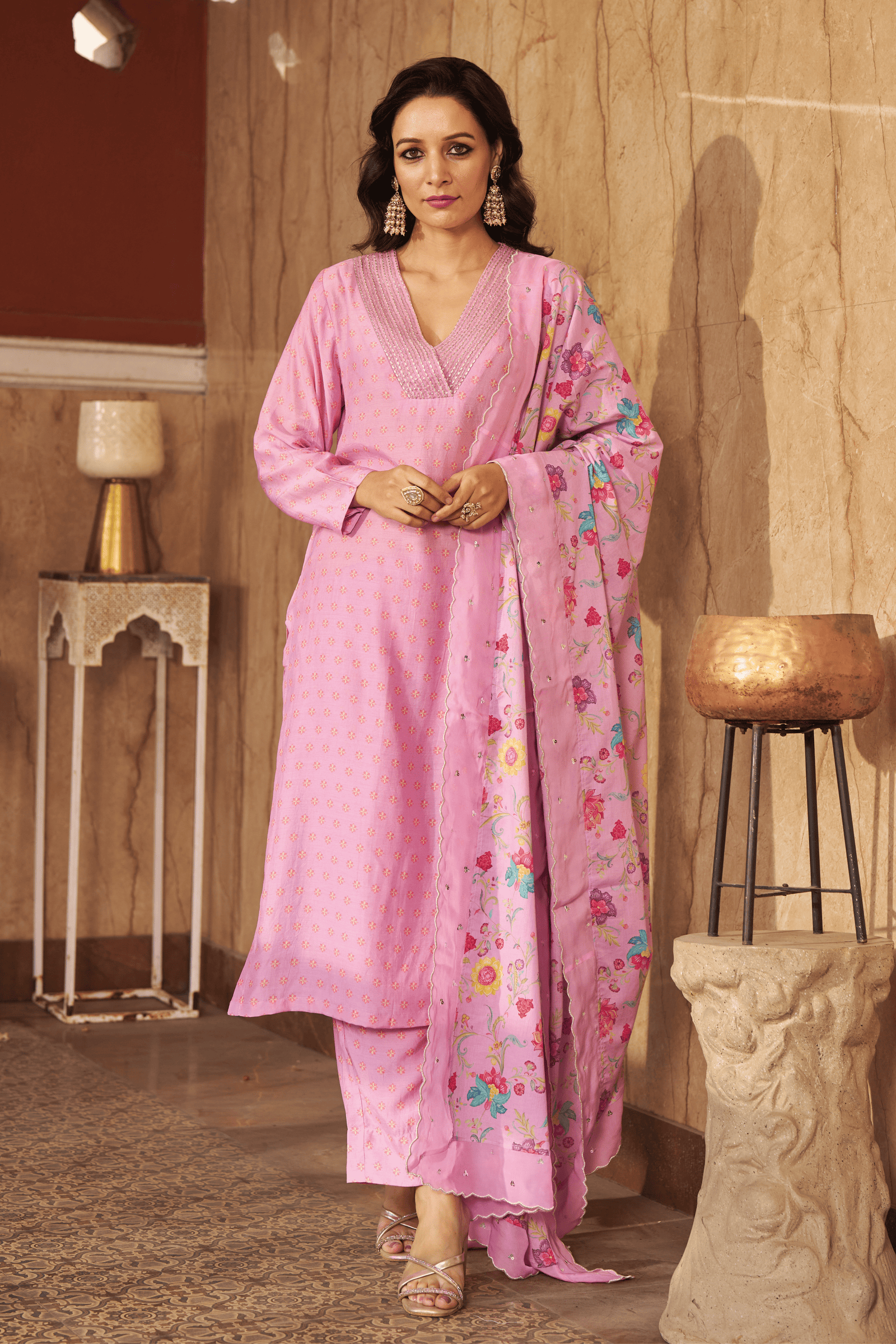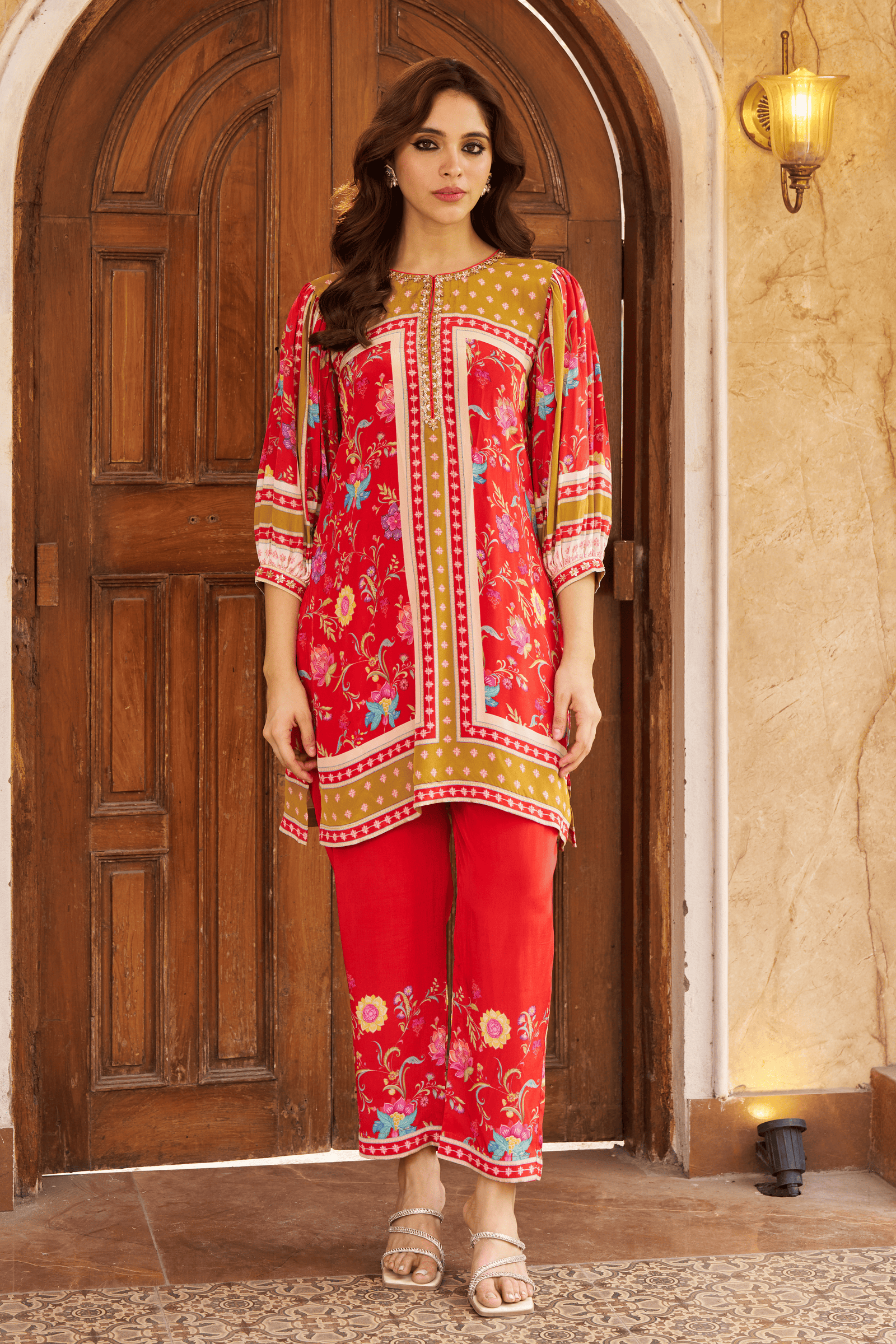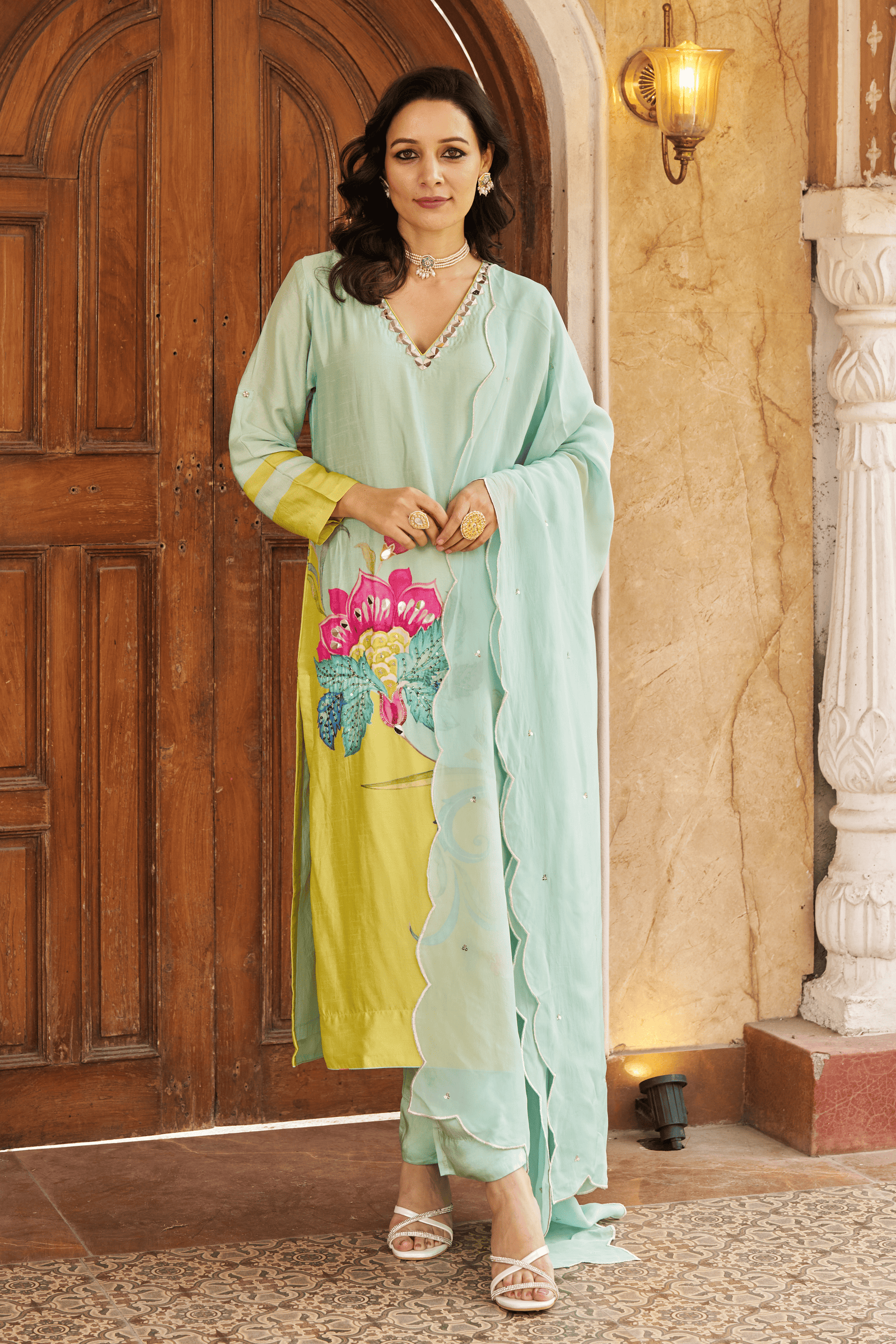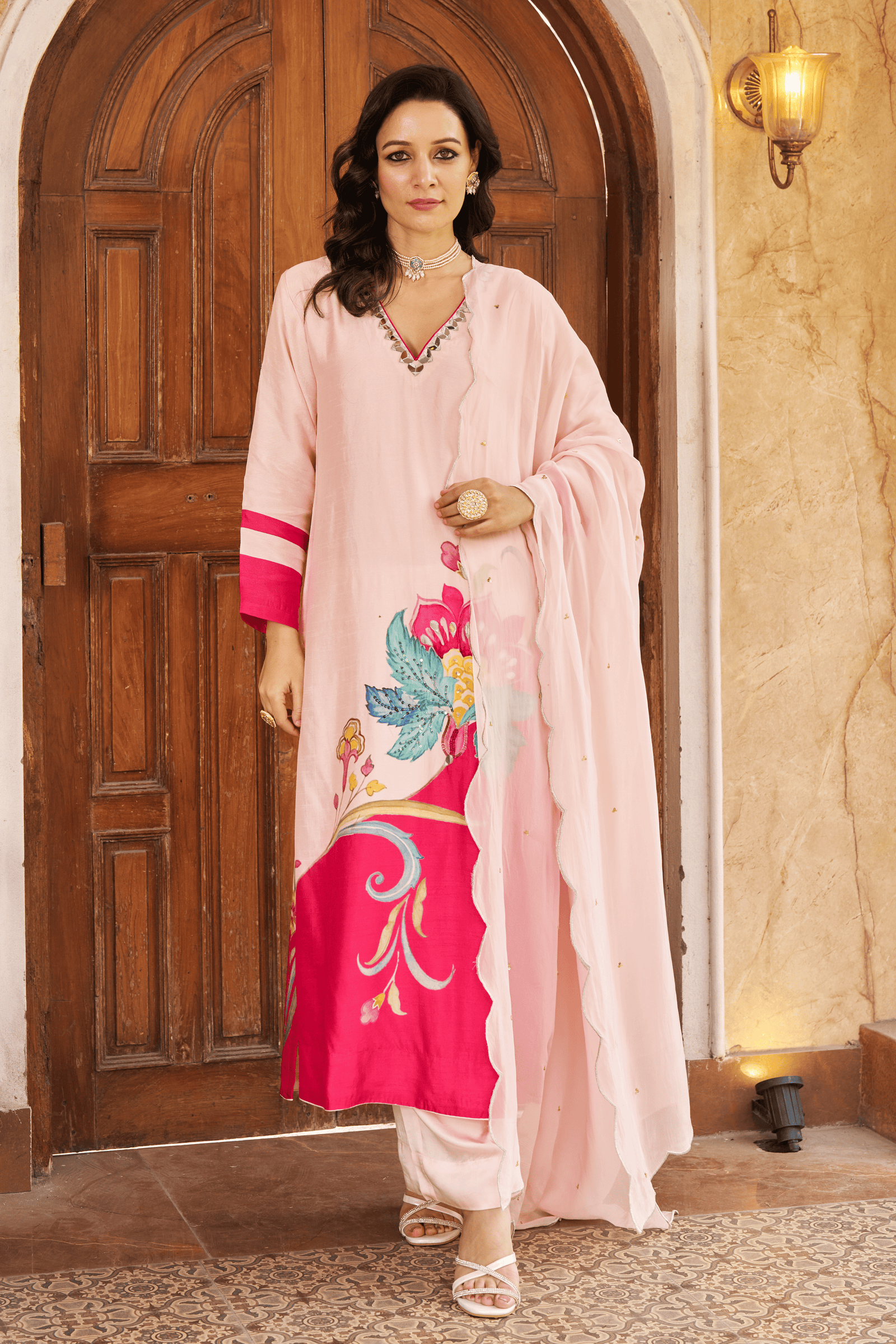 • Exquisite bloom kaftan set, crepe kaftan kurta with pearl work on neckline paired with crape pants with applique gota embroidery.