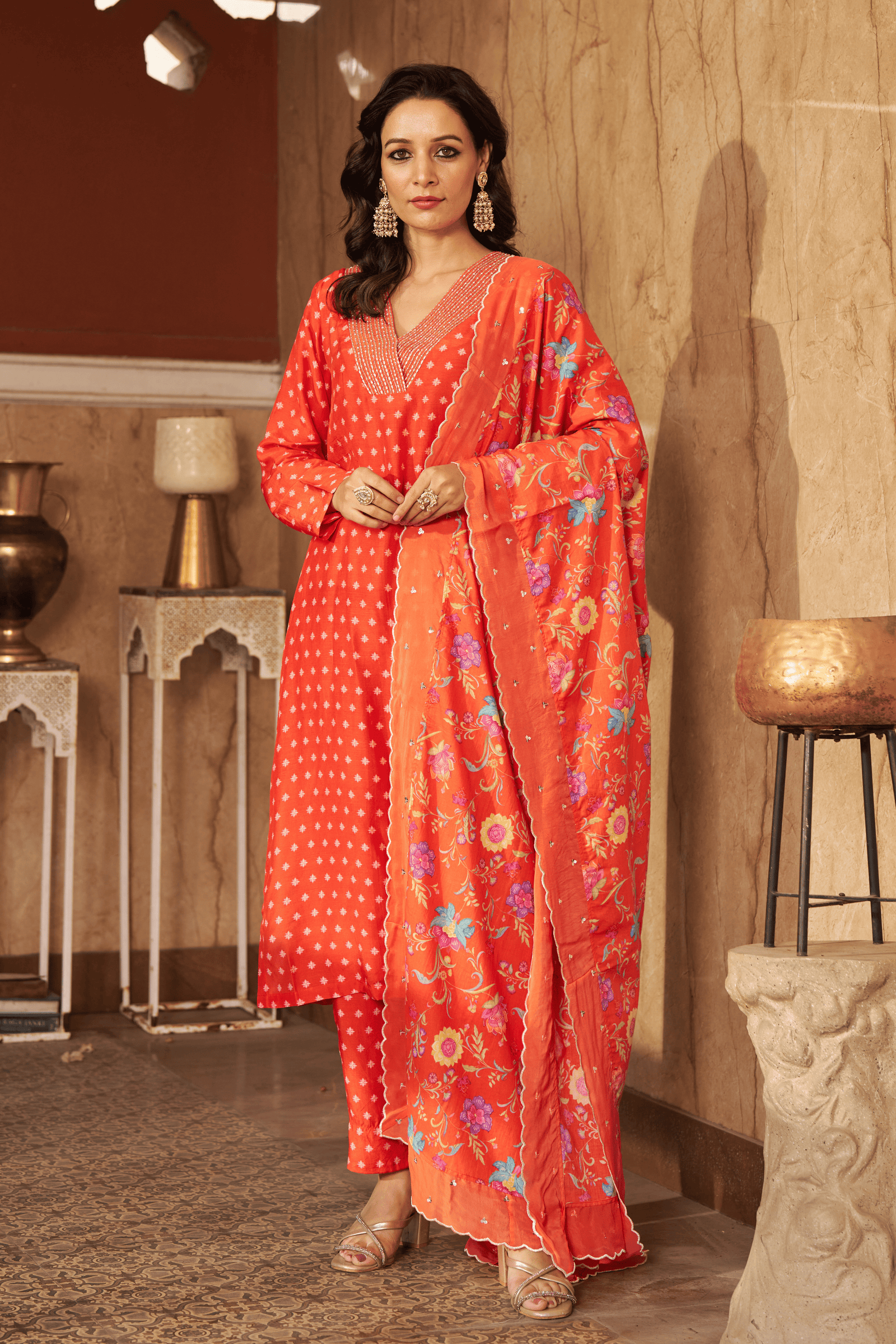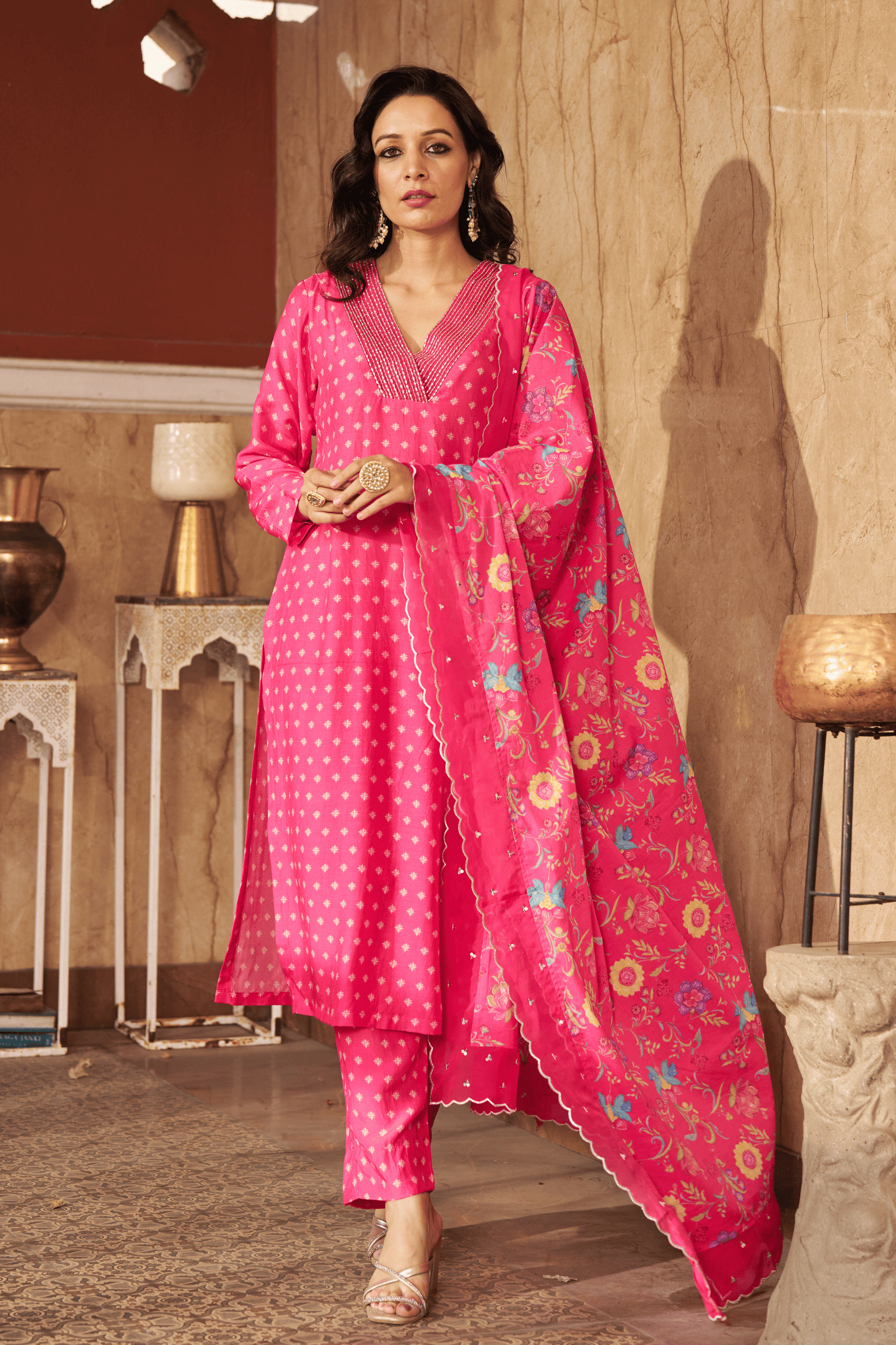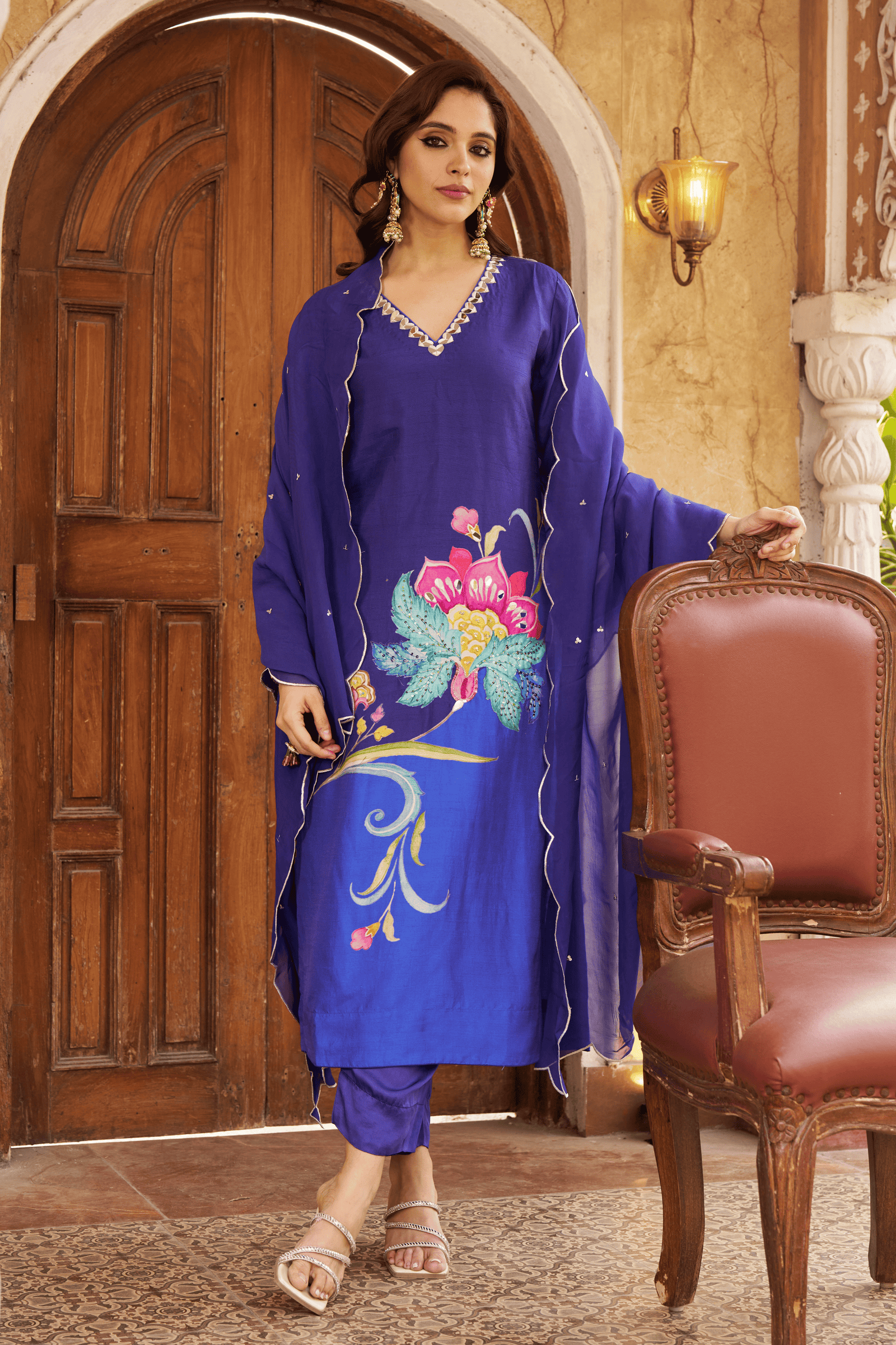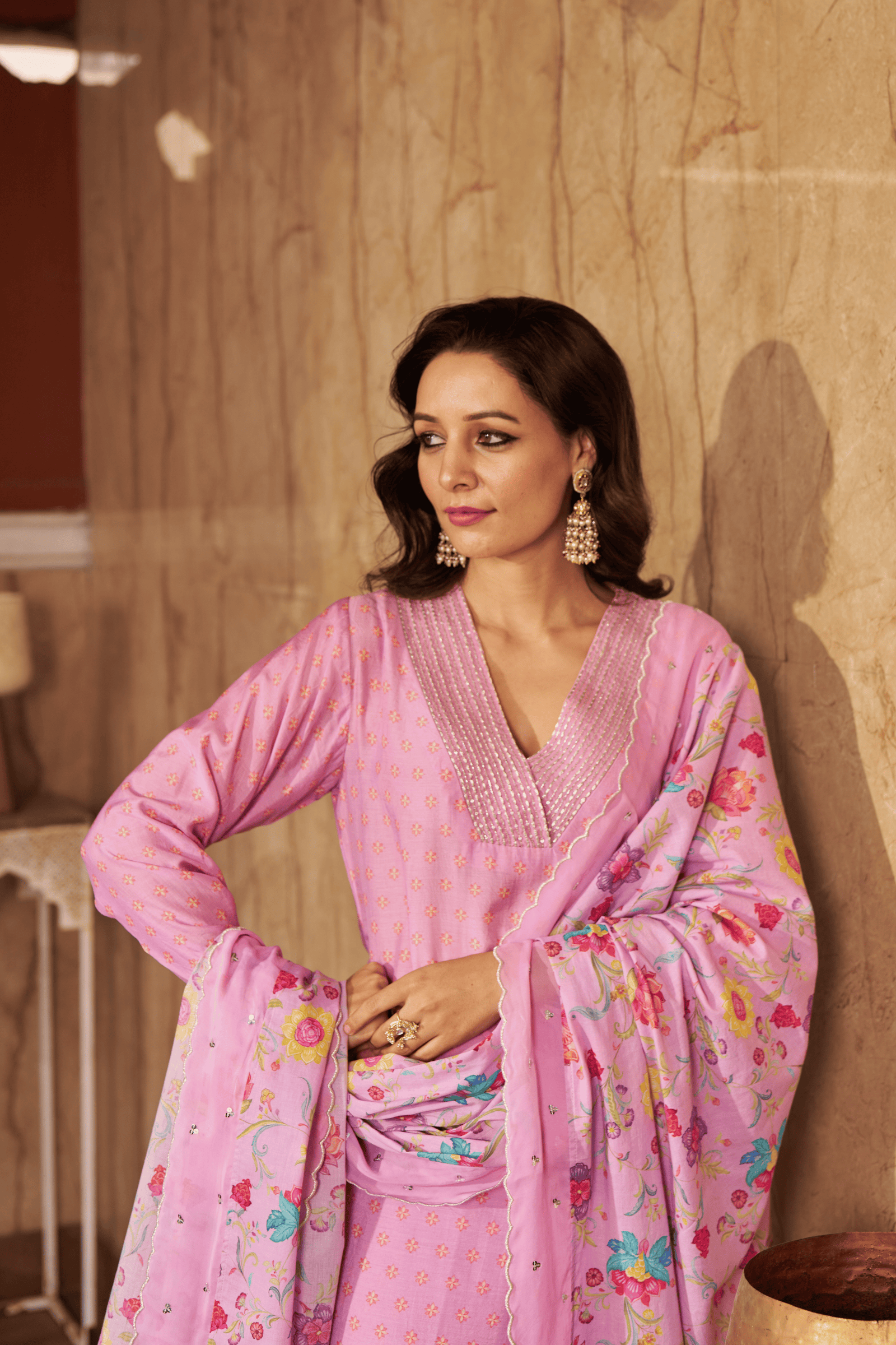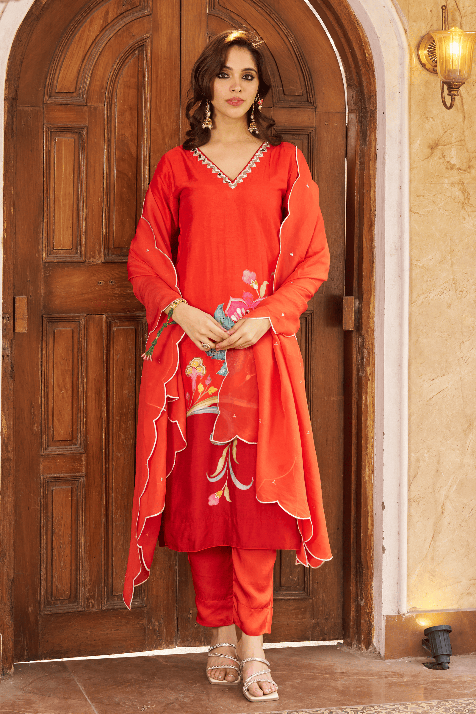 • Exquisite bloom kaftan set, crepe kaftan kurta with pearl work on neckline paired with crape pants with applique gota embroidery.