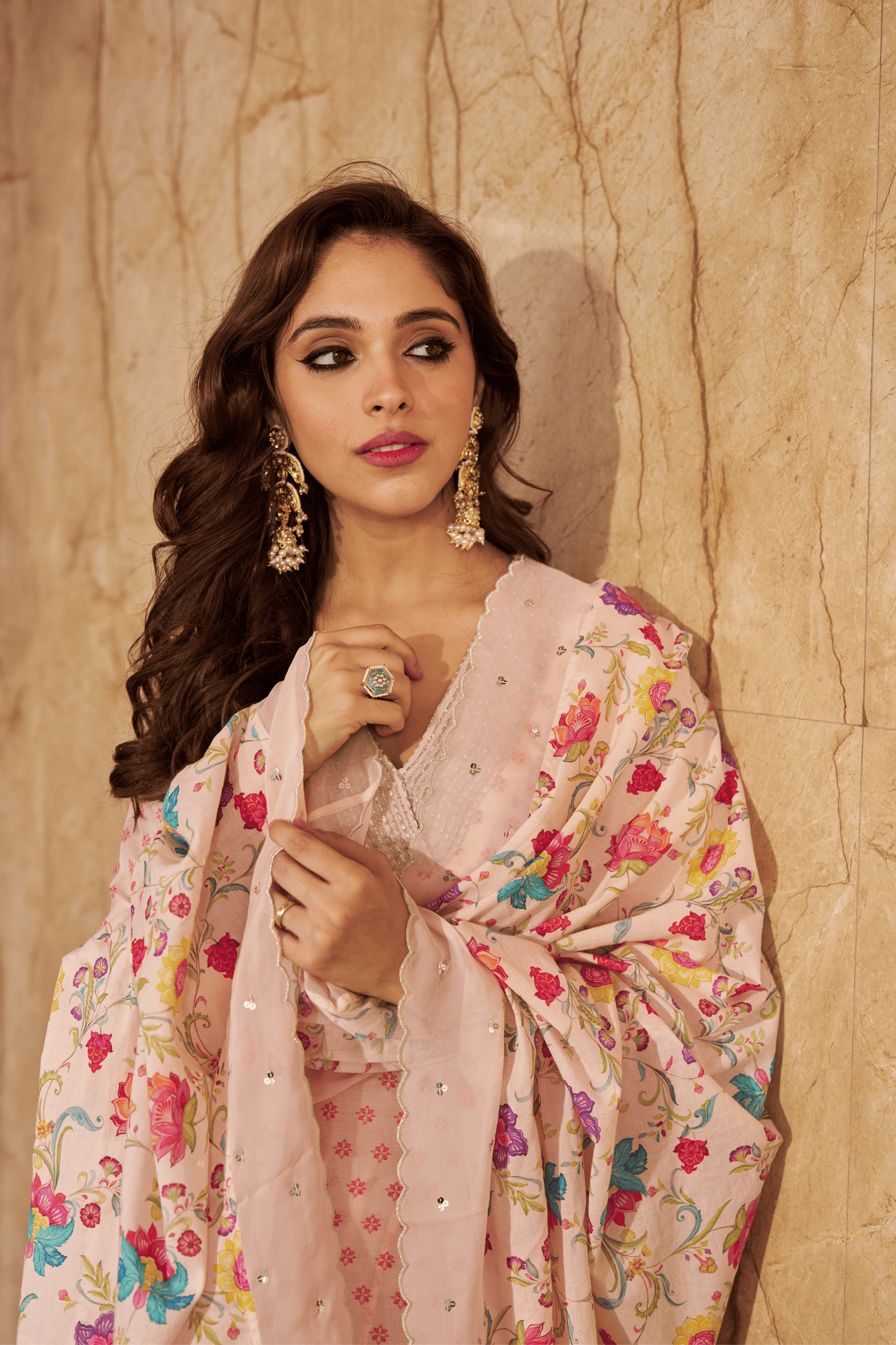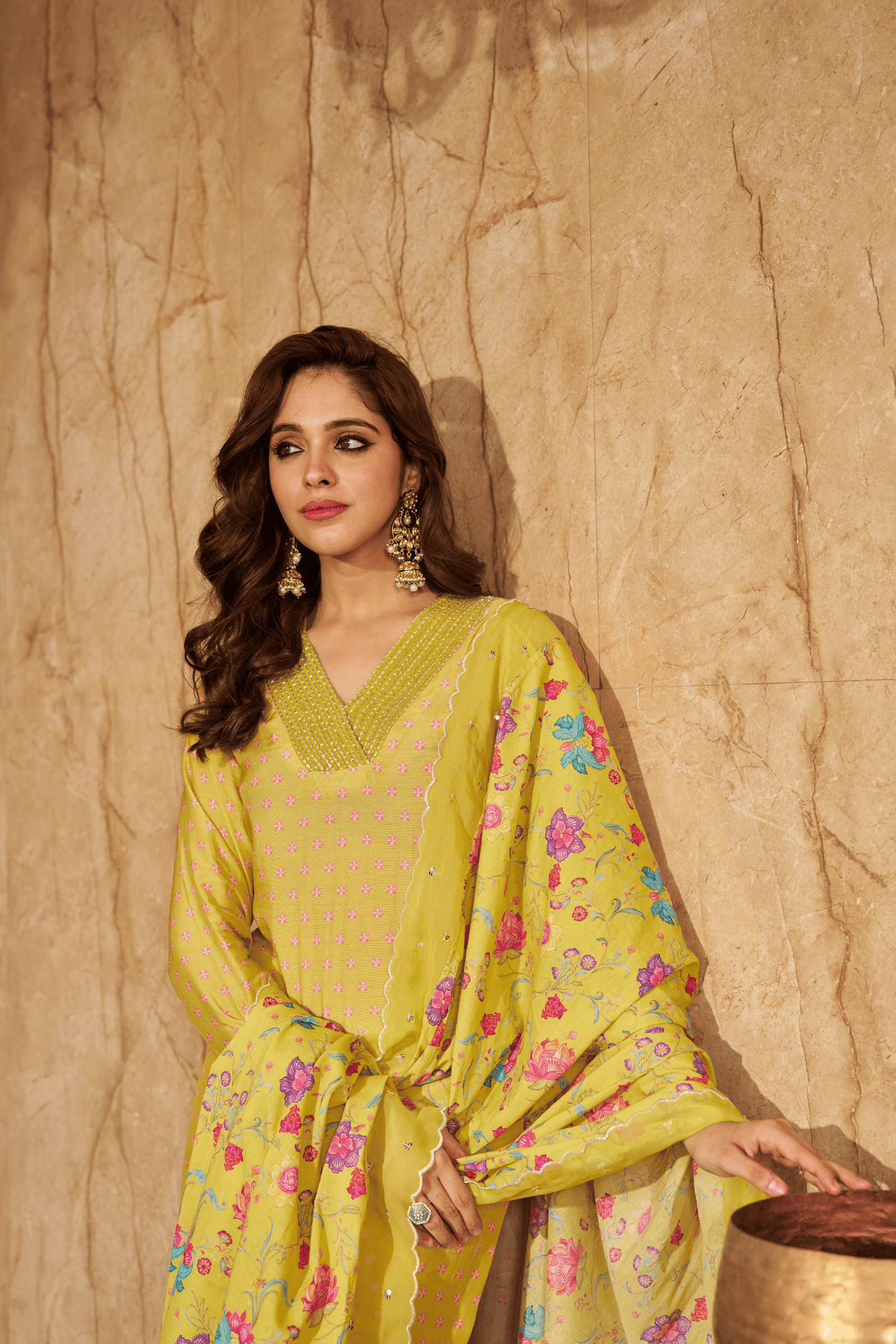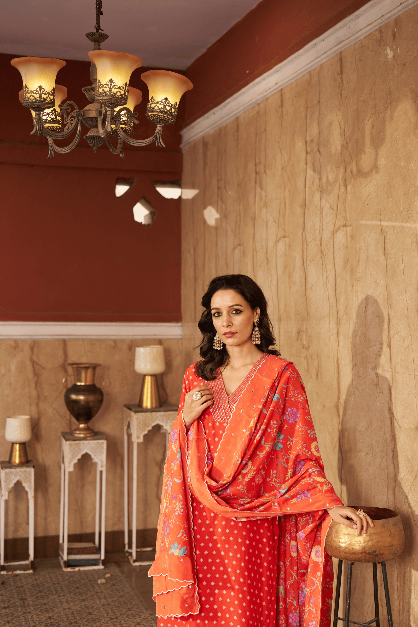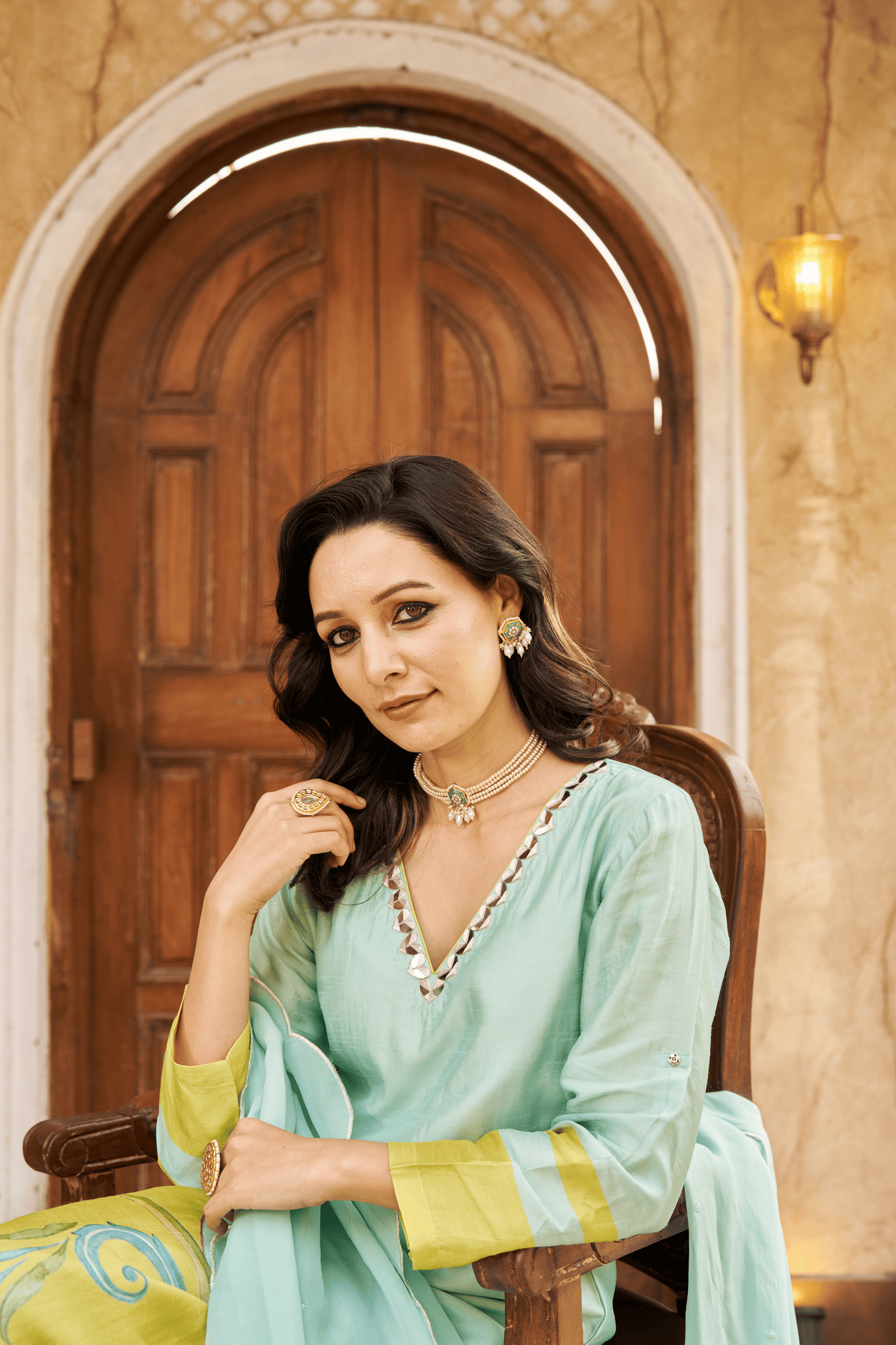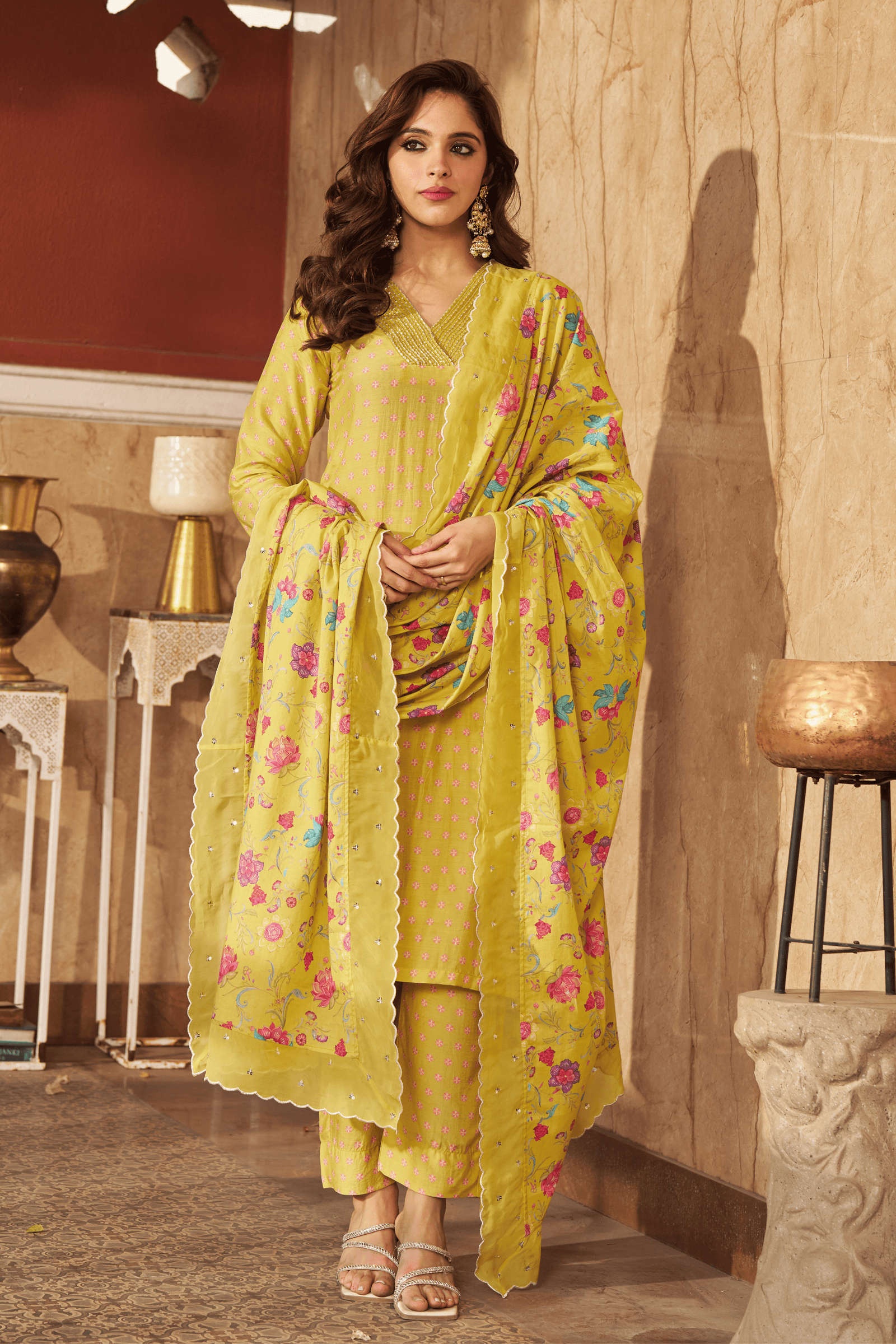 • Exquisite bloom kaftan set, crepe kaftan kurta with pearl work on neckline paired with crape pants with applique gota embroidery.