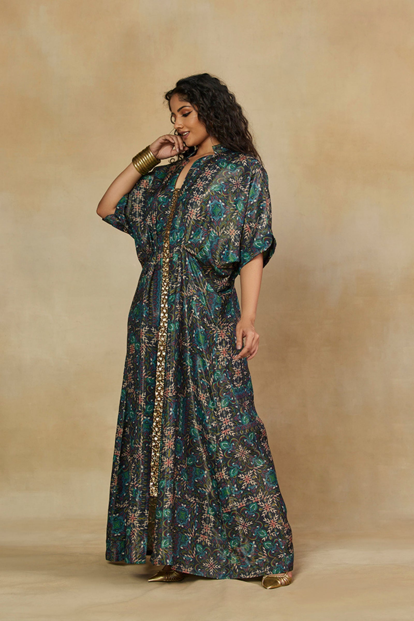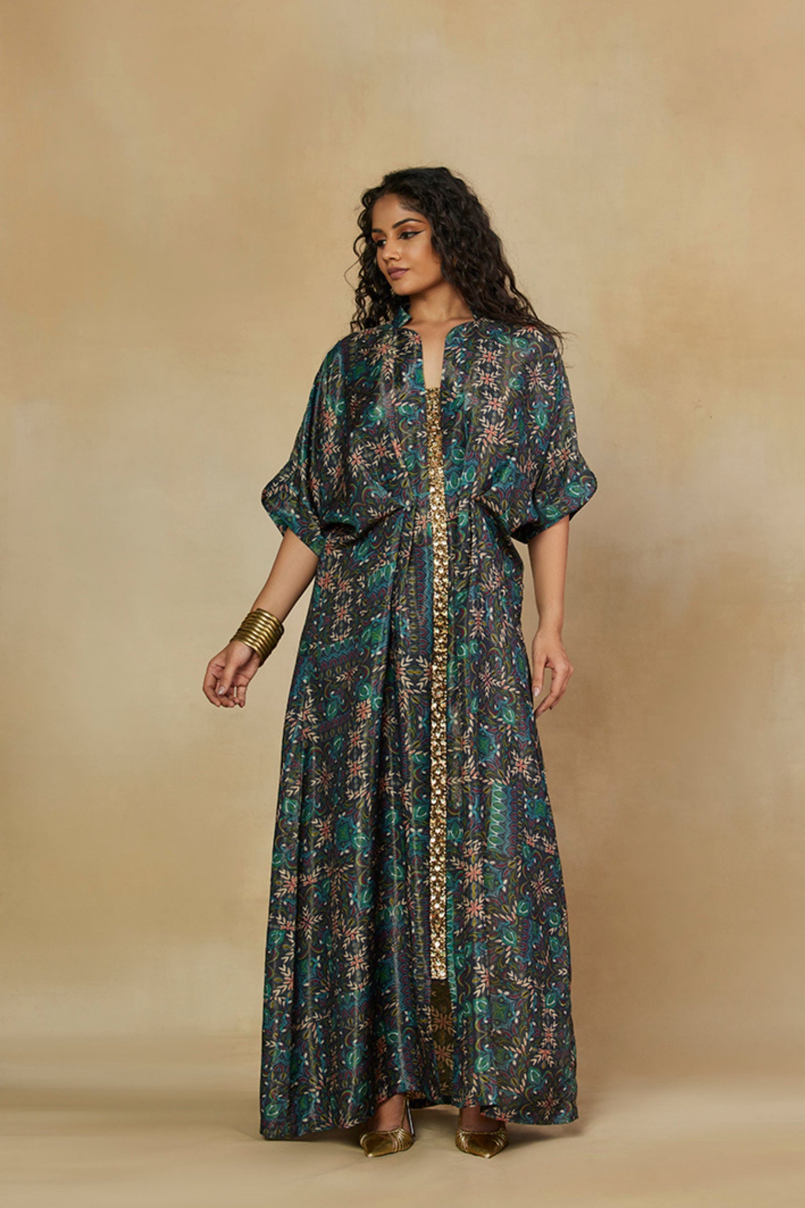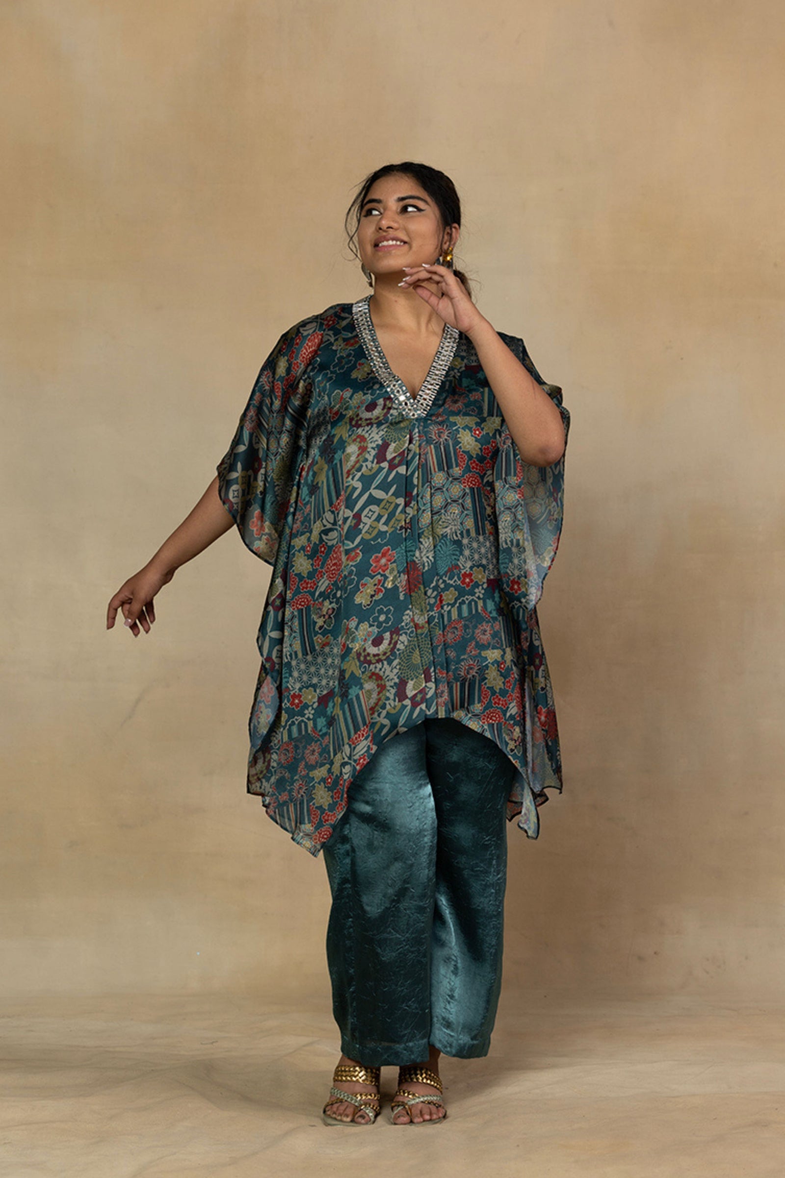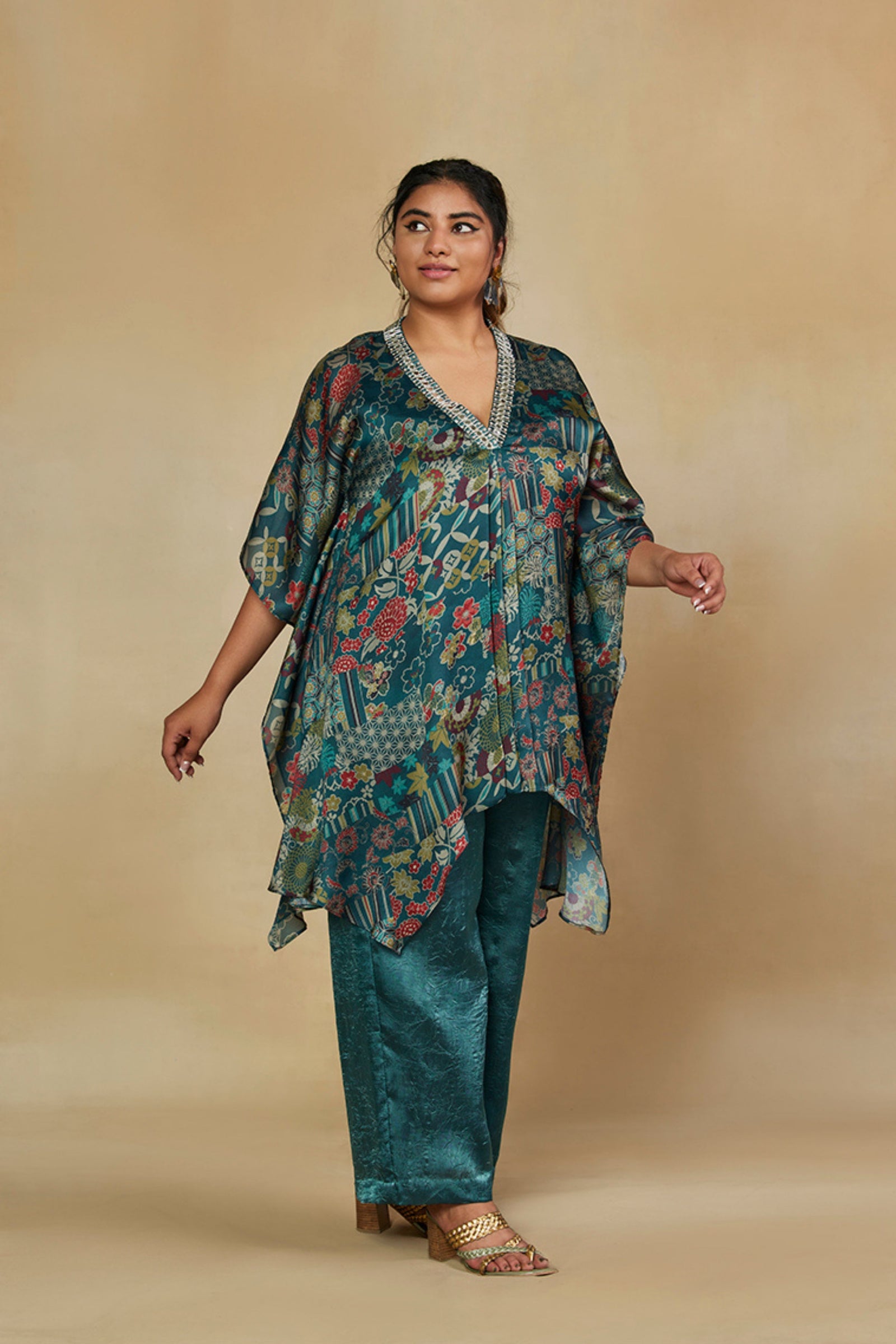 • Get occasion ready in our Green Printed V-Neck Party Wear Co-ord Set. With a relaxed silhouette and an embroidered accent on the neckline, it has tie-knot style kaftan sleeves and is paired with straight pants that will have you turning heads all evening long.