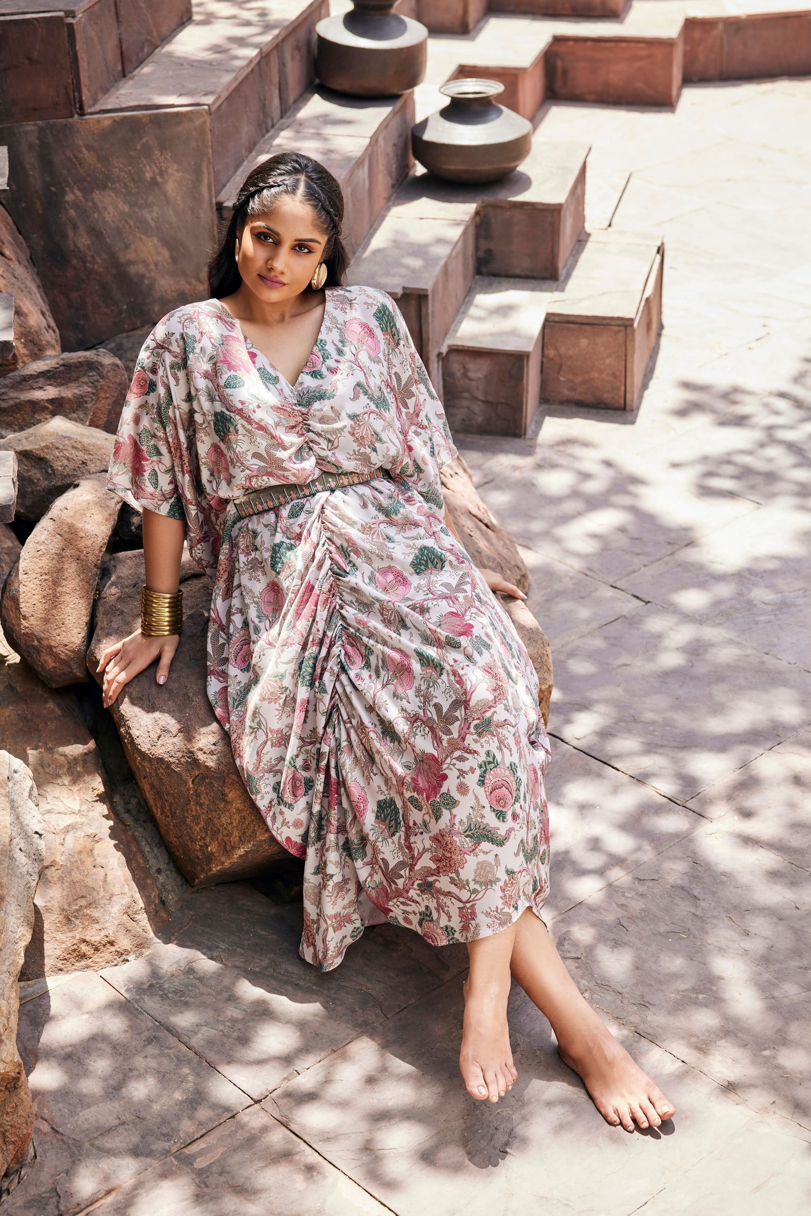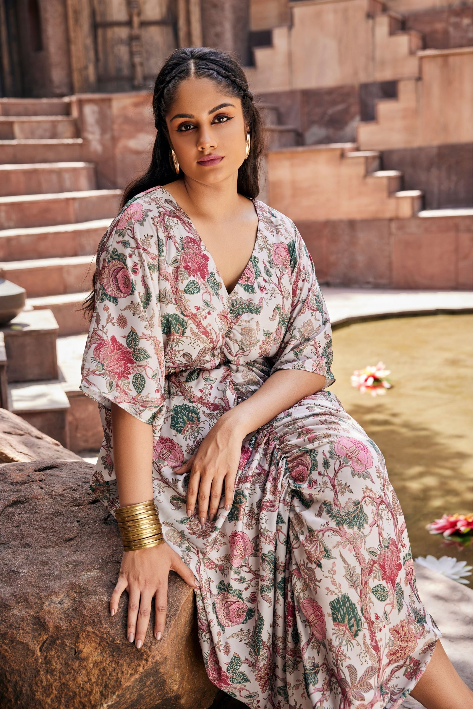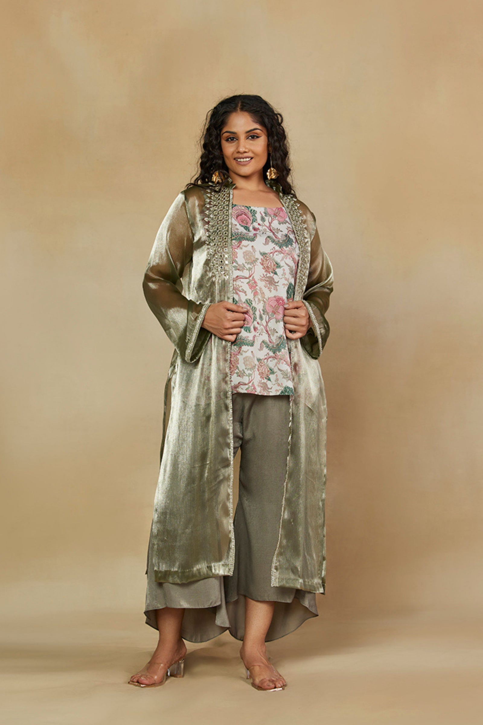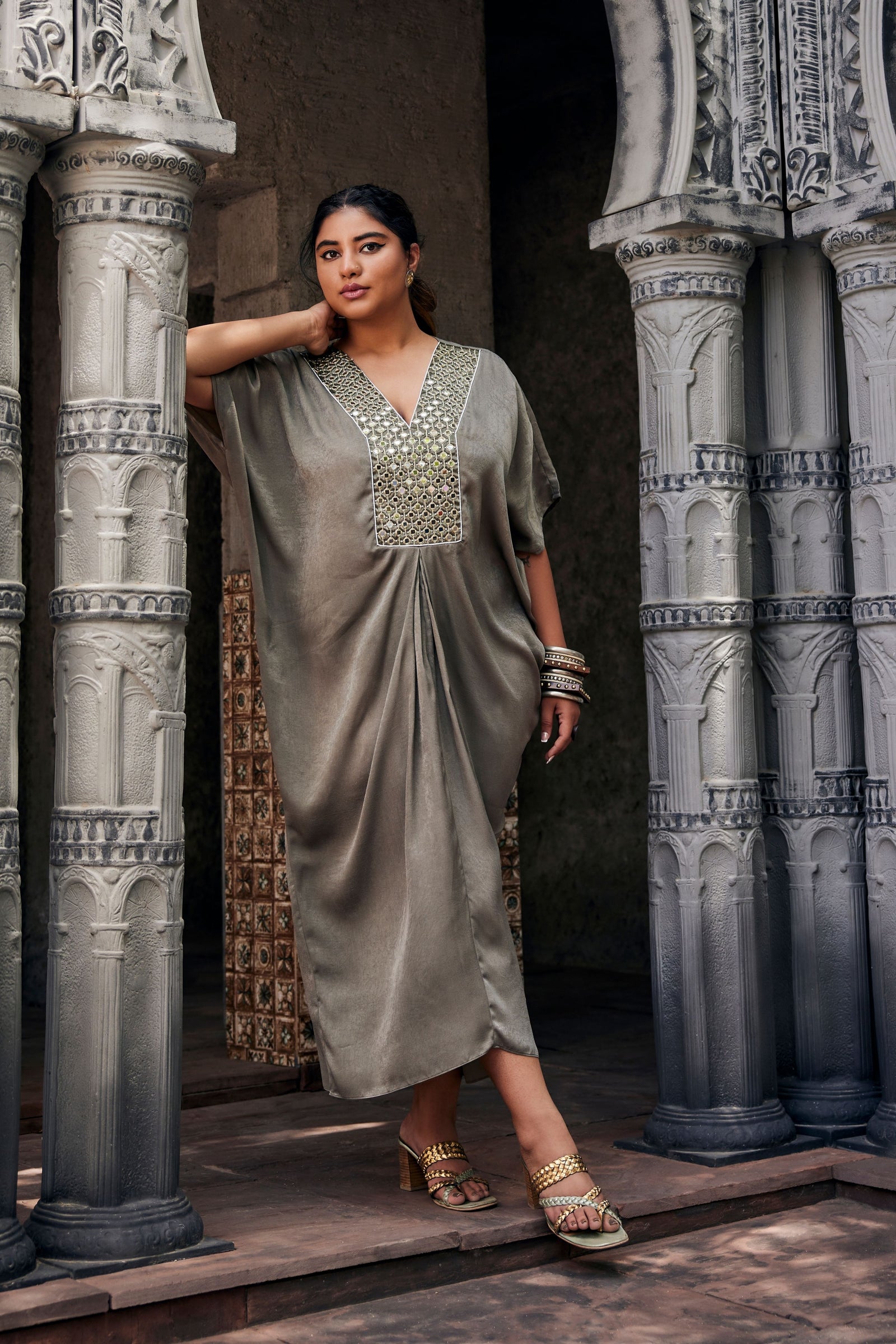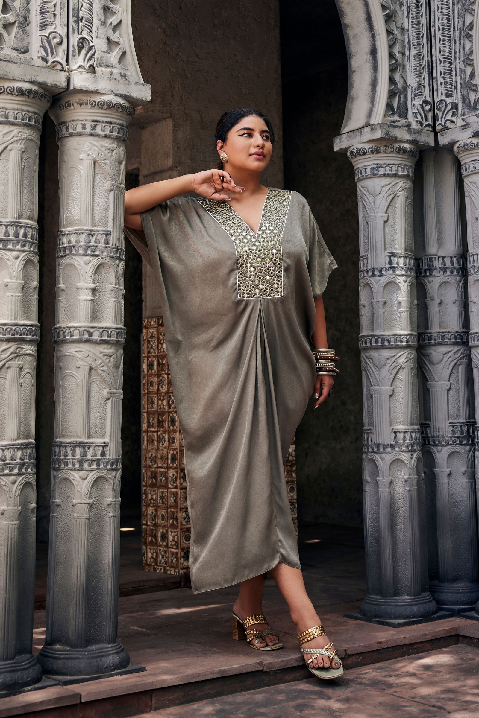 • Get occasion ready in our Green Printed V-Neck Party Wear Co-ord Set. With a relaxed silhouette and an embroidered accent on the neckline, it has tie-knot style kaftan sleeves and is paired with straight pants that will have you turning heads all evening long.