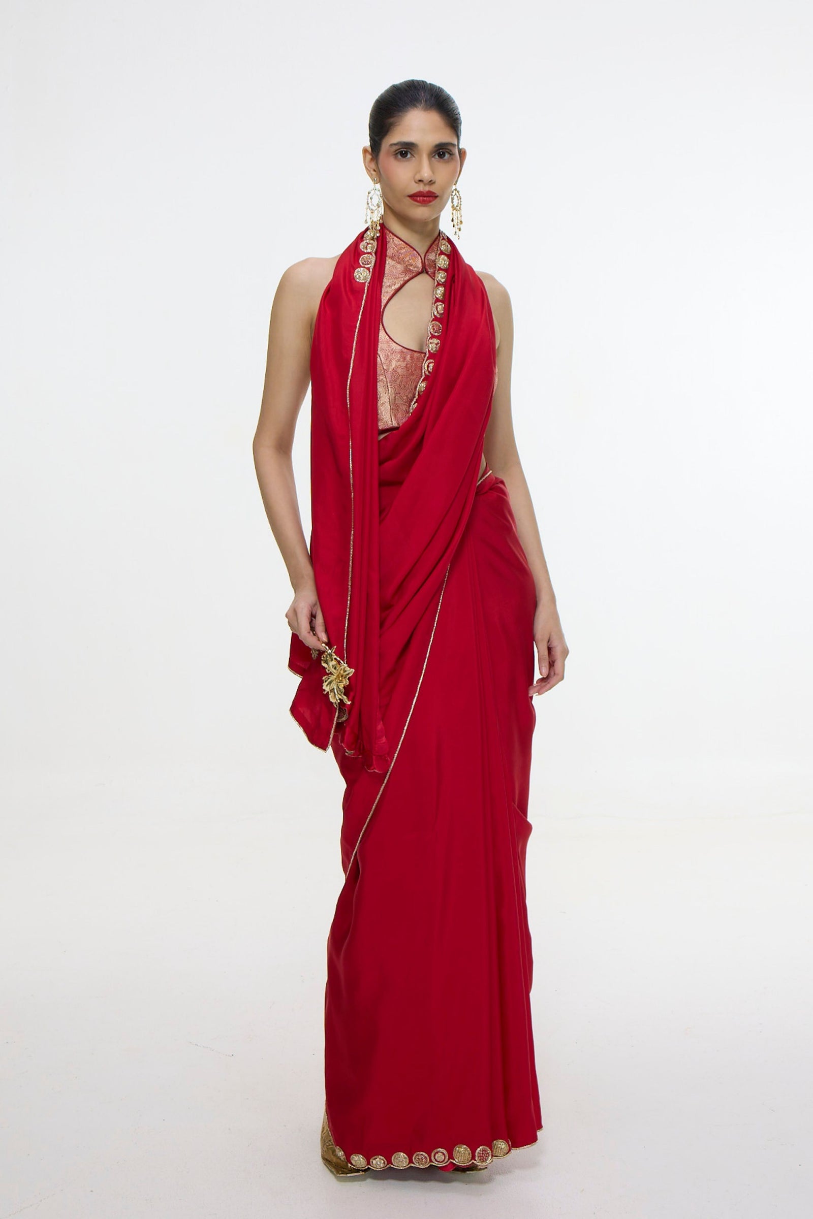 • An easy-to-drape, transeasonal saree in Scarlet Red that can seamlessly flow from your everyday outfit to evening celebrations. Play up the lightweight silk with a statement blouse or a tonal cape for a striking ensemble that commands attention. The saree comes with an unstitched blouse fabric. The saree comes with a fall & hemming.