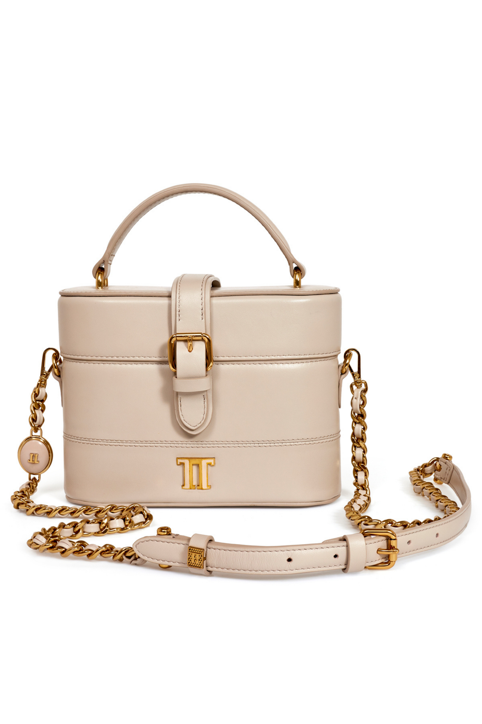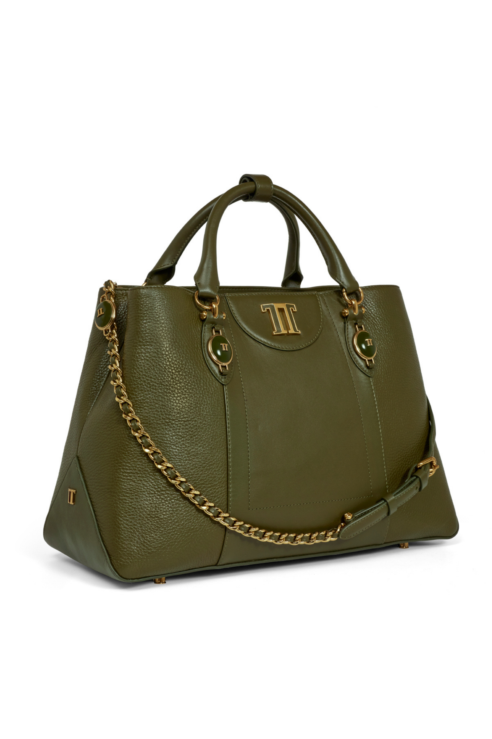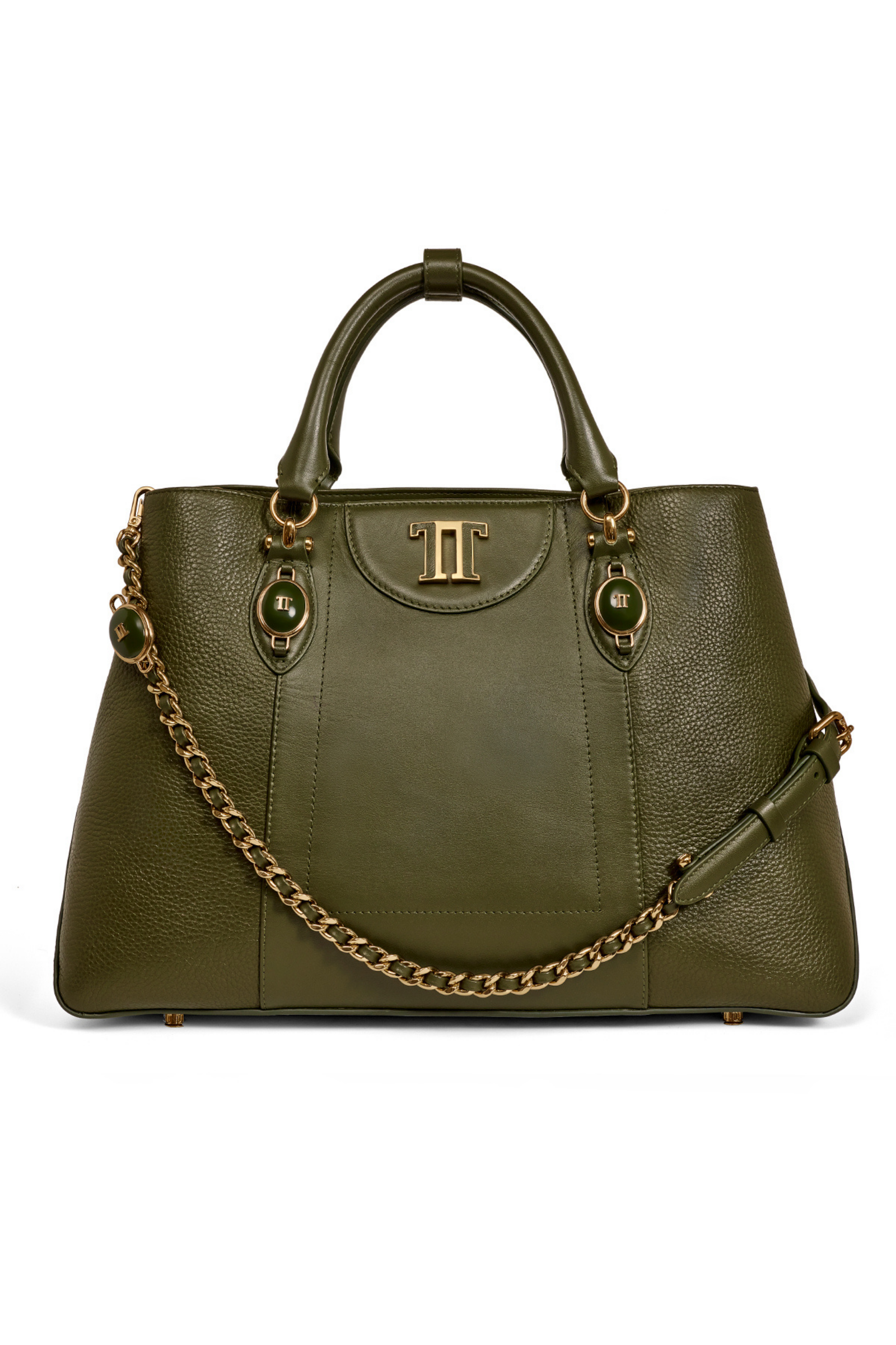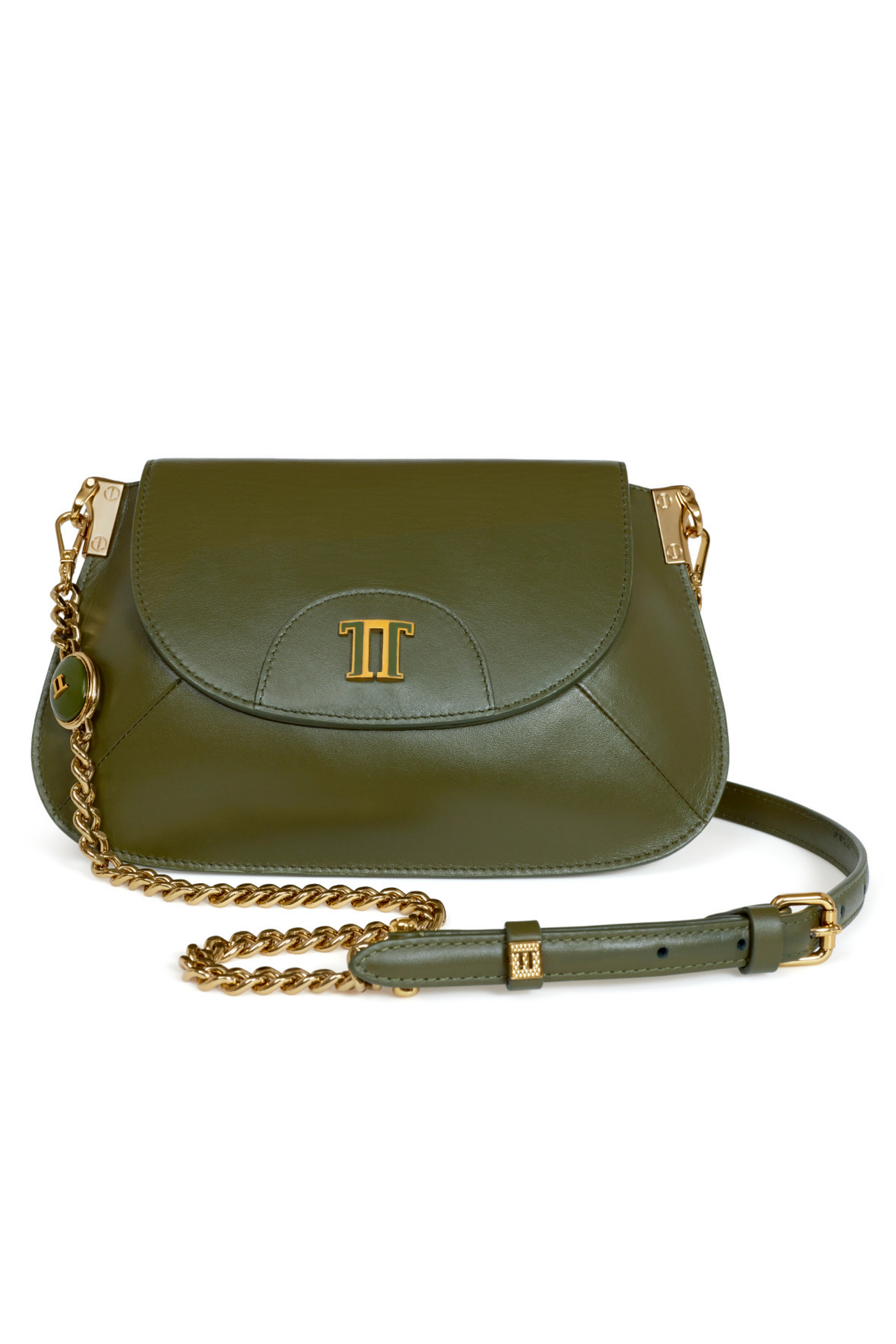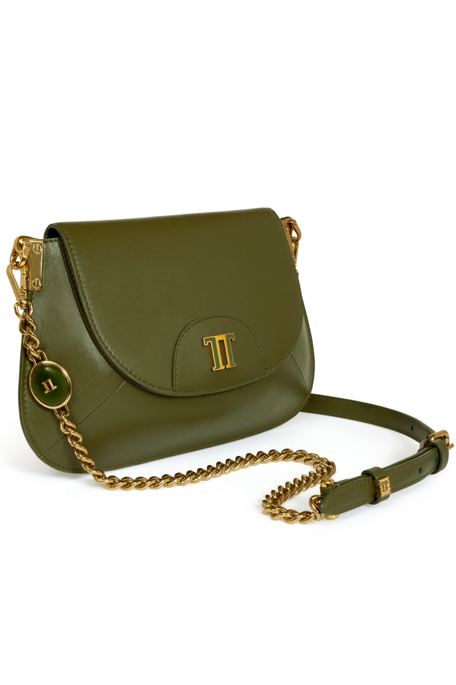• Highlighted by an uncut green amethyst stone centre with an embossed monogram, the TT crystal gilded belt is set amongst pearl detailing and links around the silhouette to add definition.