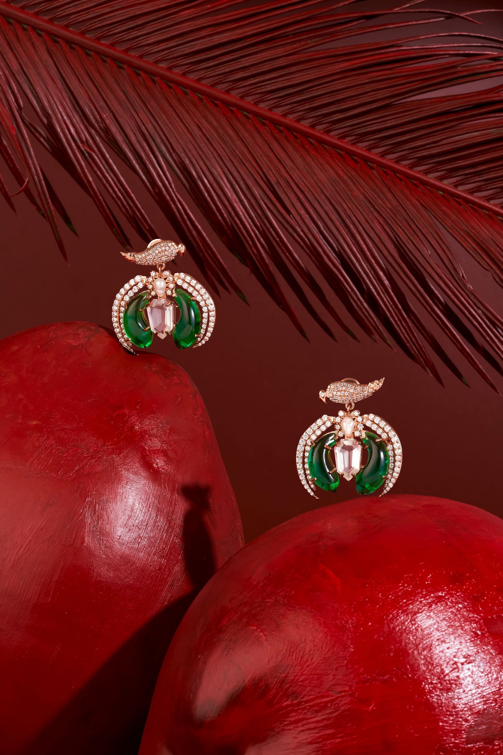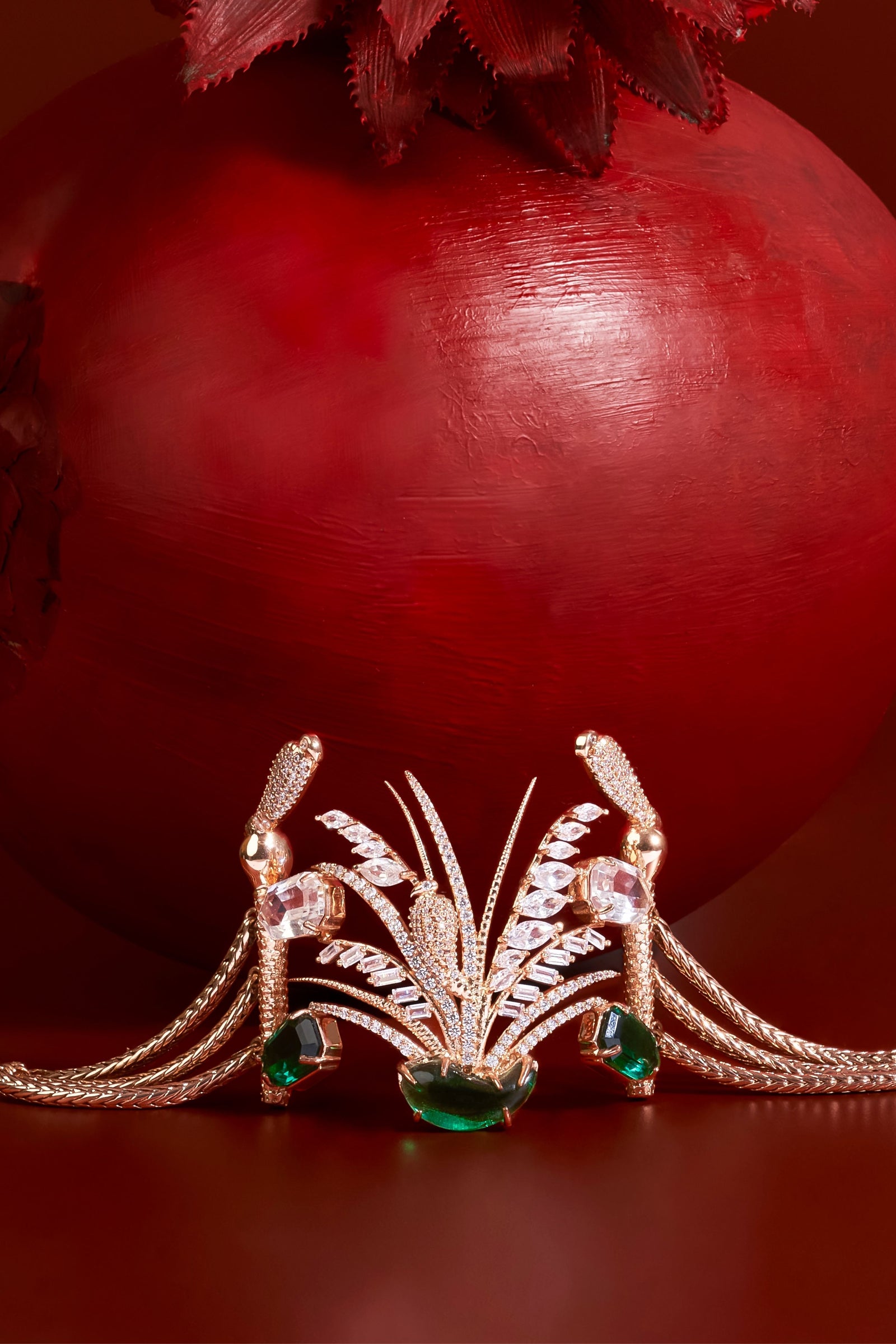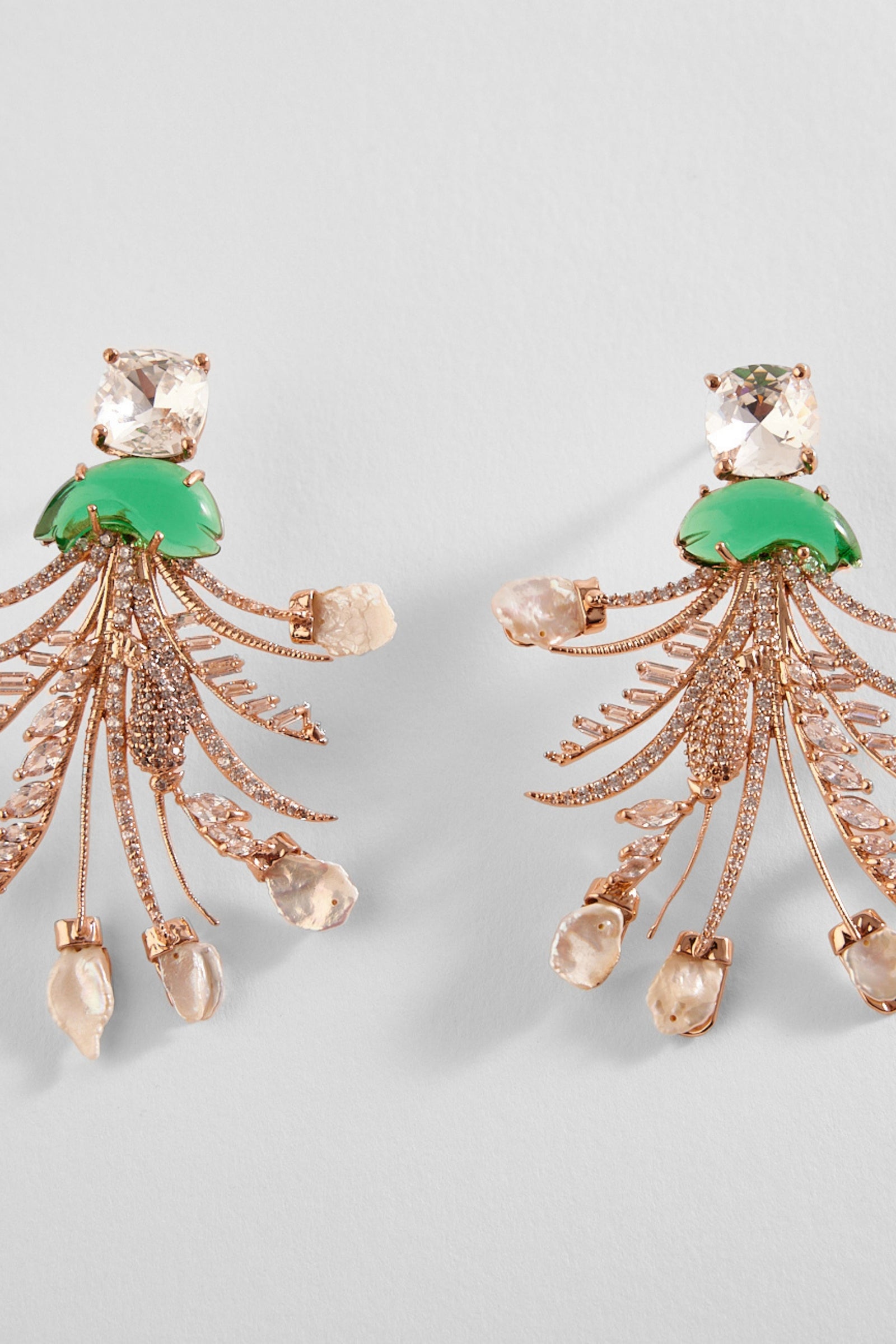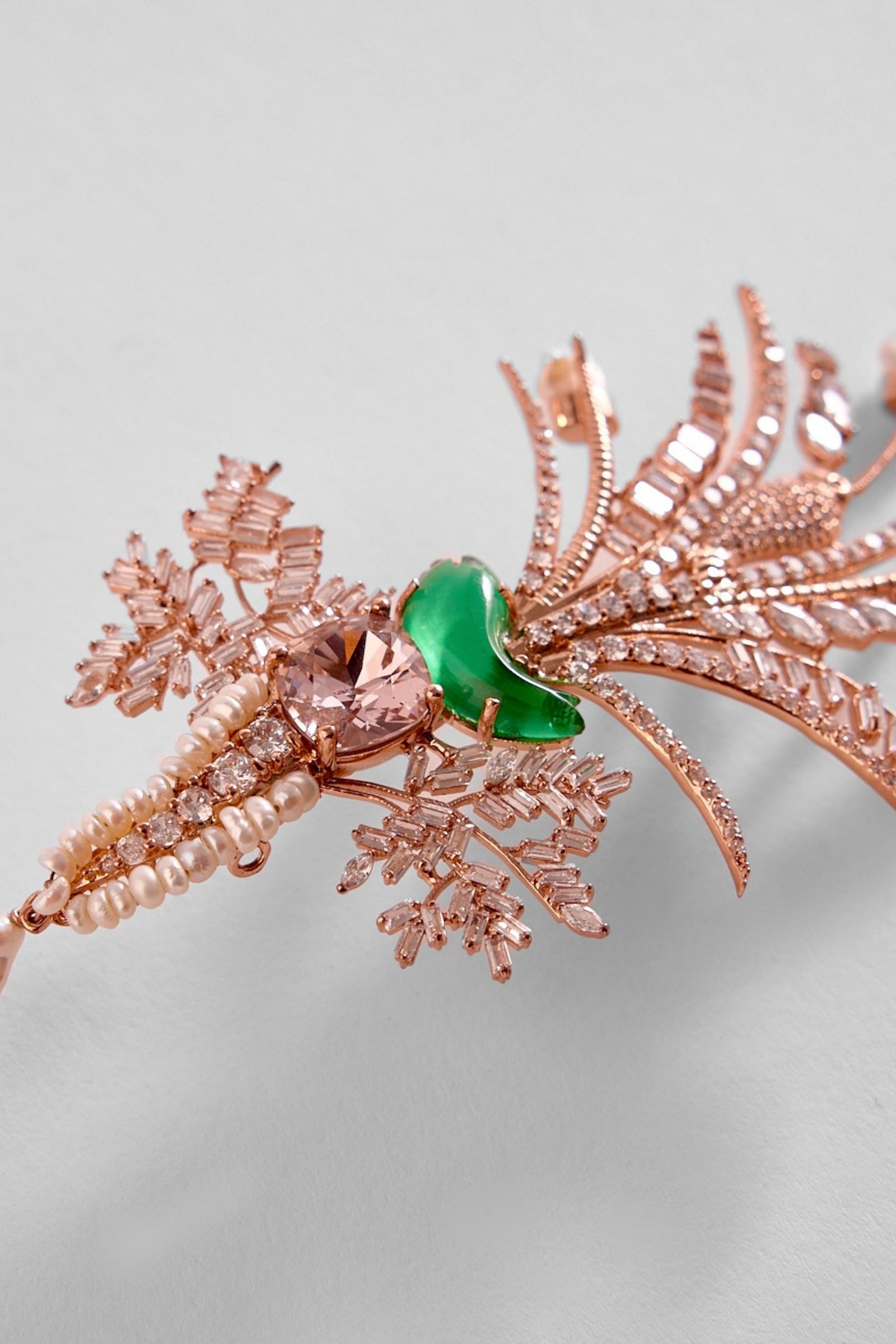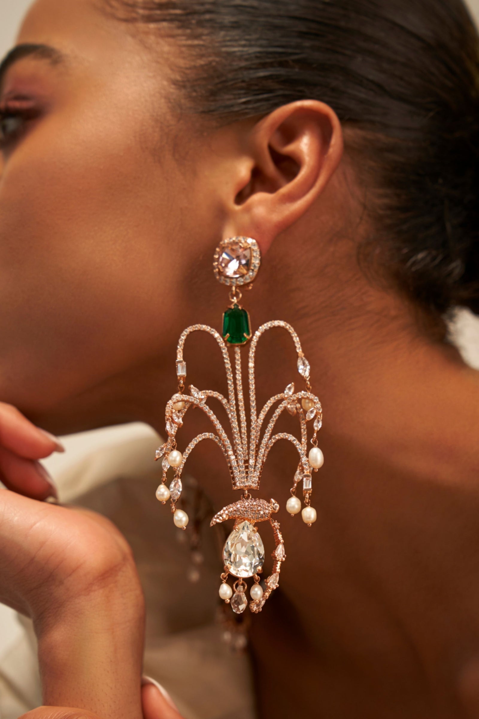 • The the faena free fall earrings is inspired by the leaf of the royal palm and displays seamless symmetry. Extending from this motif, this dome-drop silhouette is encrusted with crystals and a dangling baroque pearl. A true amalgamation of modern and traditional, the pair is lightweight and versatile. It further features multi-sized crystals and cubic zicrons. Finished in 22kt rose gold, the creation can be styled for high-glam occasions as well as casual occasions, offering a delightful range of combinations.