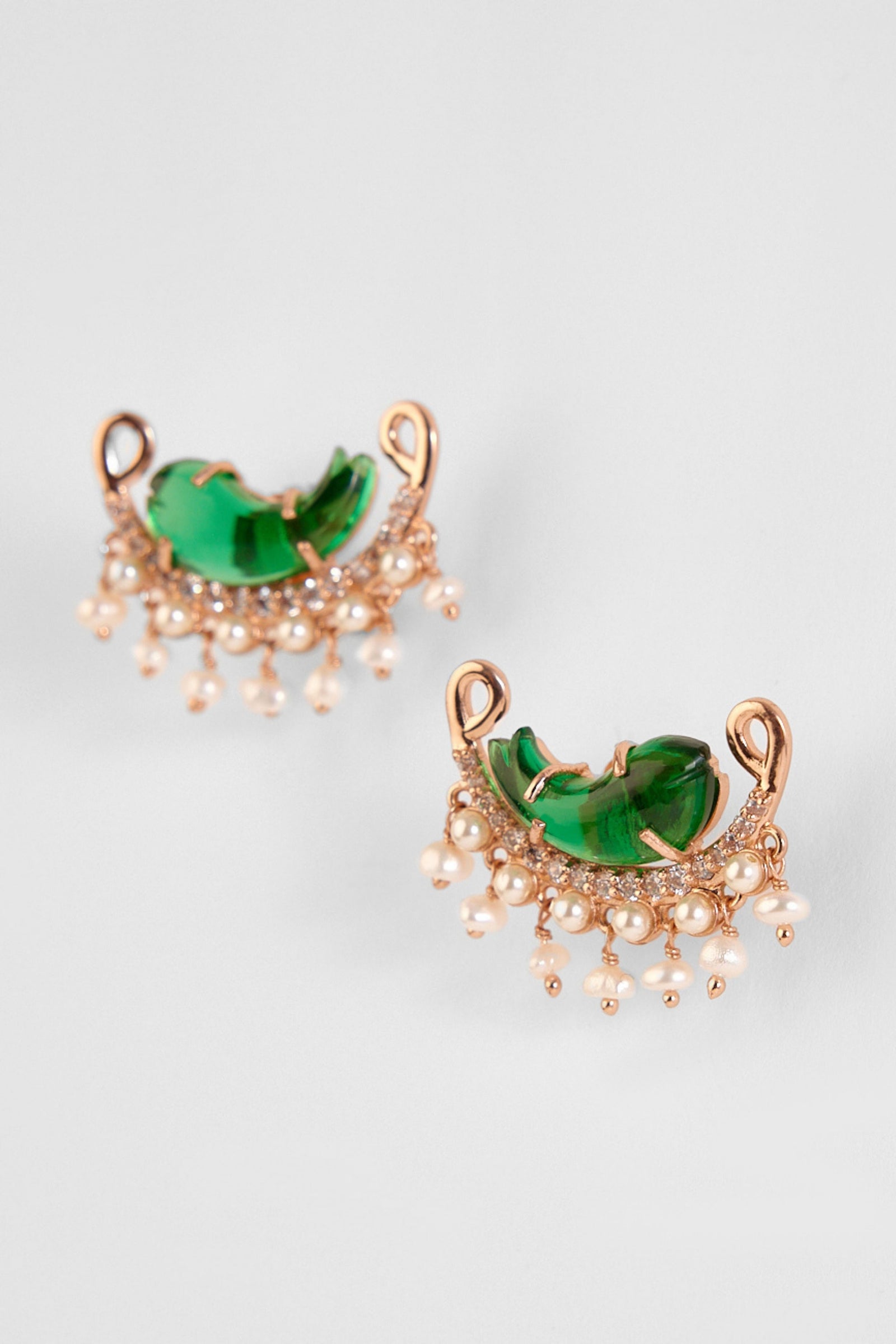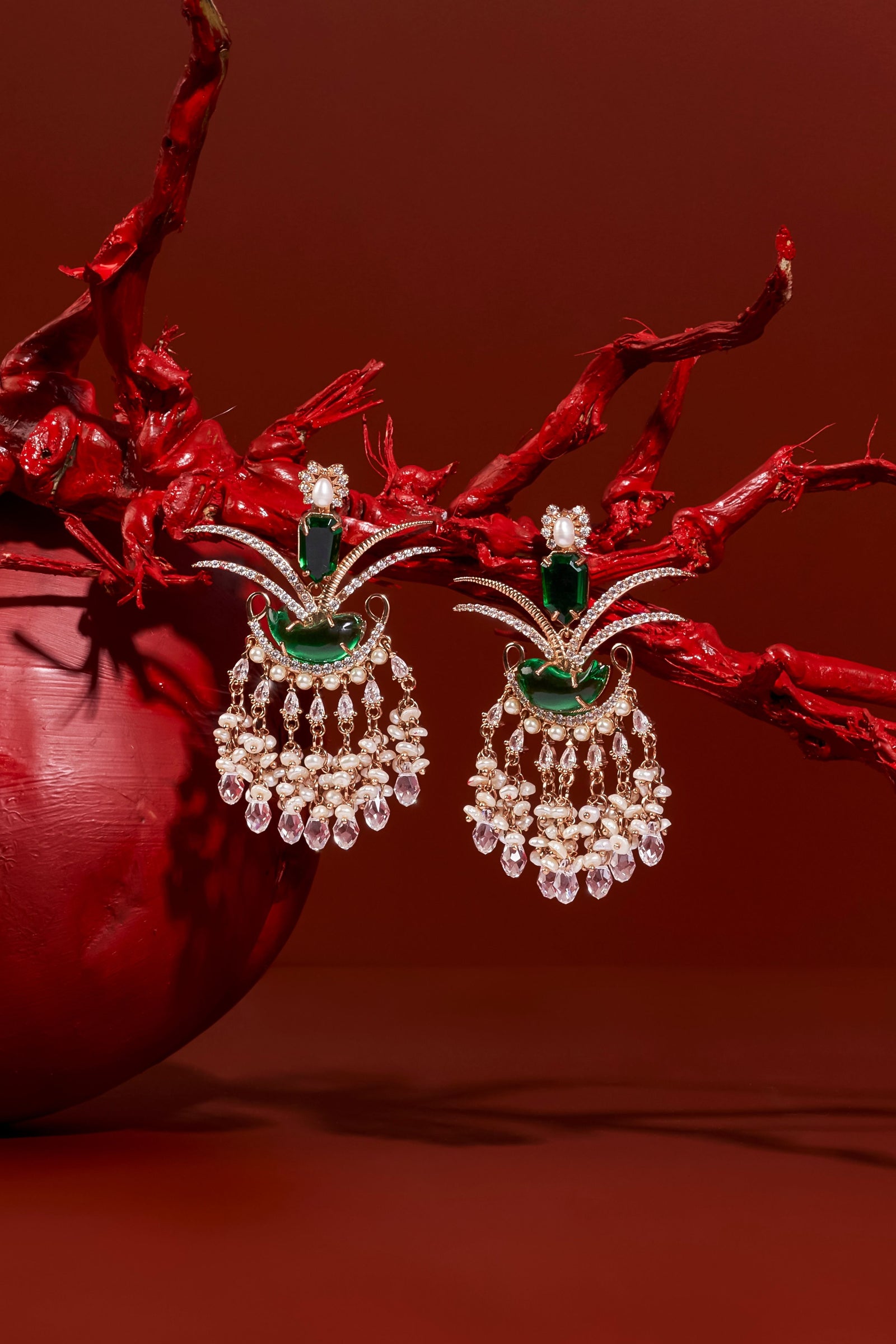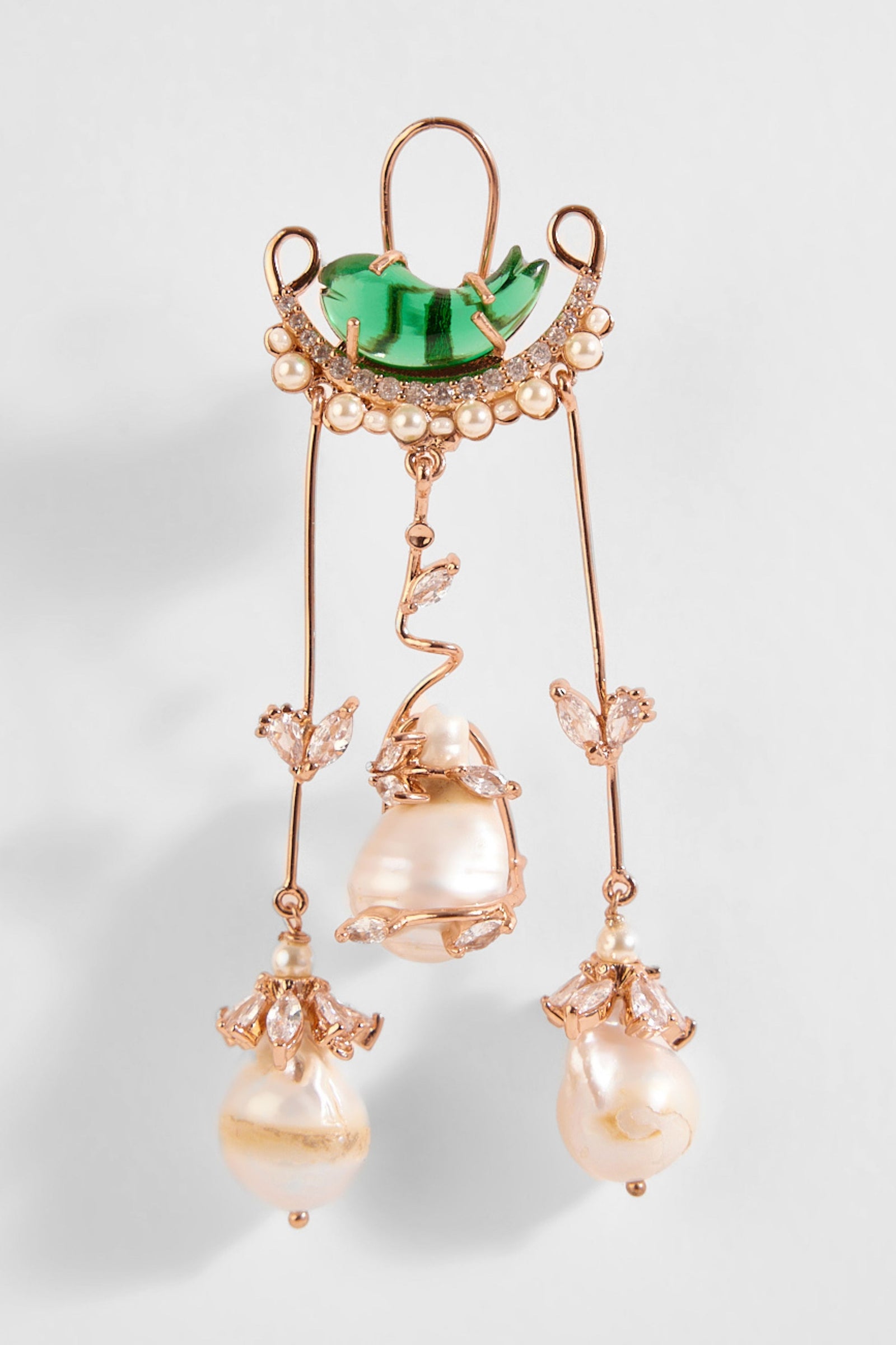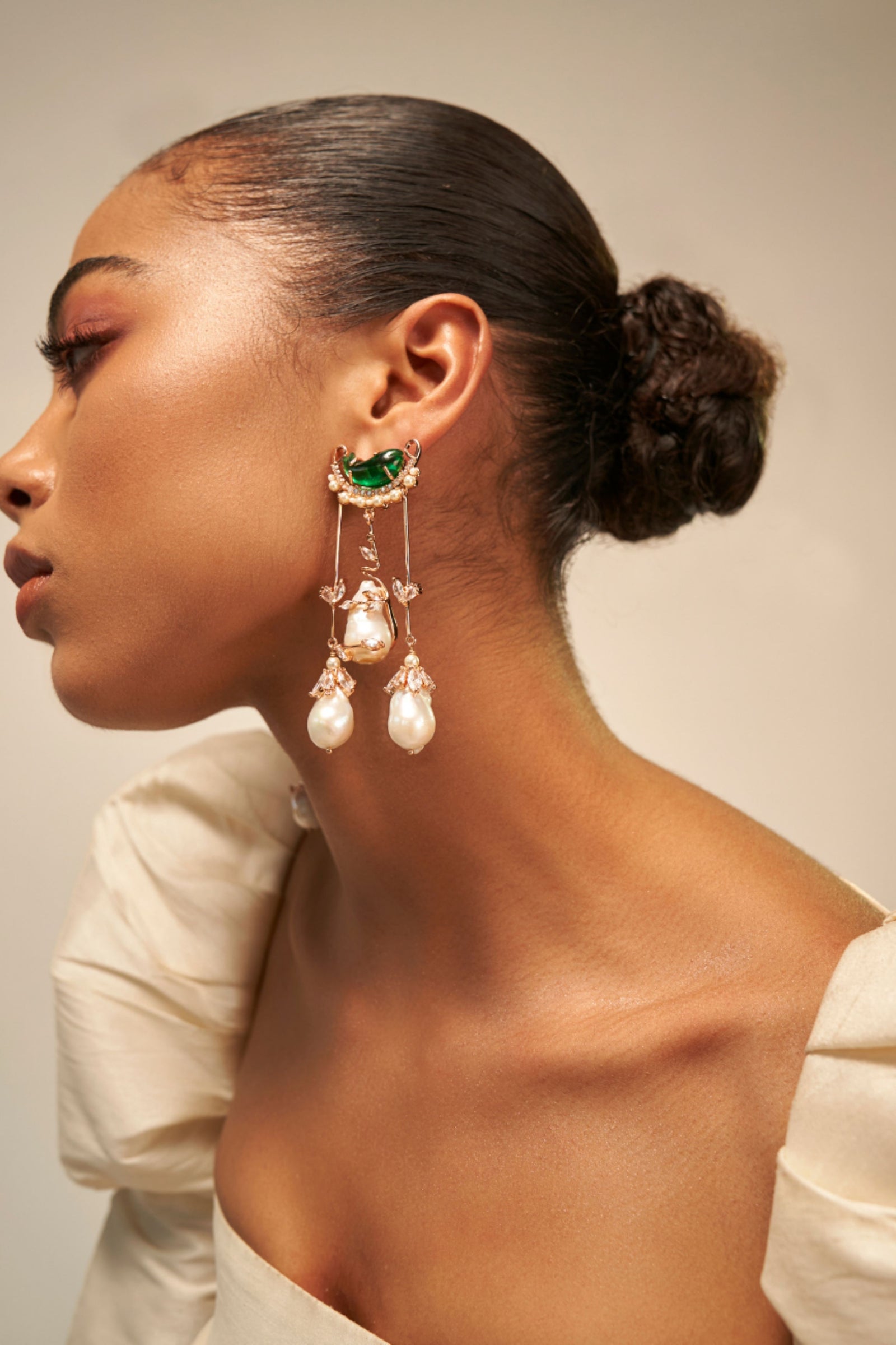 • The the faena free fall earrings is inspired by the leaf of the royal palm and displays seamless symmetry. Extending from this motif, this dome-drop silhouette is encrusted with crystals and a dangling baroque pearl. A true amalgamation of modern and traditional, the pair is lightweight and versatile. It further features multi-sized crystals and cubic zicrons. Finished in 22kt rose gold, the creation can be styled for high-glam occasions as well as casual occasions, offering a delightful range of combinations.