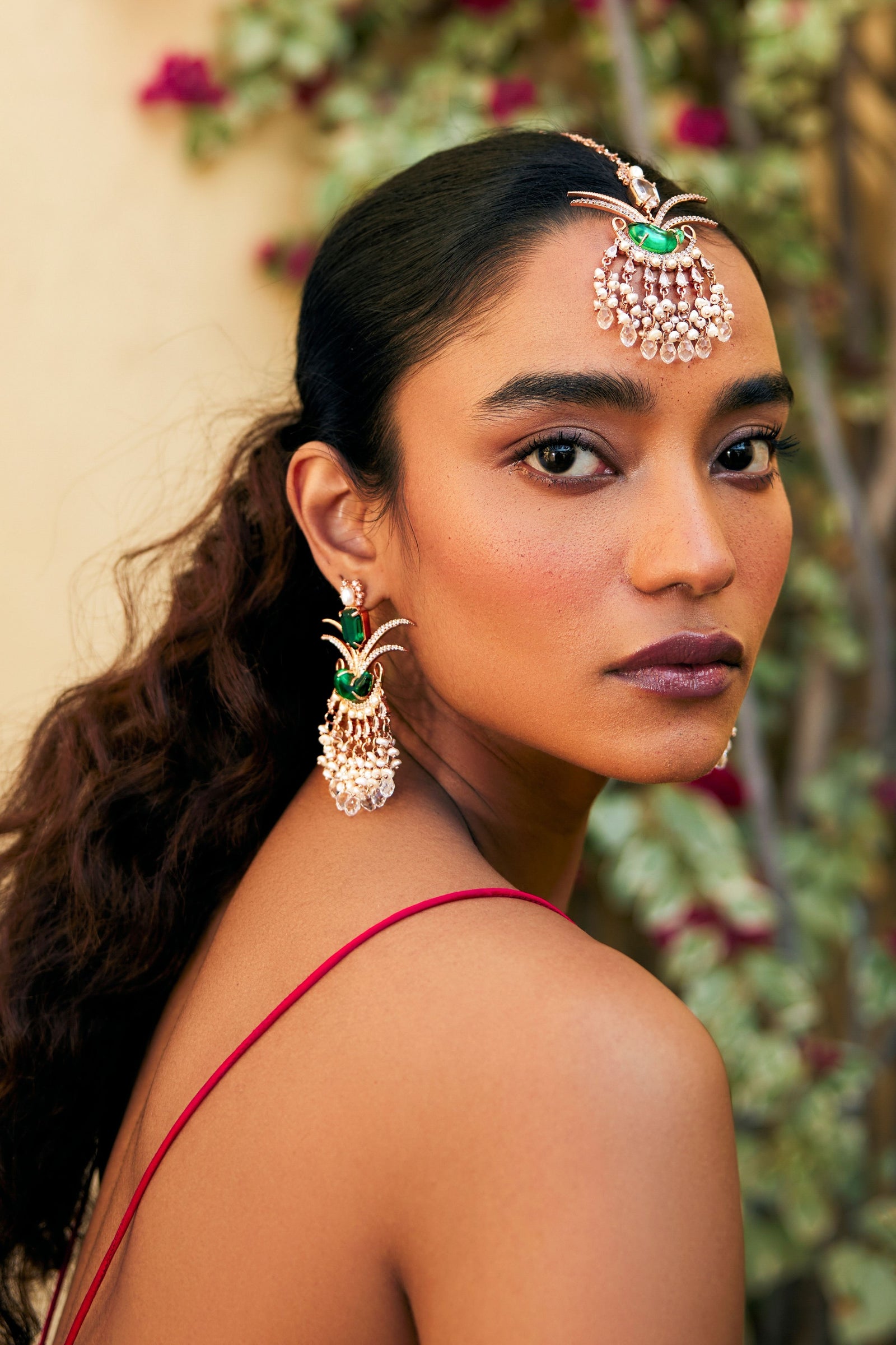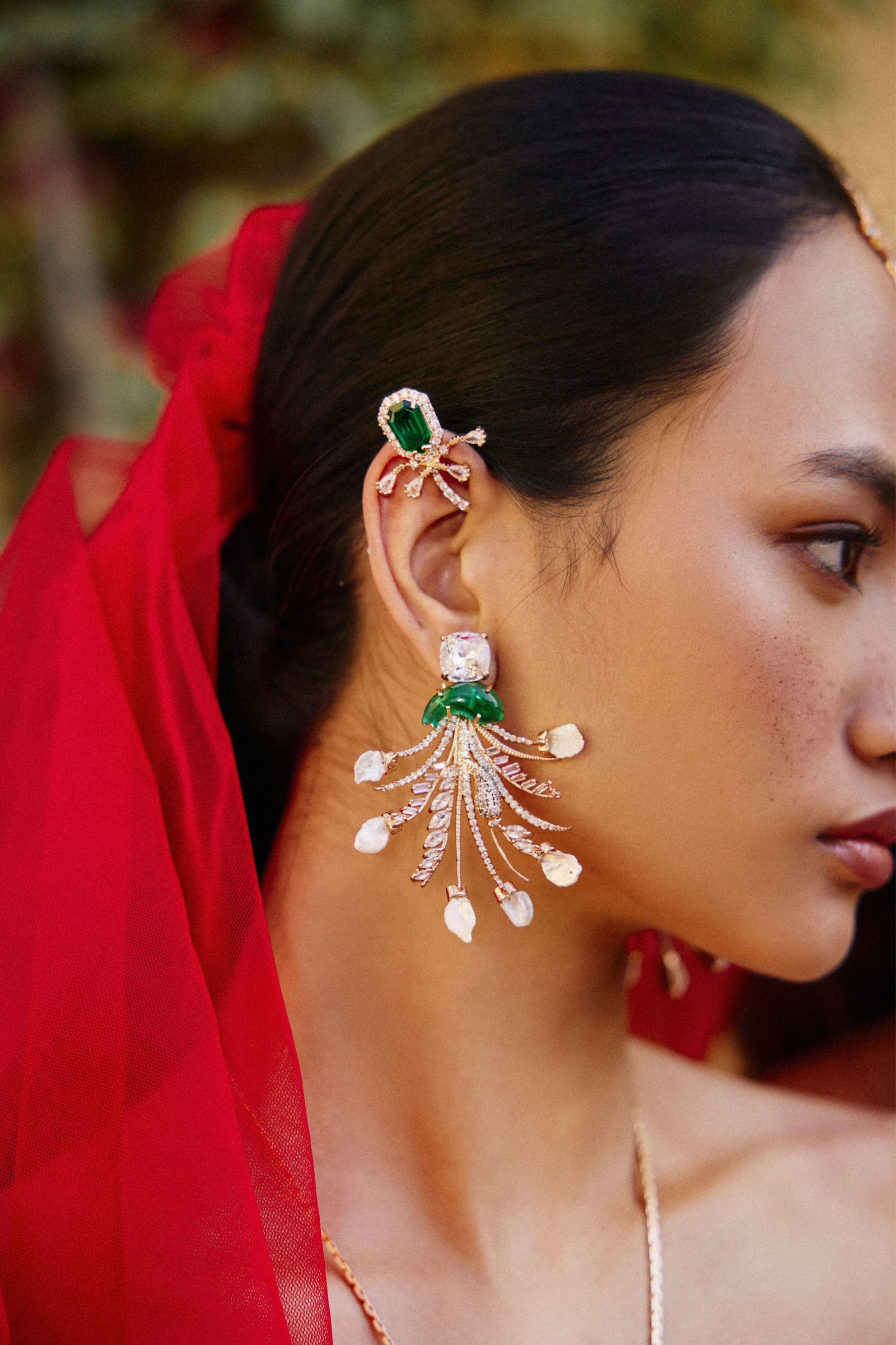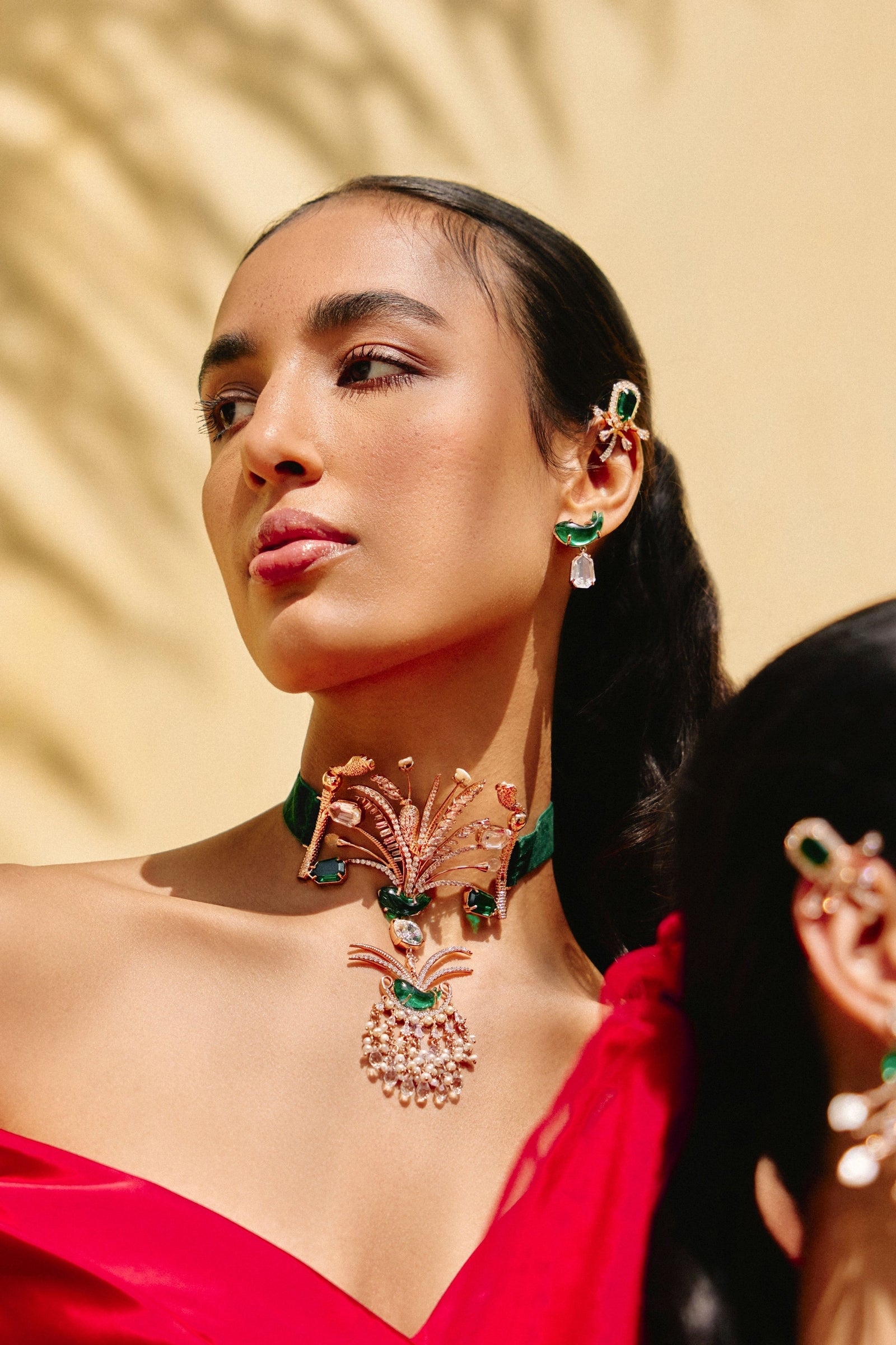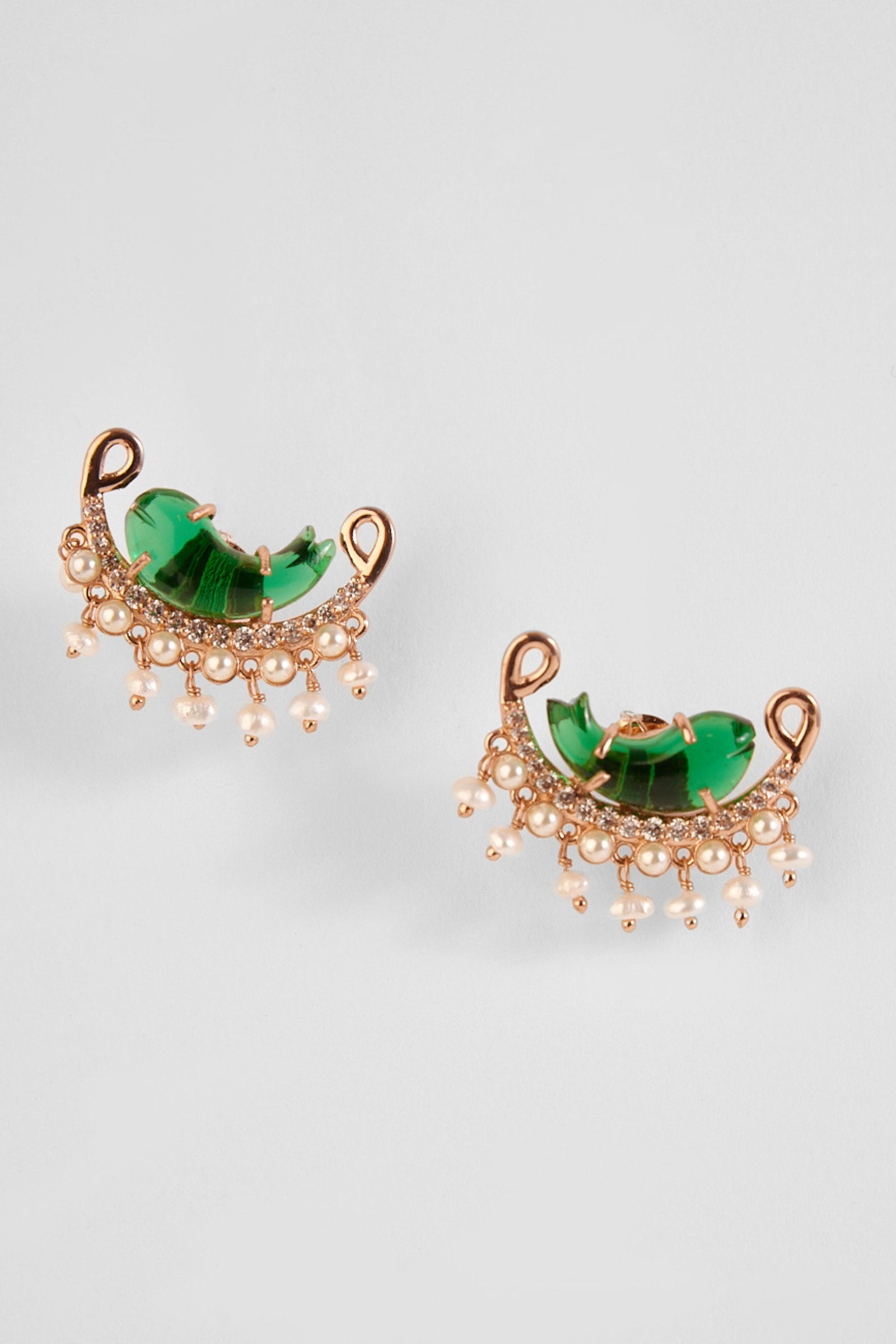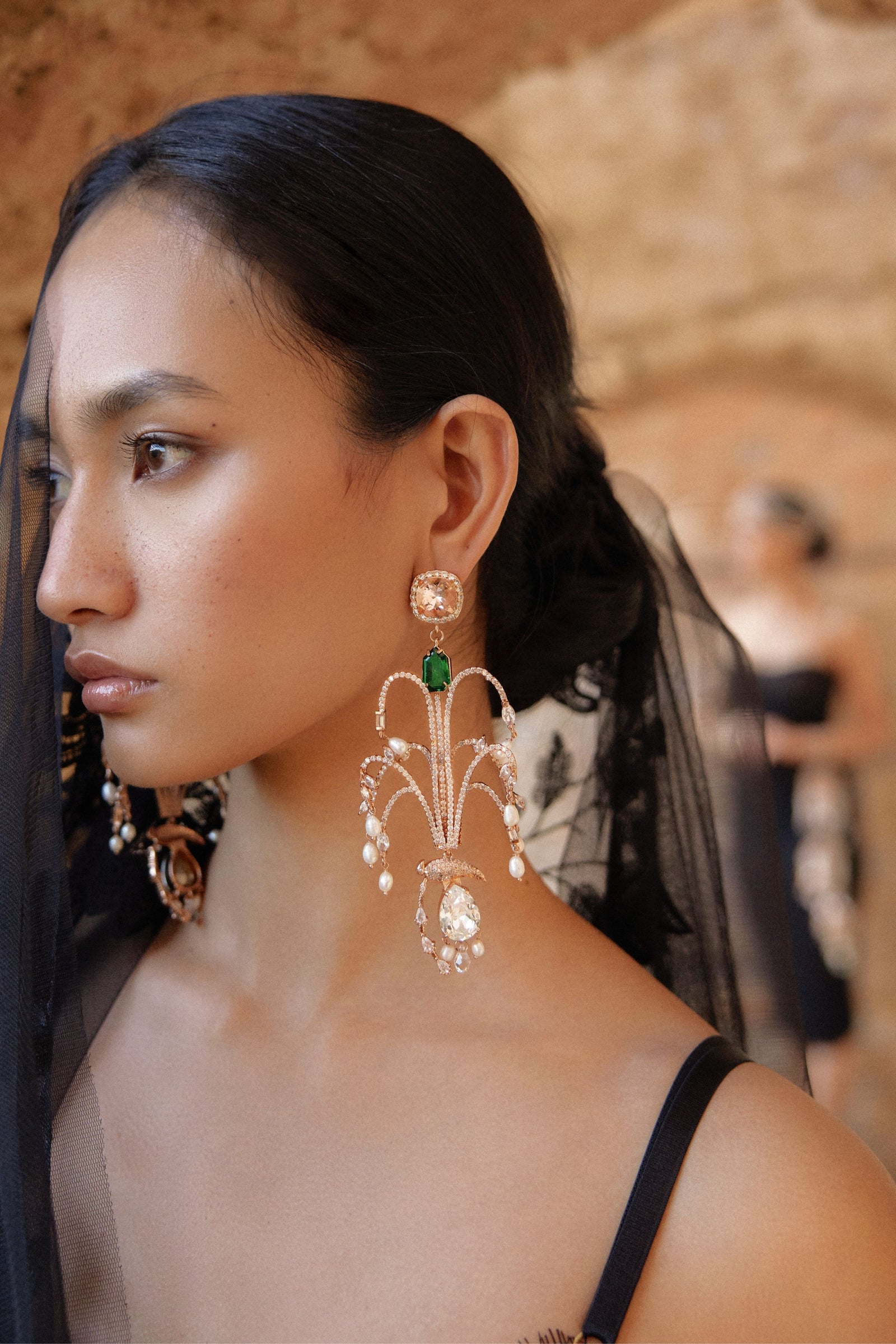 • The the faena free fall earrings is inspired by the leaf of the royal palm and displays seamless symmetry. Extending from this motif, this dome-drop silhouette is encrusted with crystals and a dangling baroque pearl. A true amalgamation of modern and traditional, the pair is lightweight and versatile. It further features multi-sized crystals and cubic zicrons. Finished in 22kt rose gold, the creation can be styled for high-glam occasions as well as casual occasions, offering a delightful range of combinations.