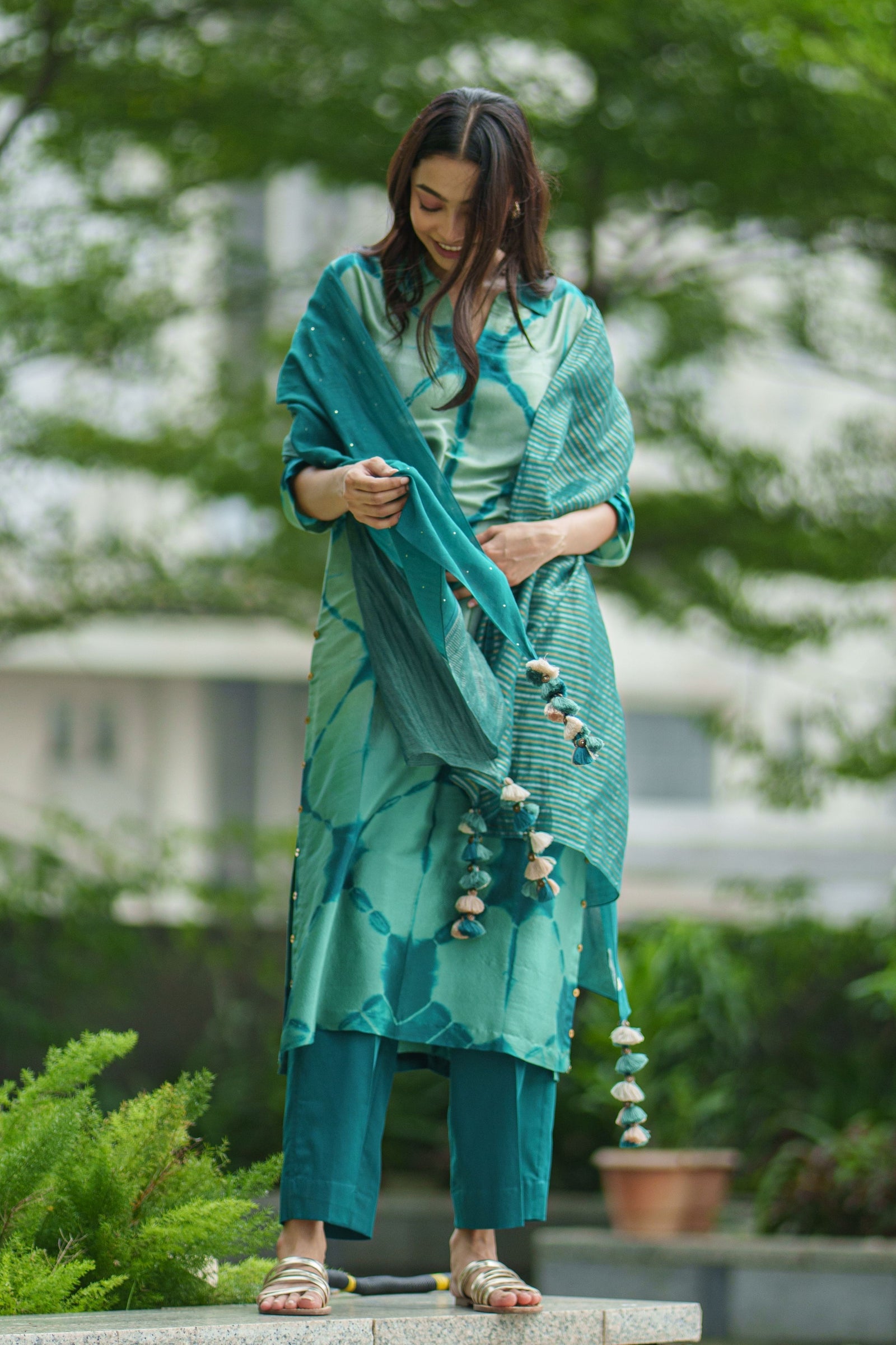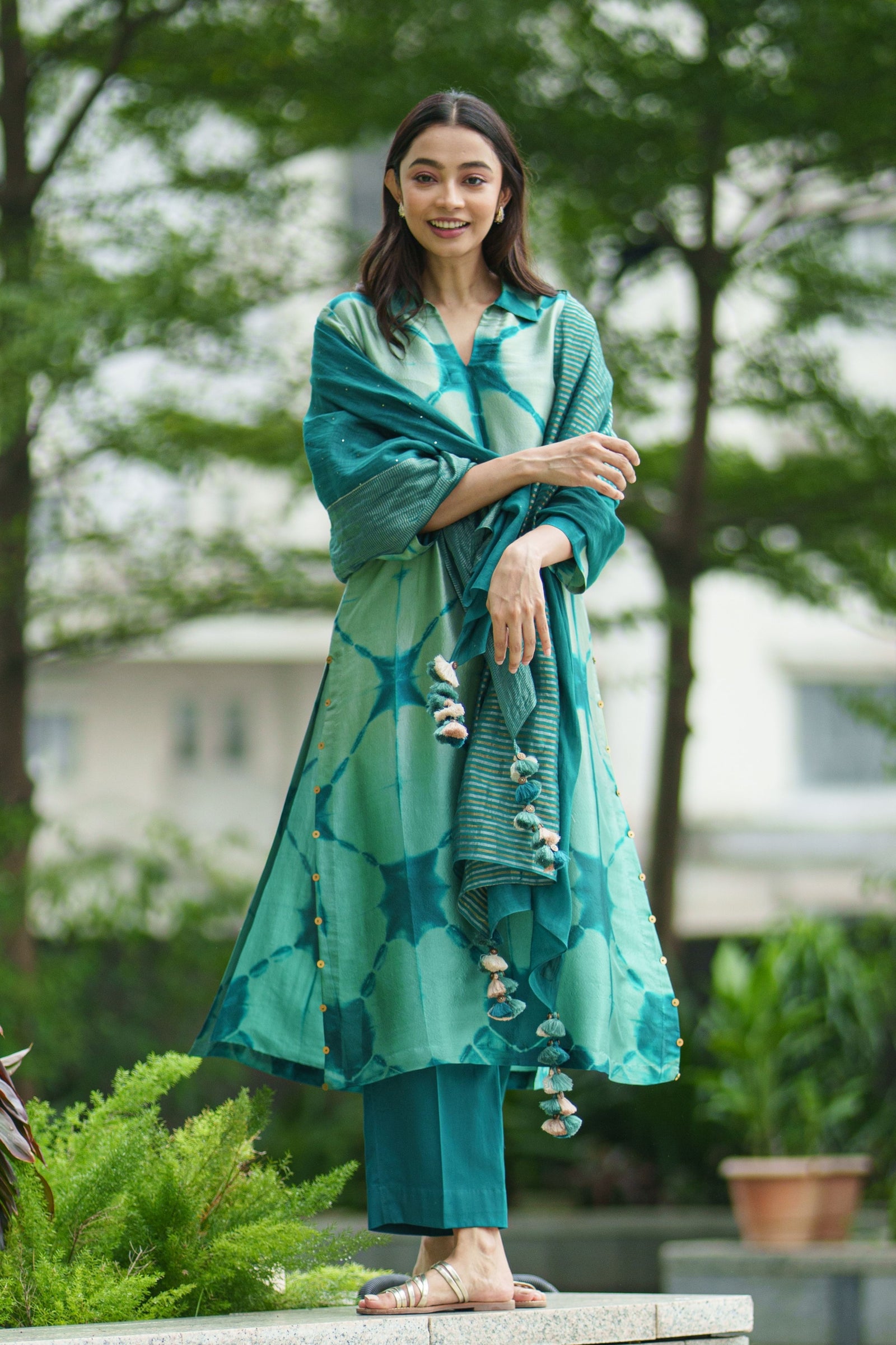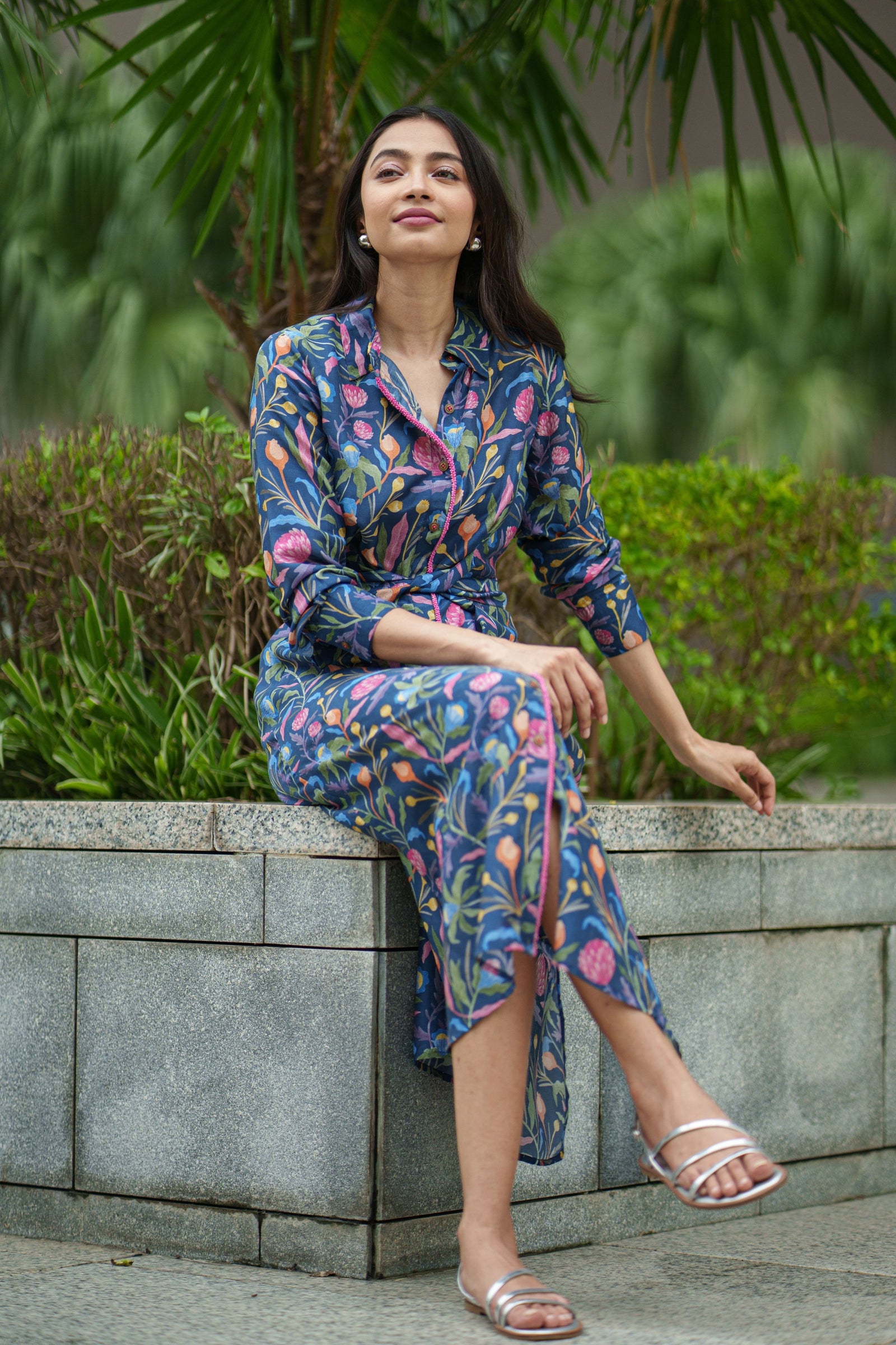 • Our take on the hottest new trend, co-ord sets- This gather top set is our newest launch and is going be the perfect go-to piece for every occasion. Crafted in buttery muslin and the universal favourite multi colour ikat print. Paired with our plain blue pants in the same fabric, it’ll take you from the boardroom to the dance floor without breaking a sweat