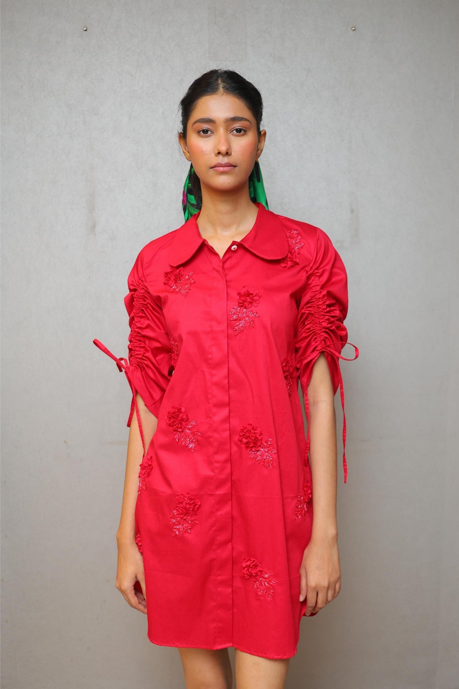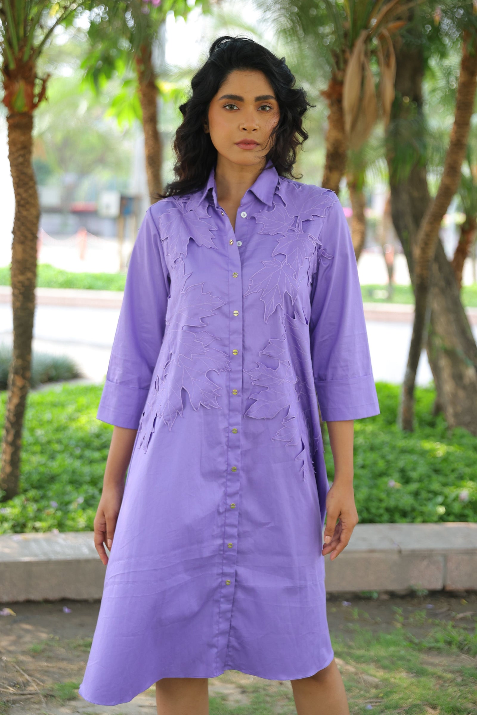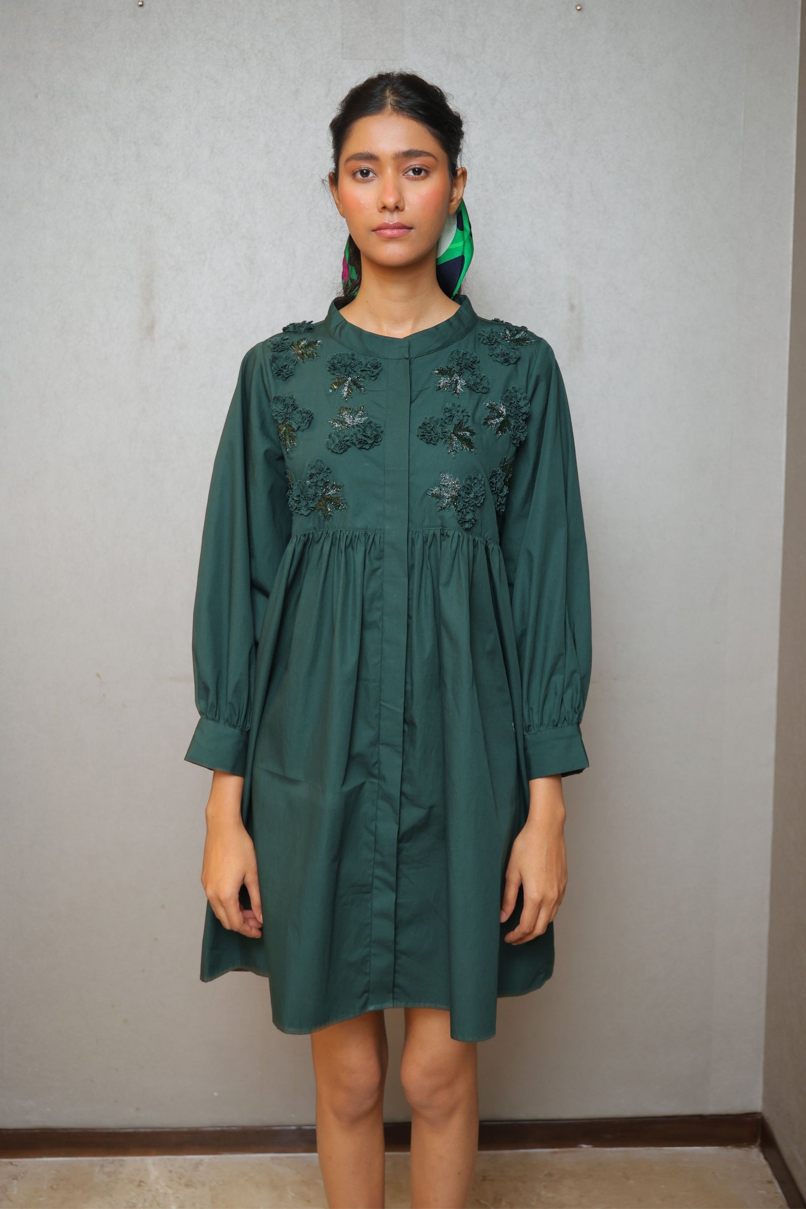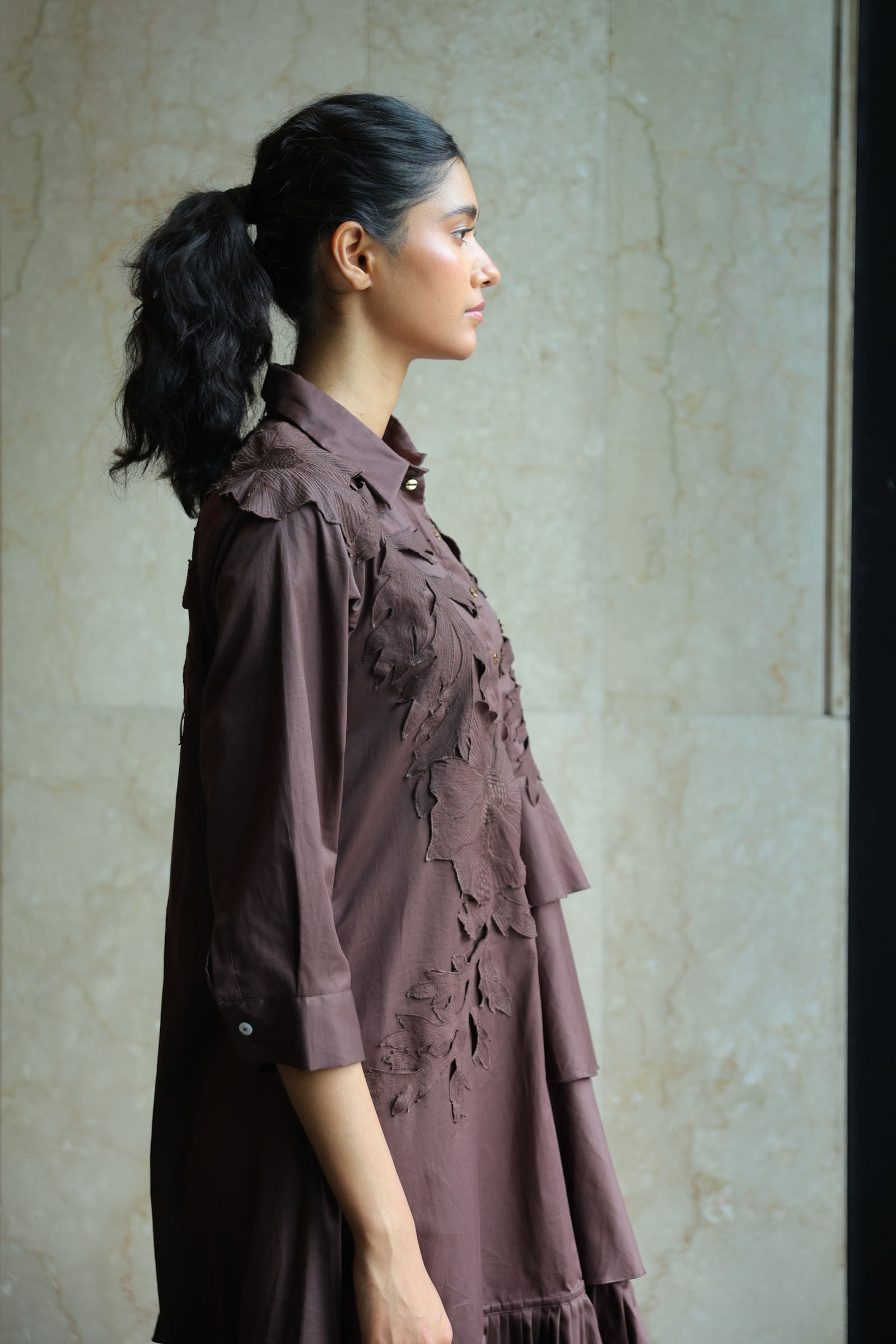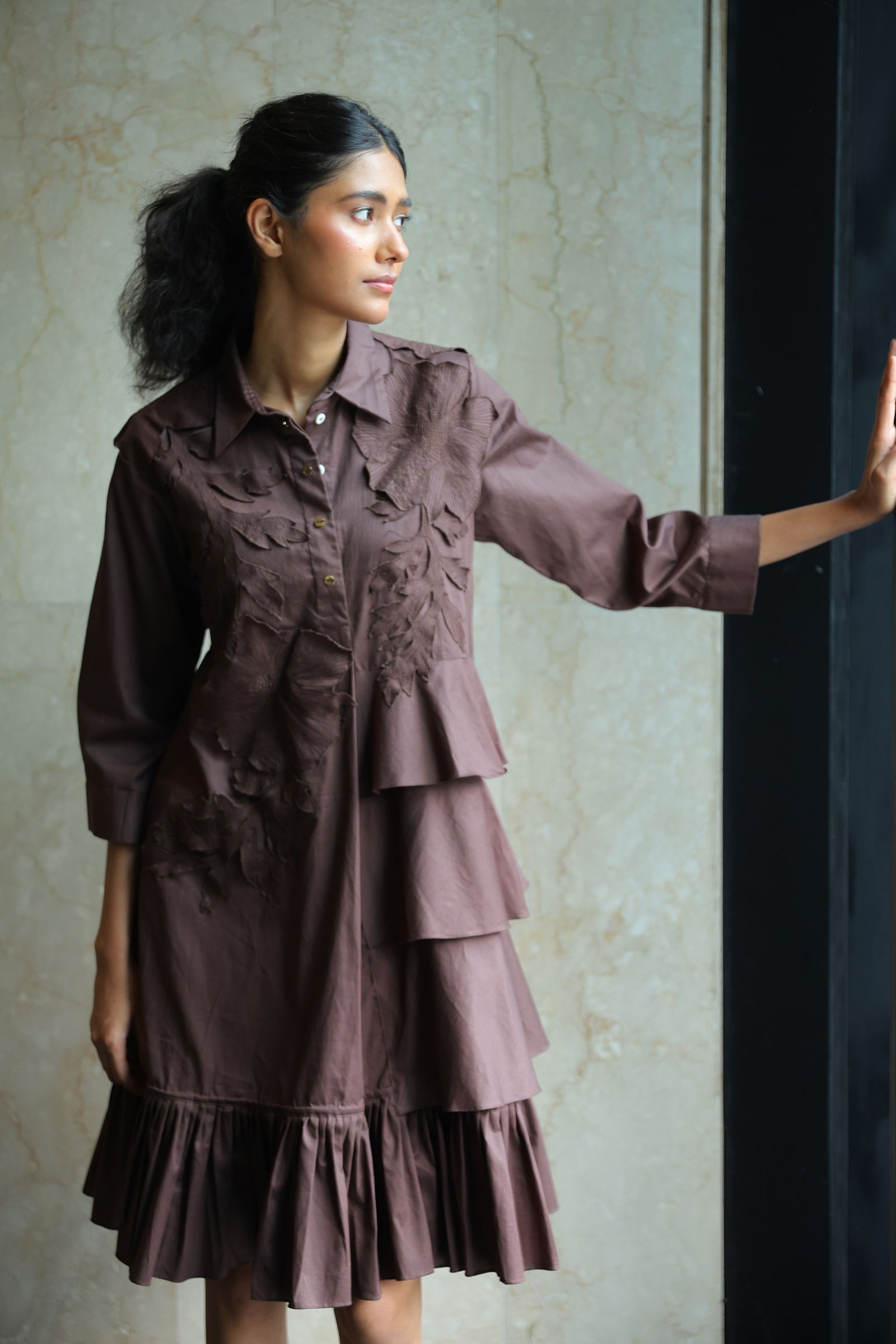 • Three tiered frill dress having hand crafted golden rivet details with front button down placket, shirt collar and puff sleeves.