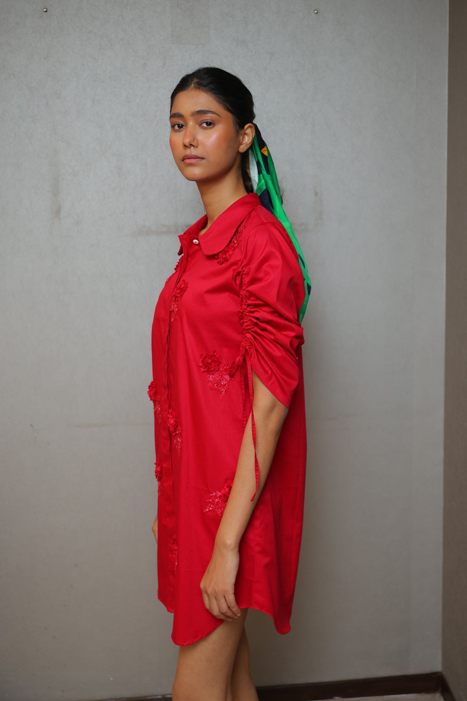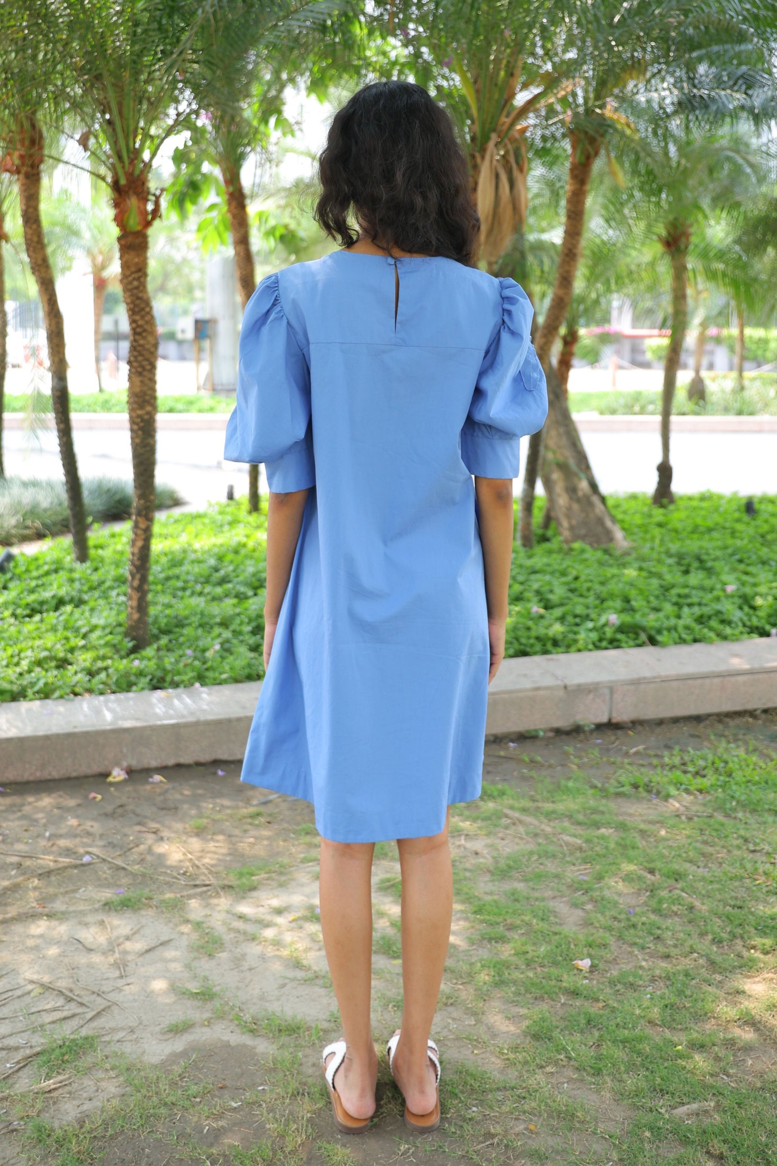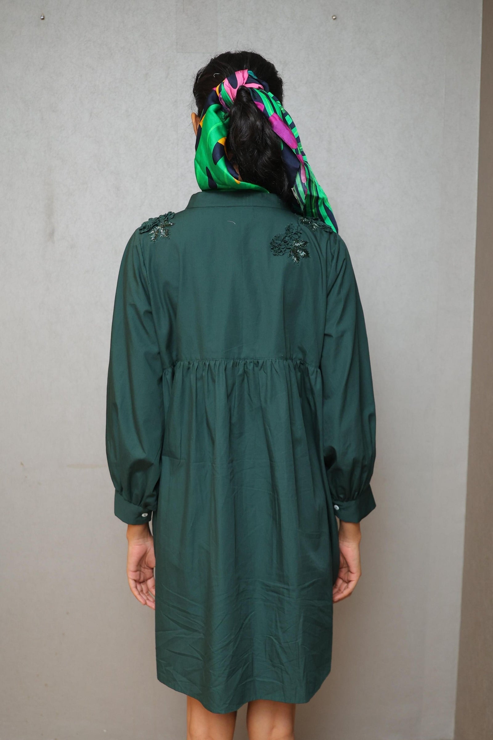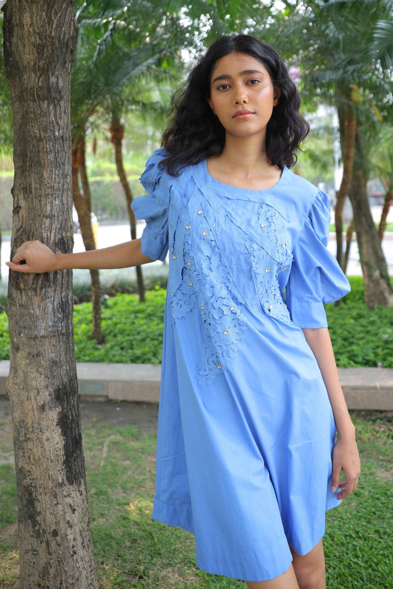 • Three tiered frill dress having hand crafted golden rivet details with front button down placket, shirt collar and puff sleeves.