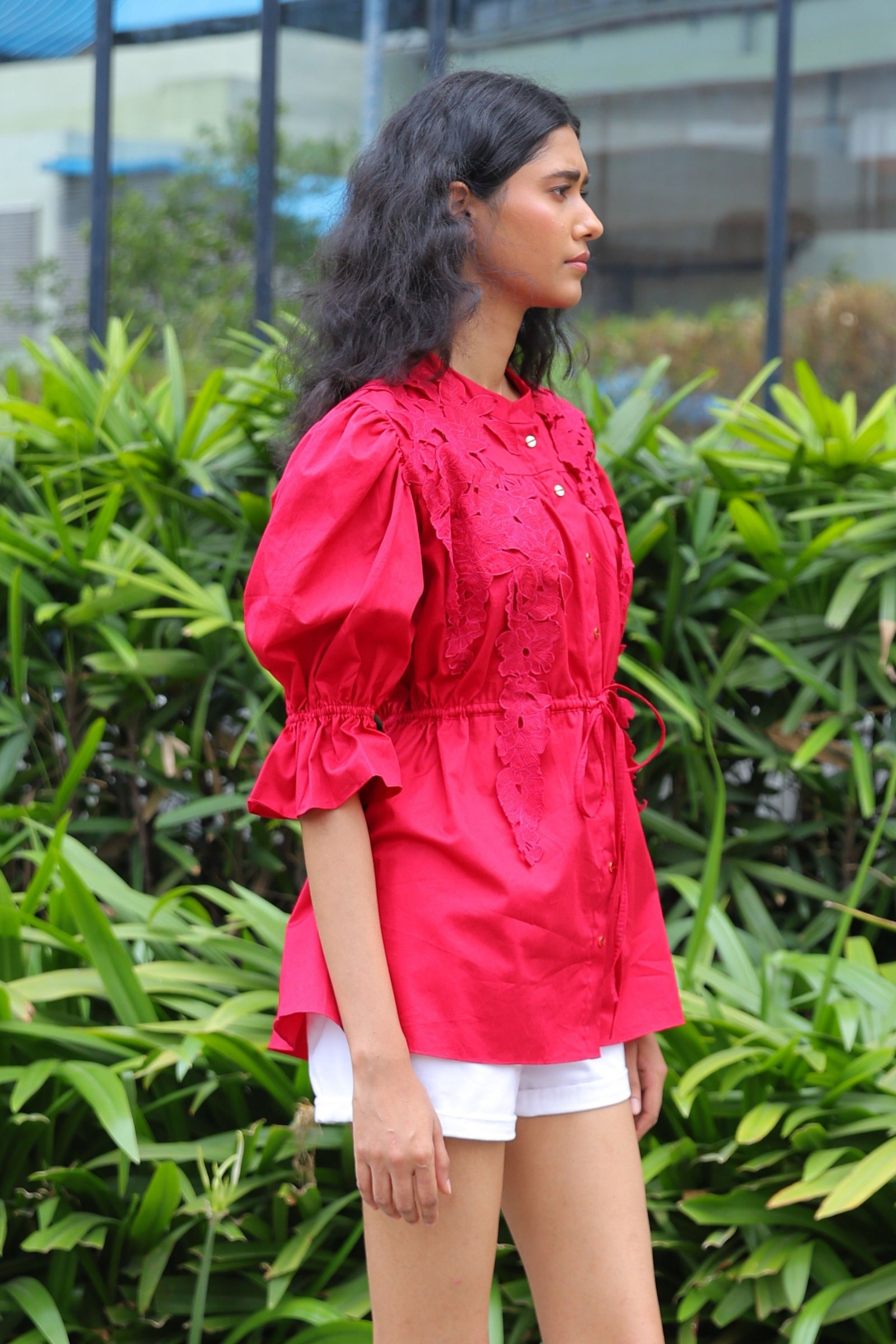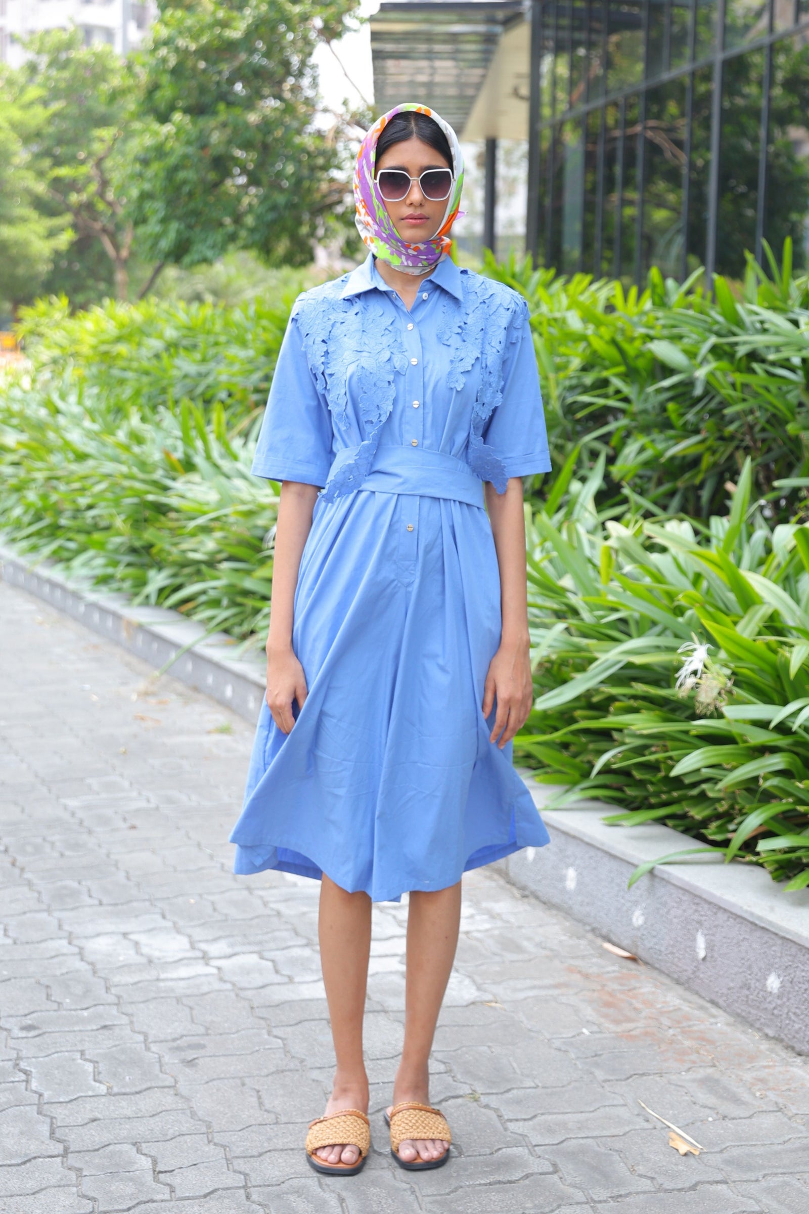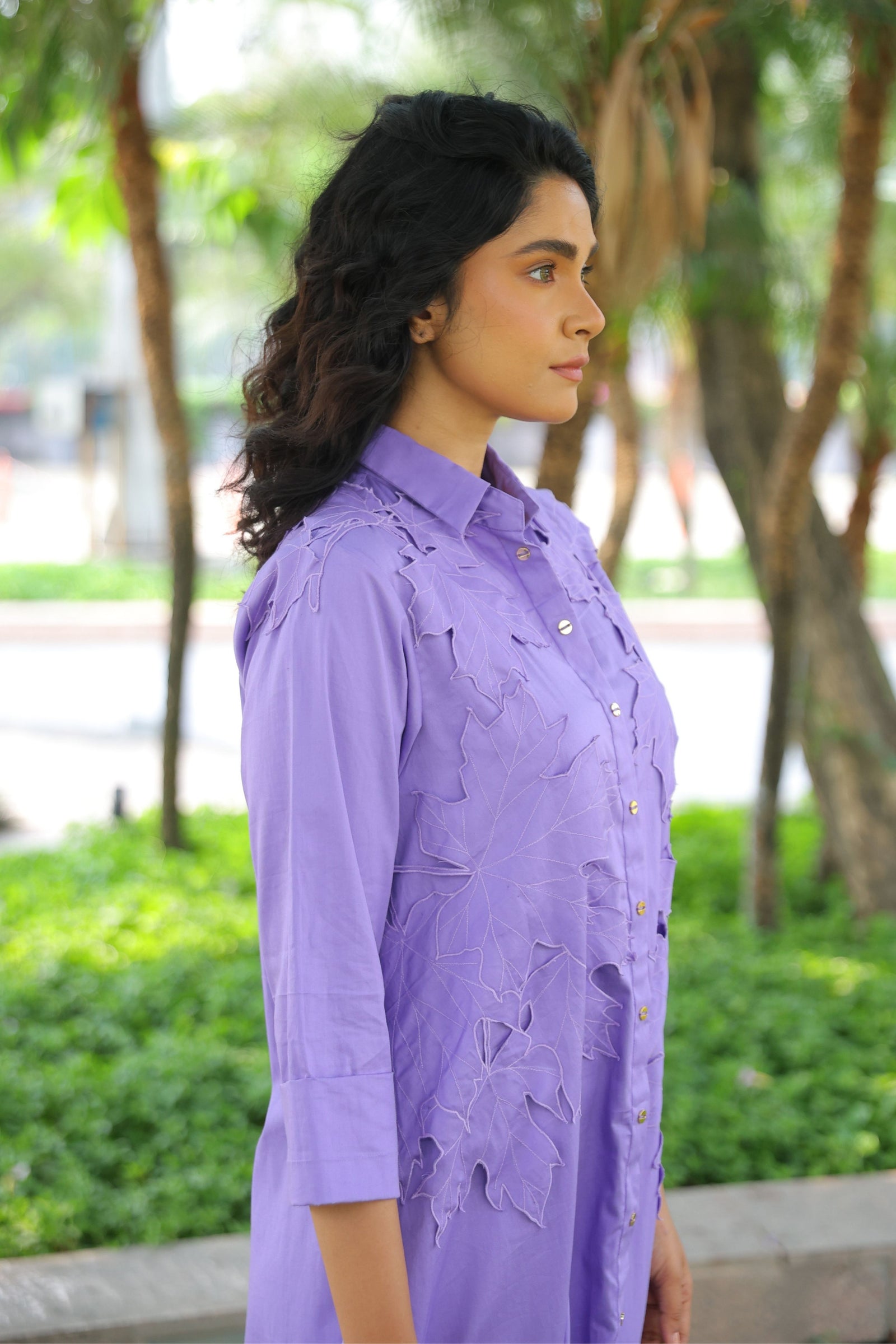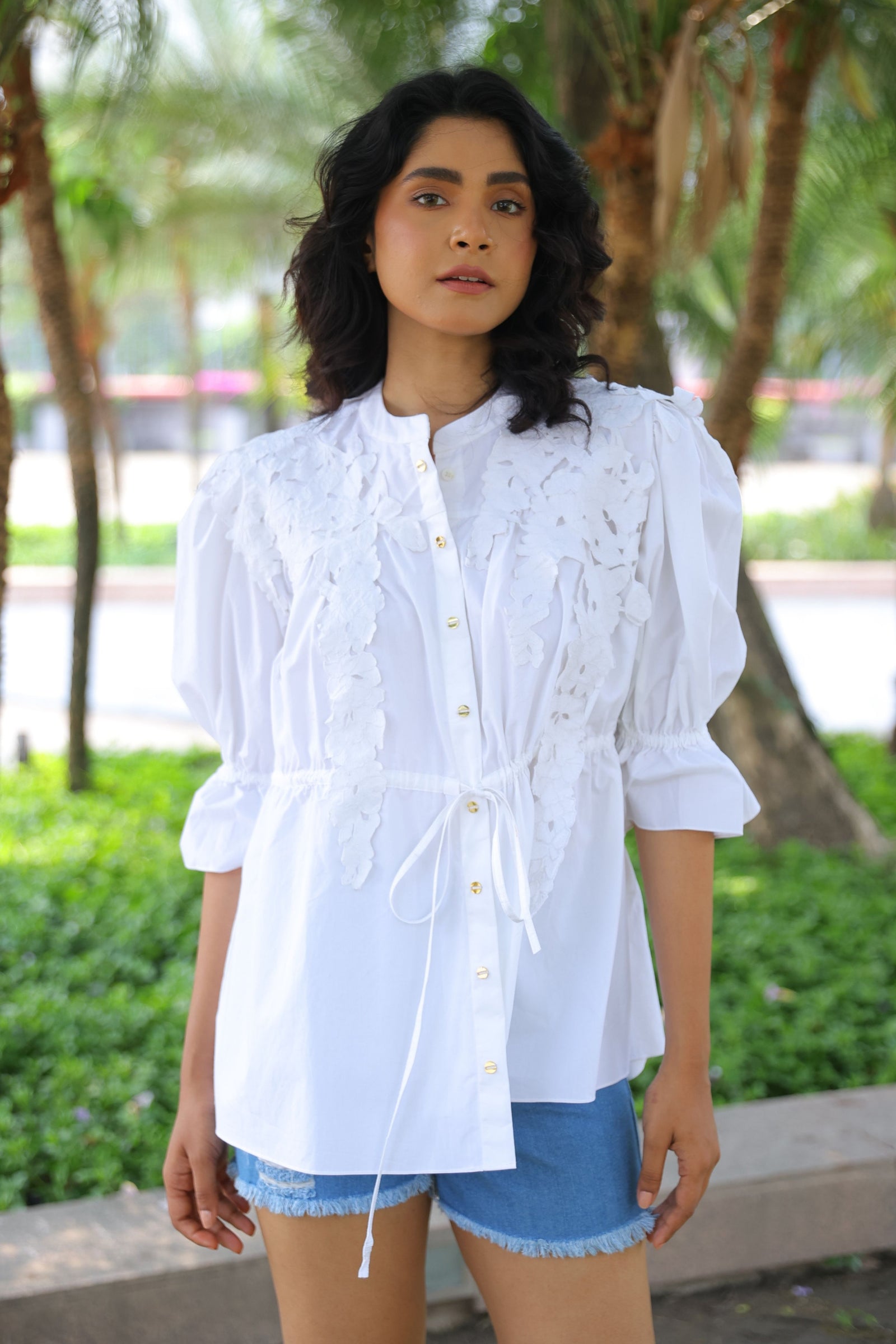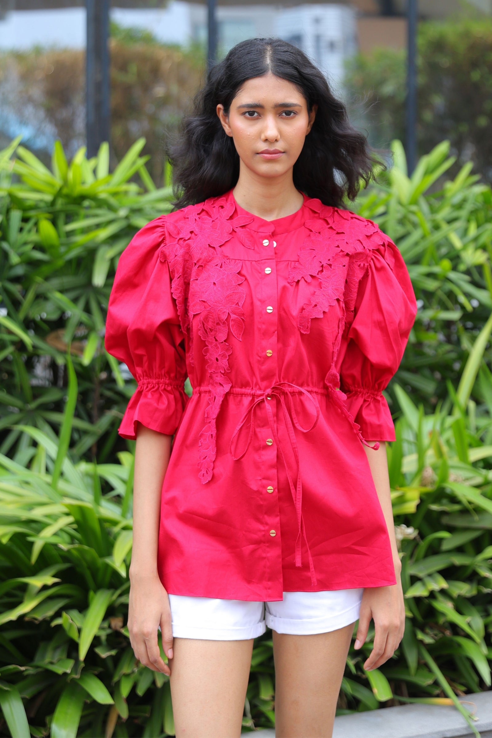 • Three tiered frill dress having hand crafted golden rivet details with front button down placket, shirt collar and puff sleeves.