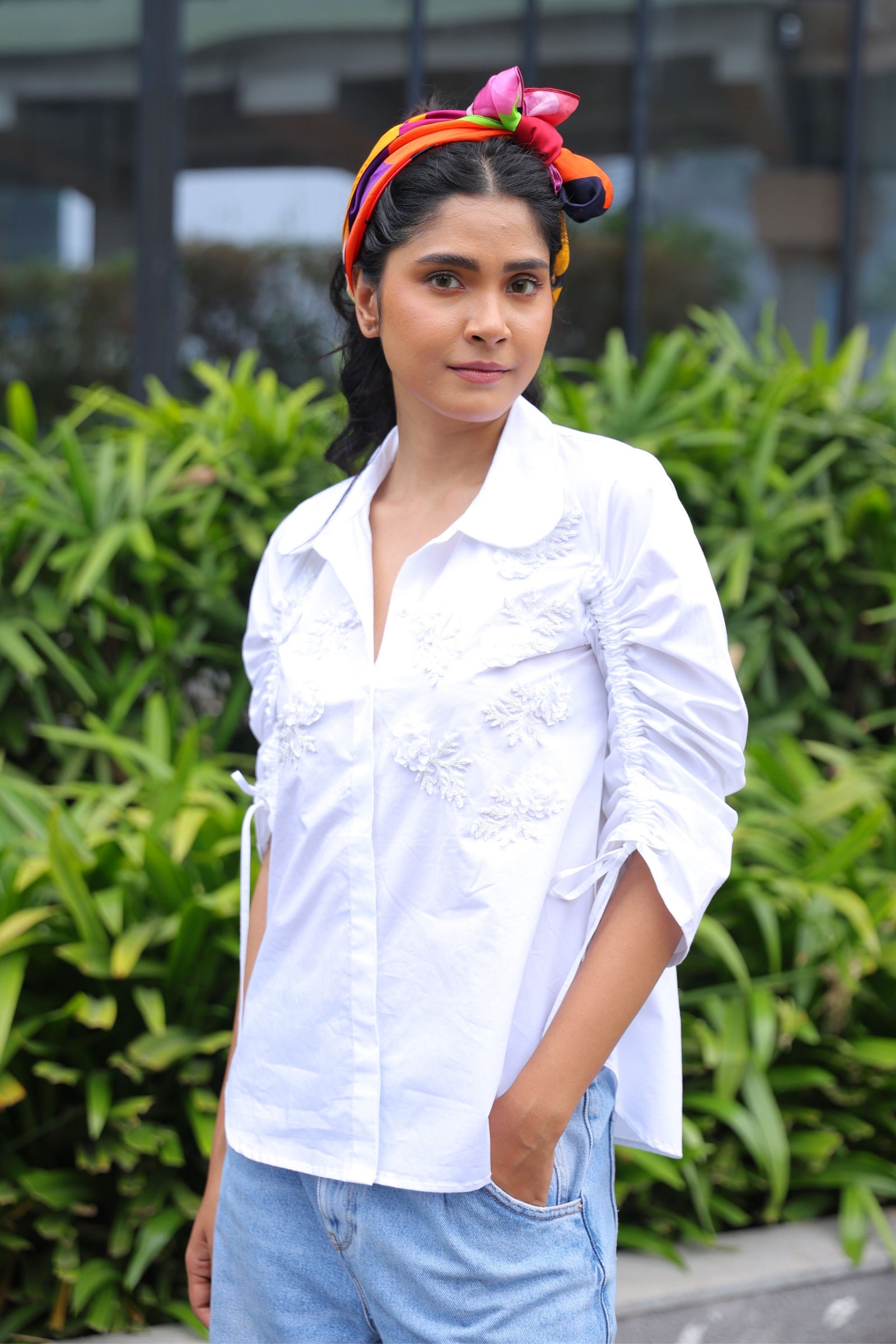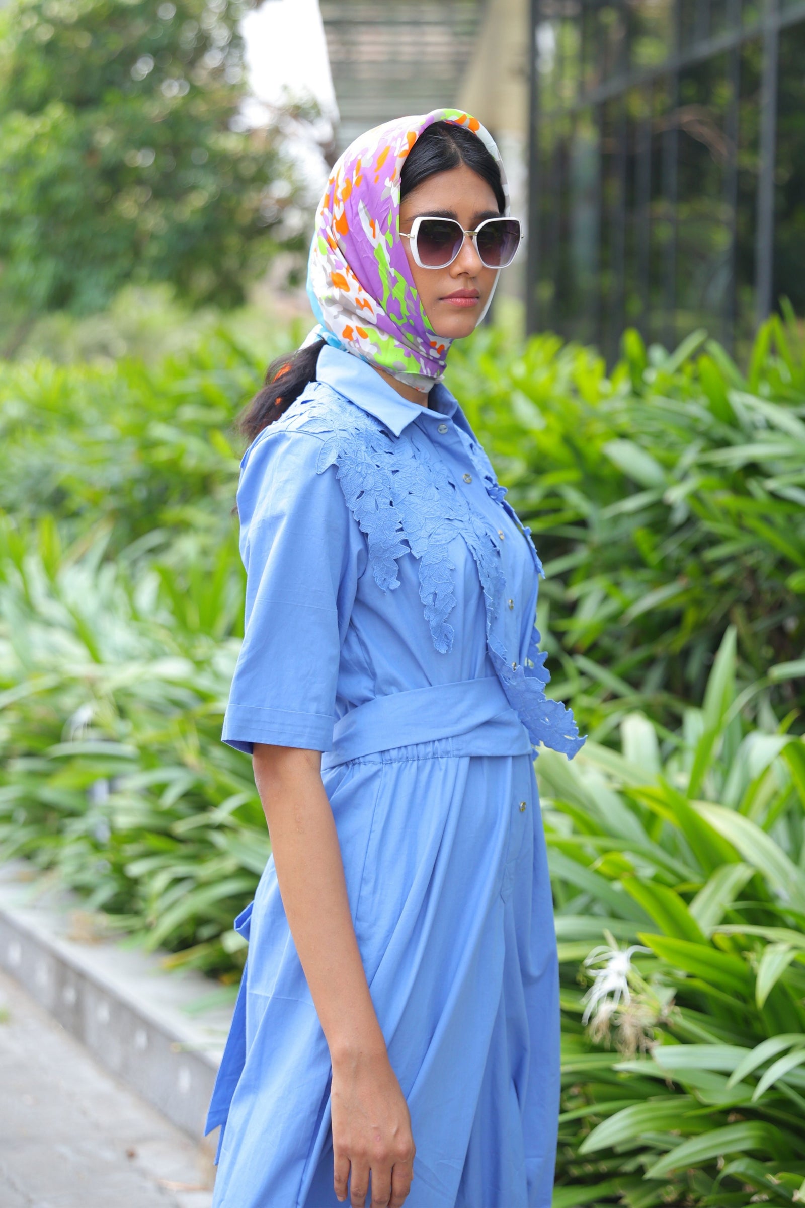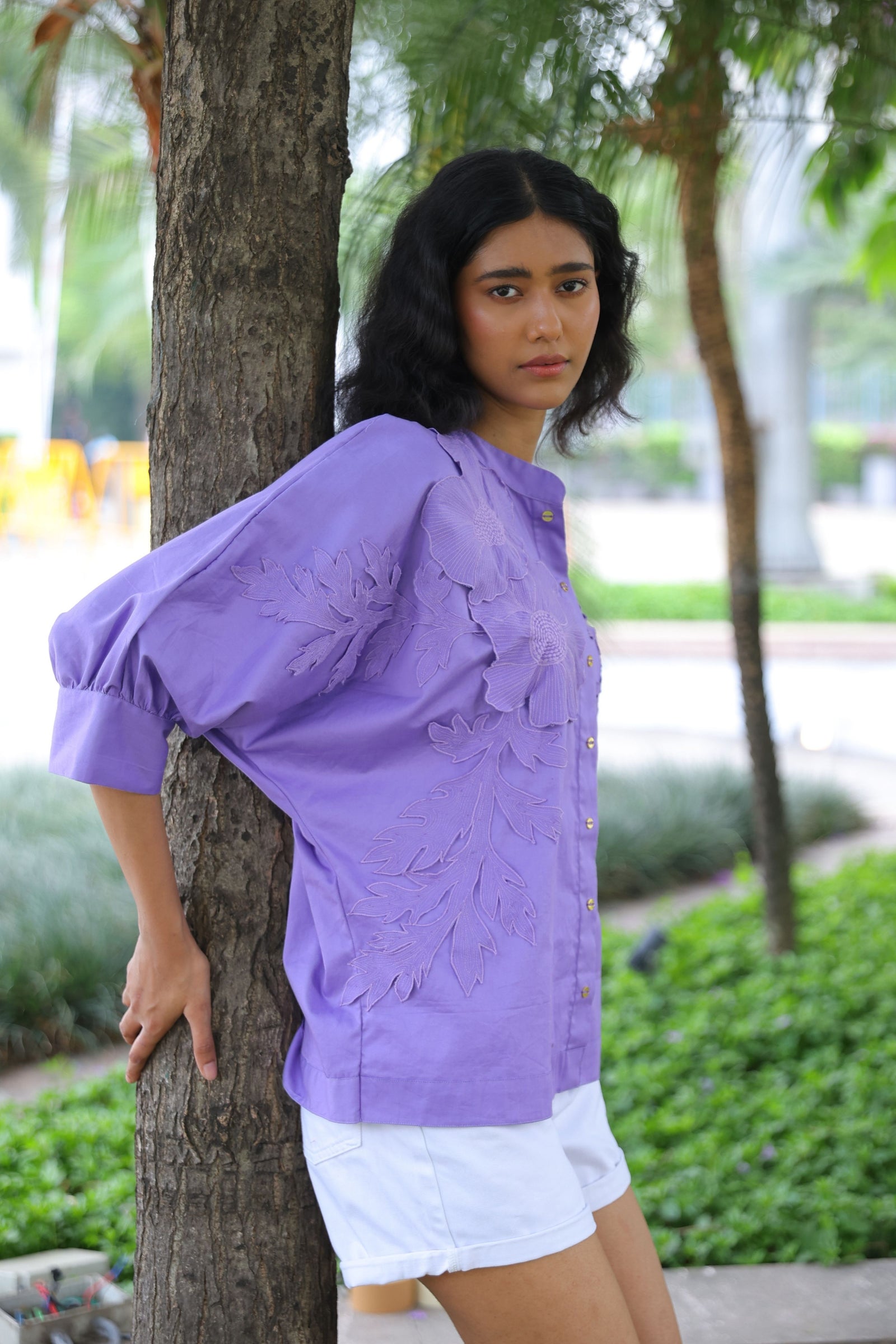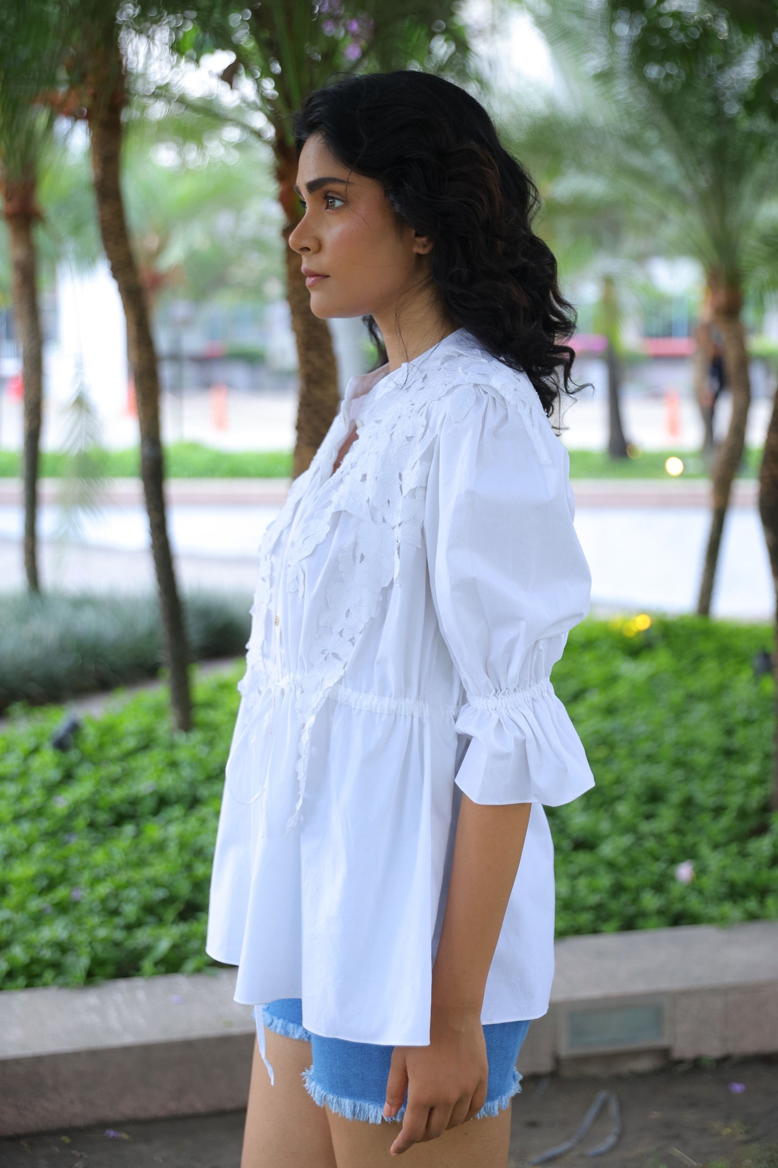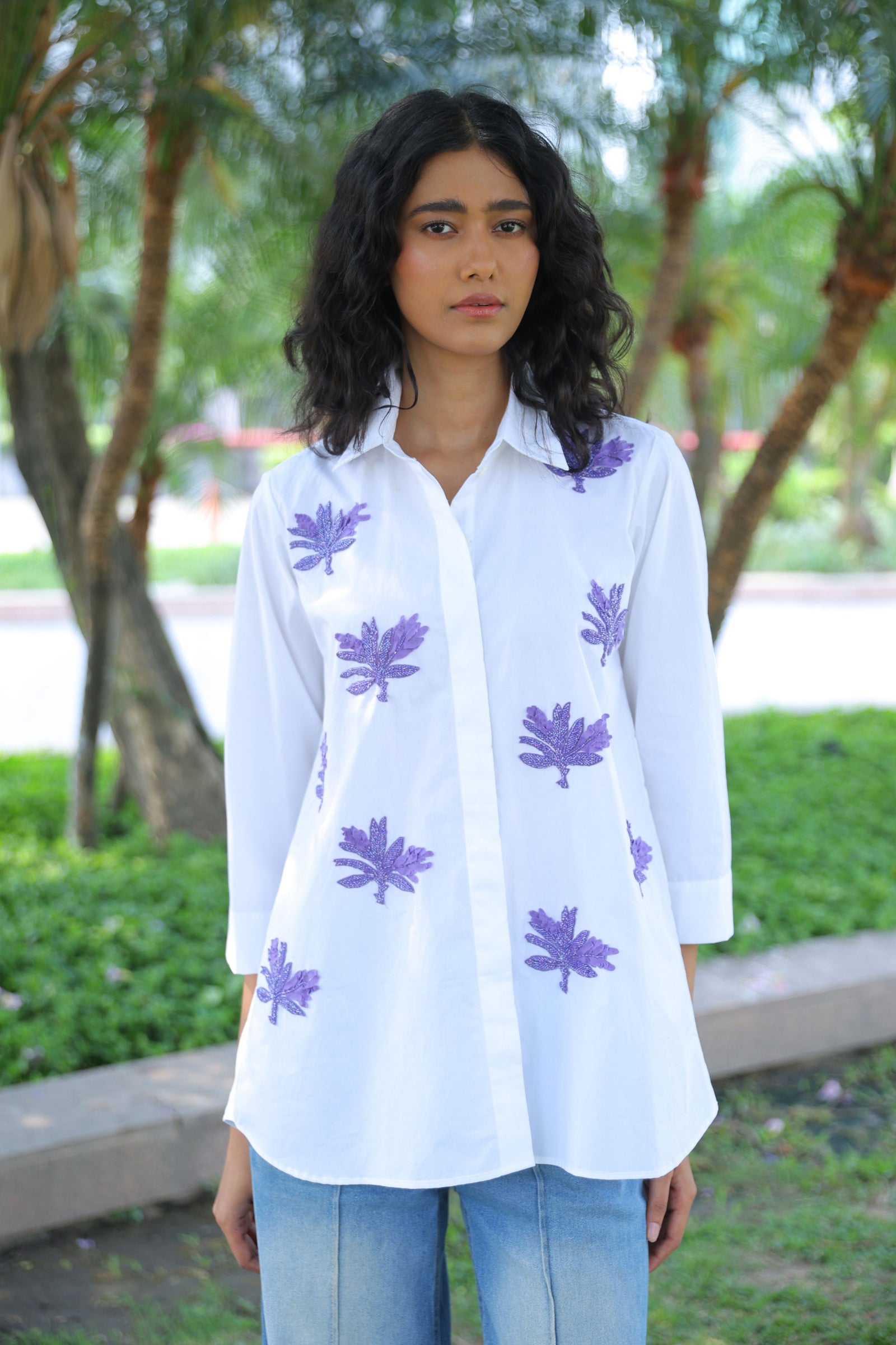 • Three tiered frill dress having hand crafted golden rivet details with front button down placket, shirt collar and puff sleeves.