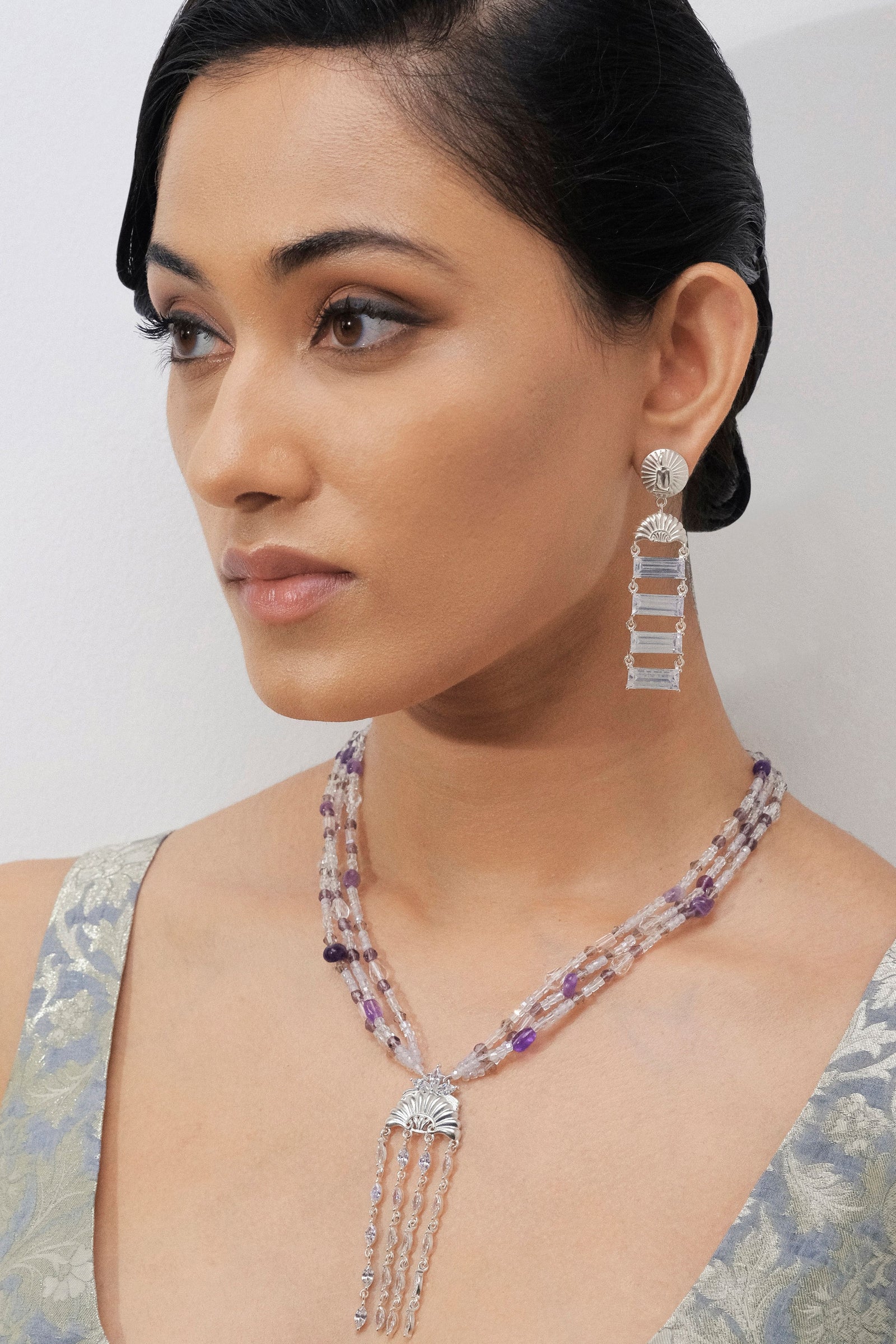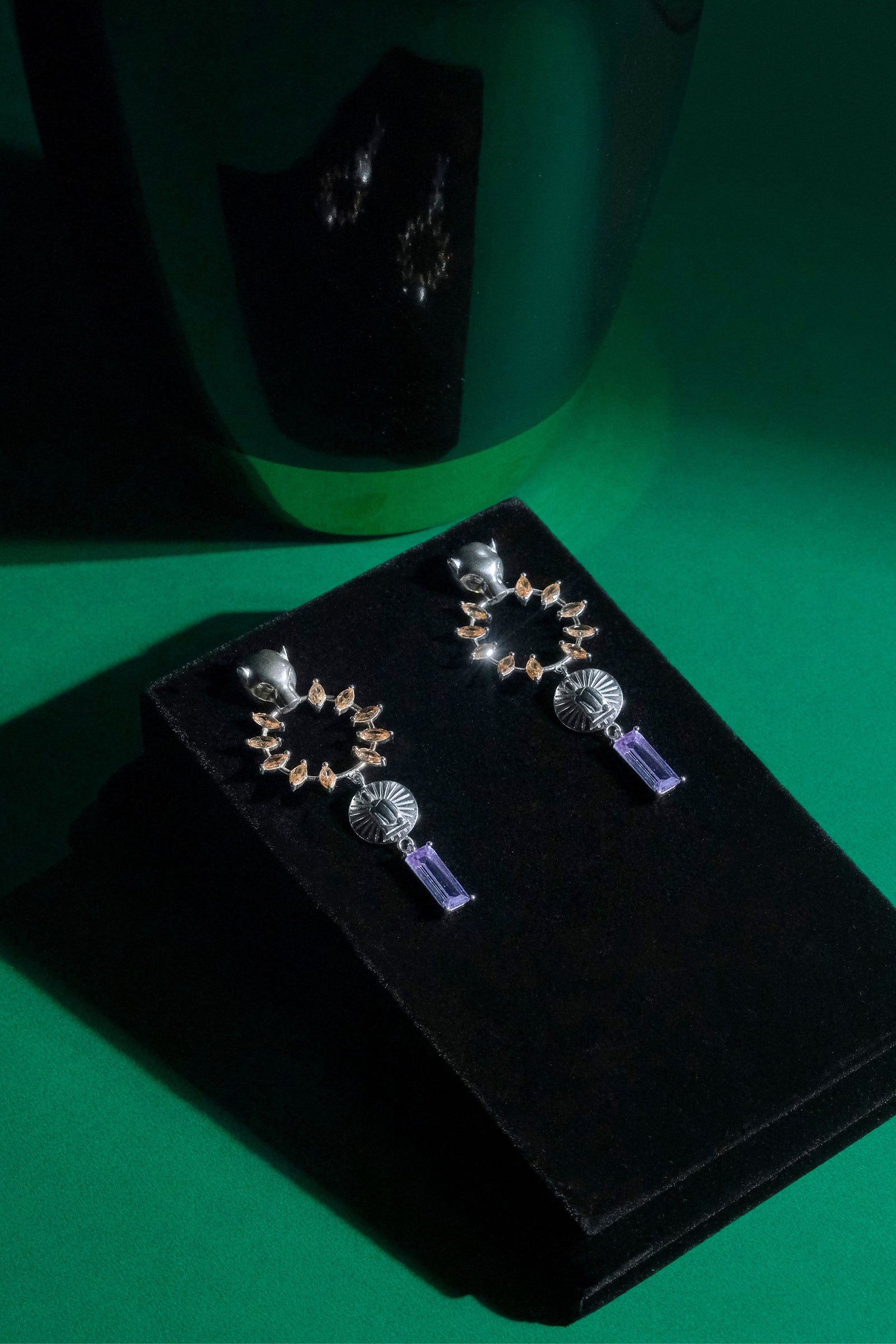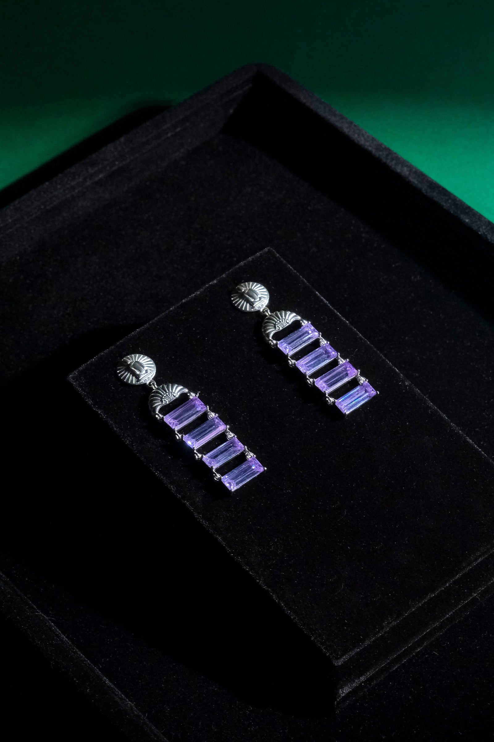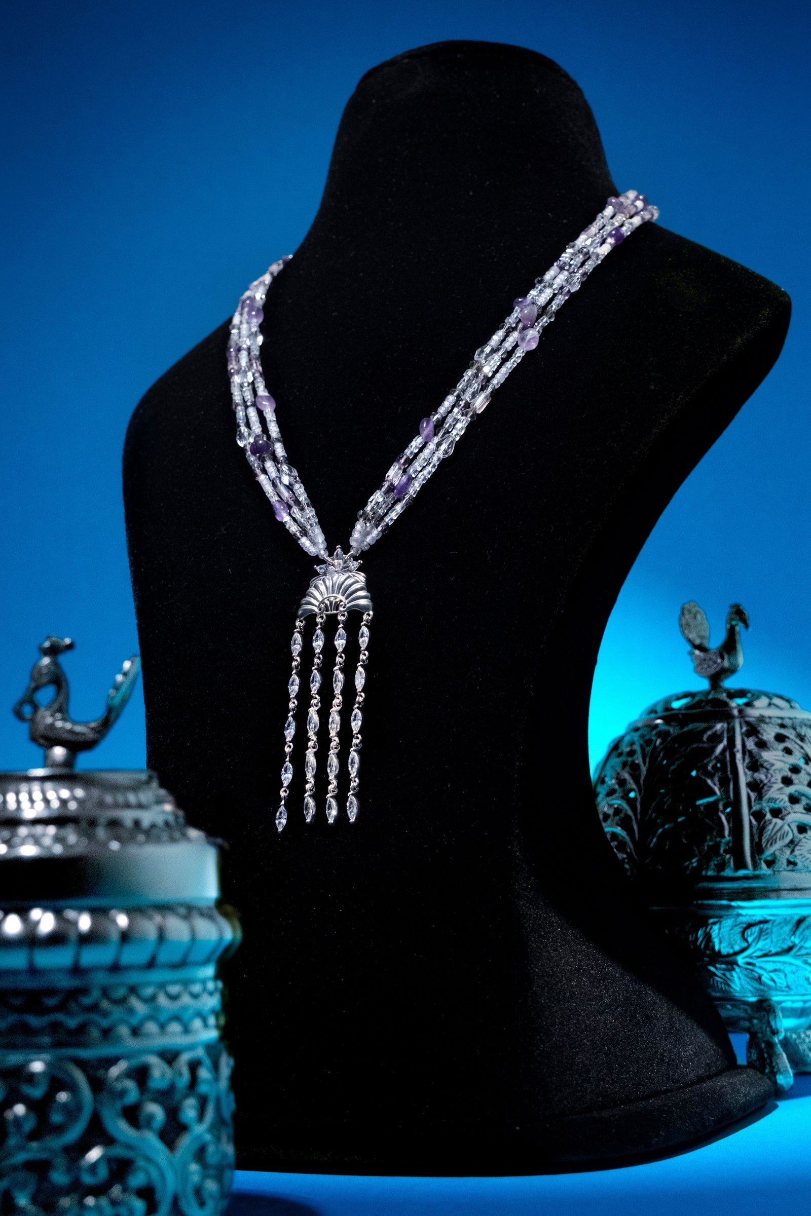 • A dazzling purple crystal sits proudly on a sublime platform, just like a mausoleum sitting on its bed of marble. Carefully engraved apara disum brand logo further adds grace and allure to this minimalistic pendant.