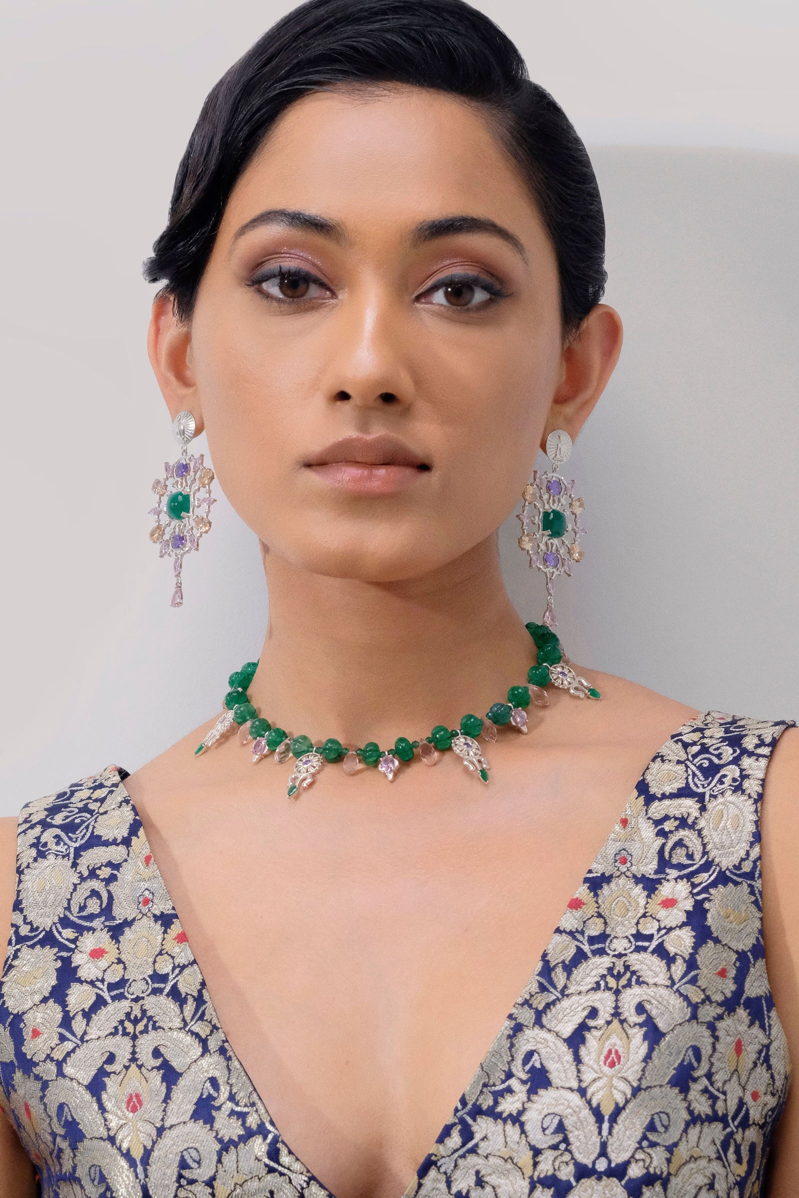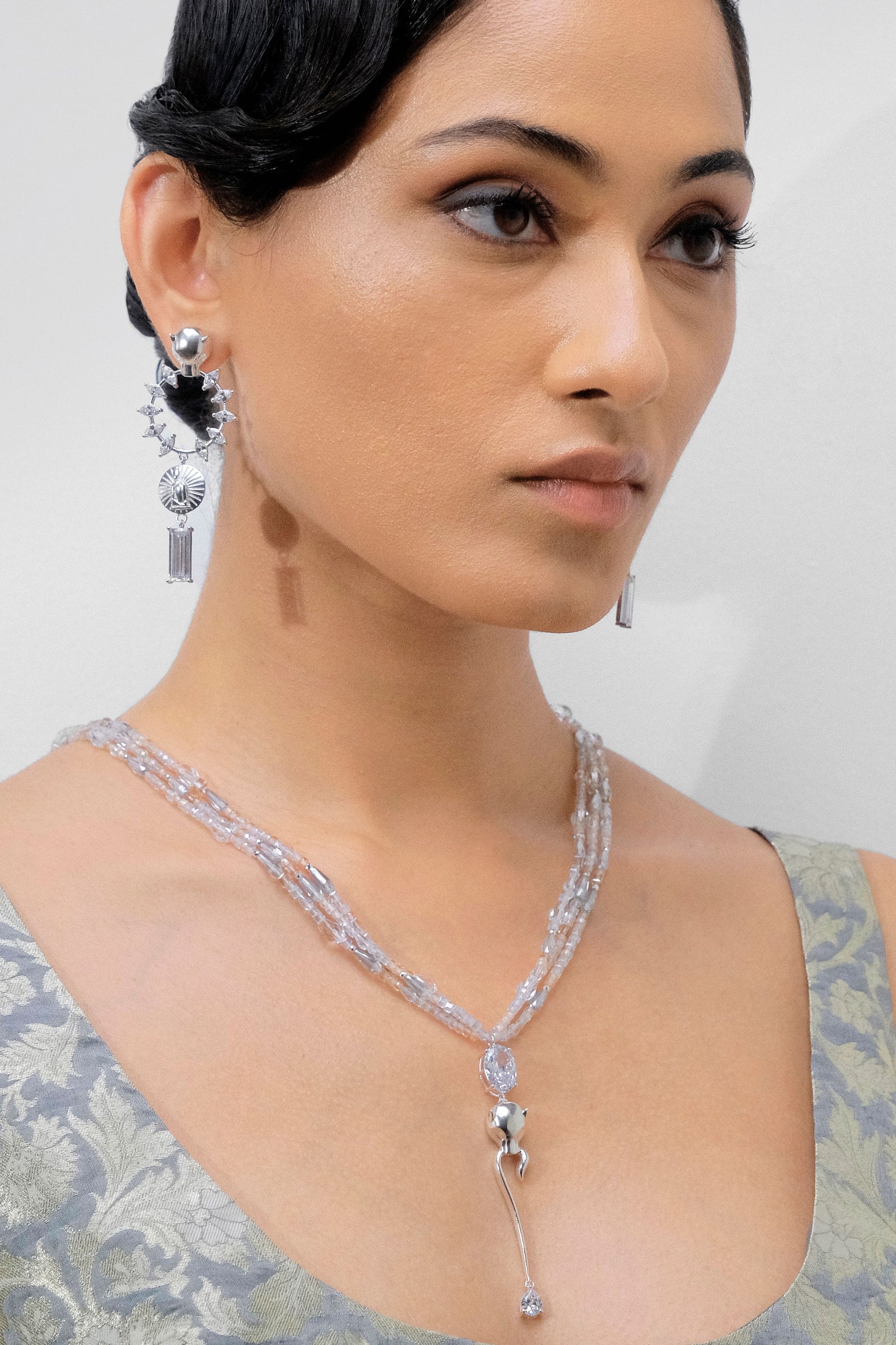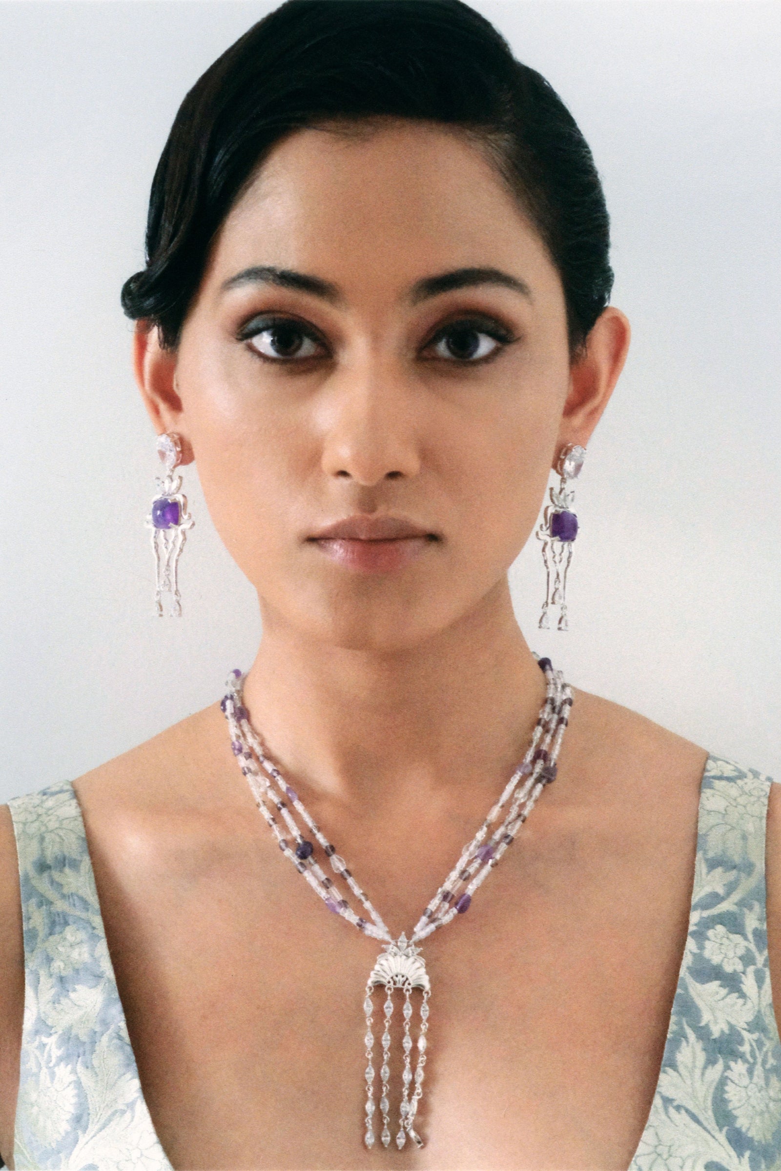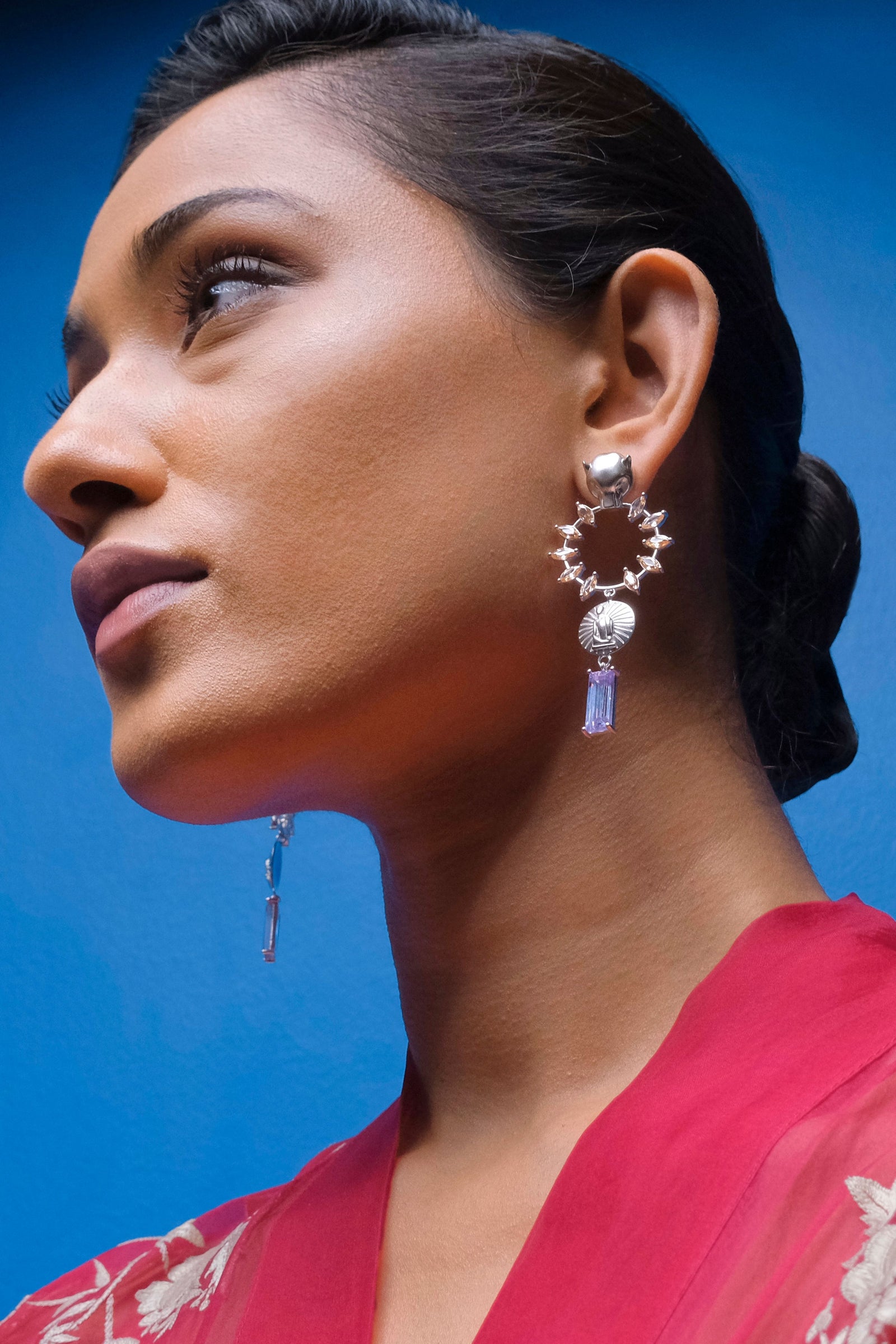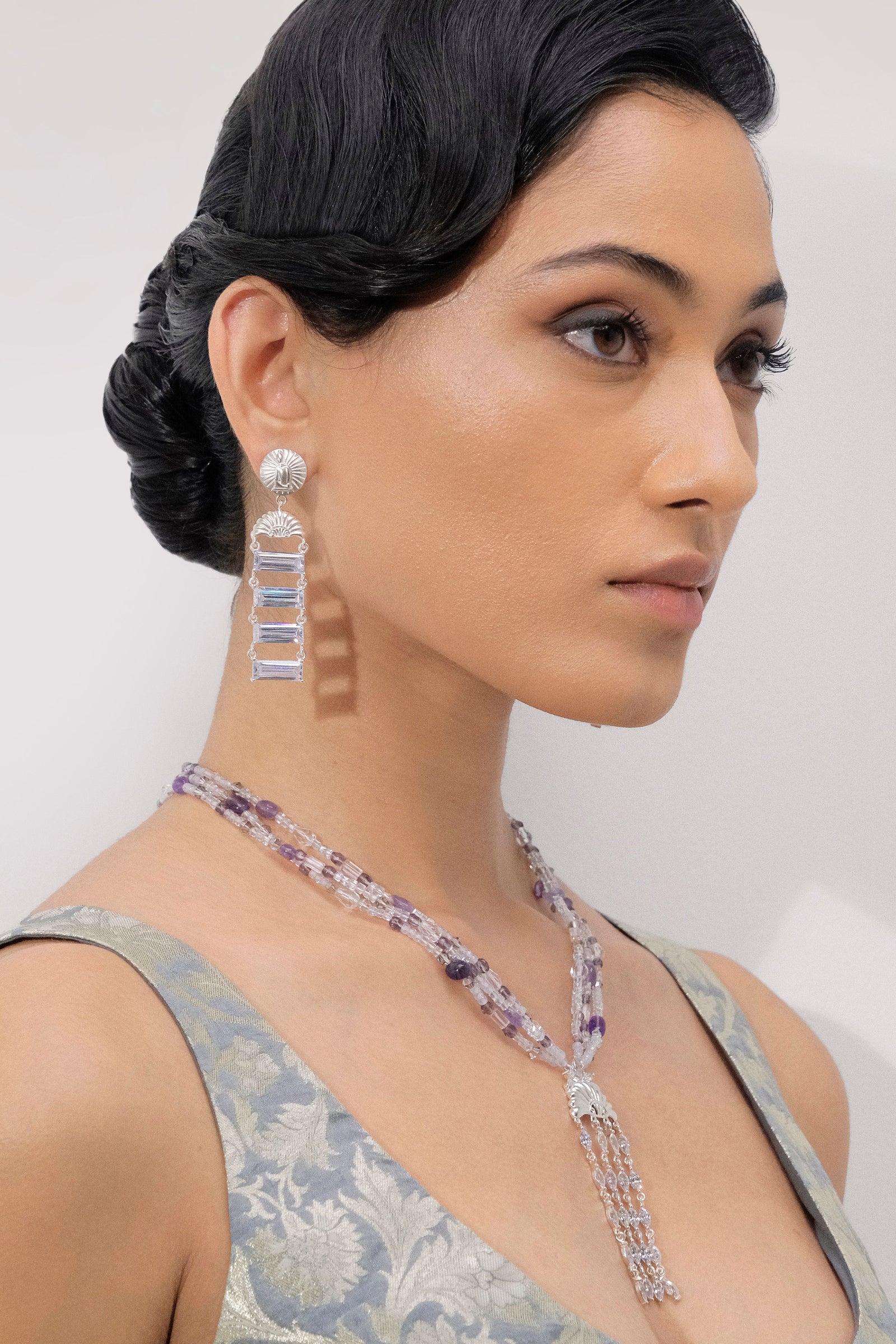 • A dazzling purple crystal sits proudly on a sublime platform, just like a mausoleum sitting on its bed of marble. Carefully engraved apara disum brand logo further adds grace and allure to this minimalistic pendant.