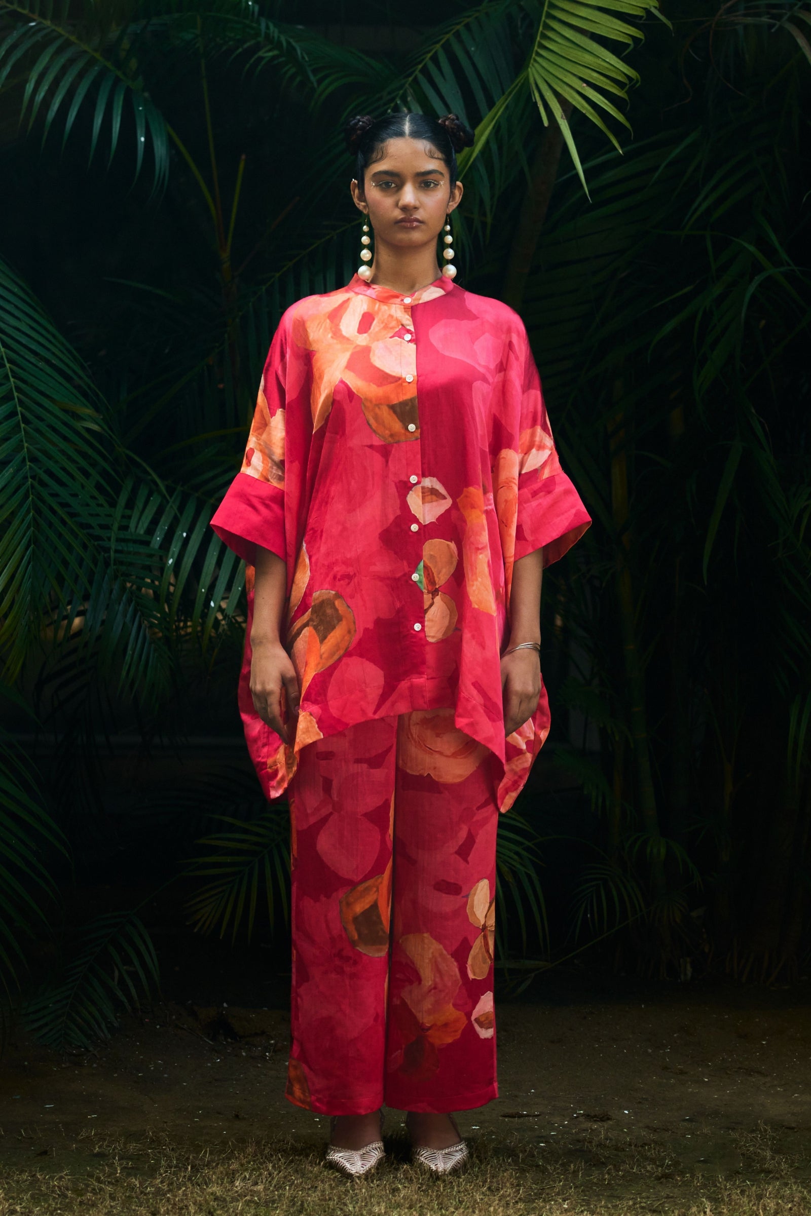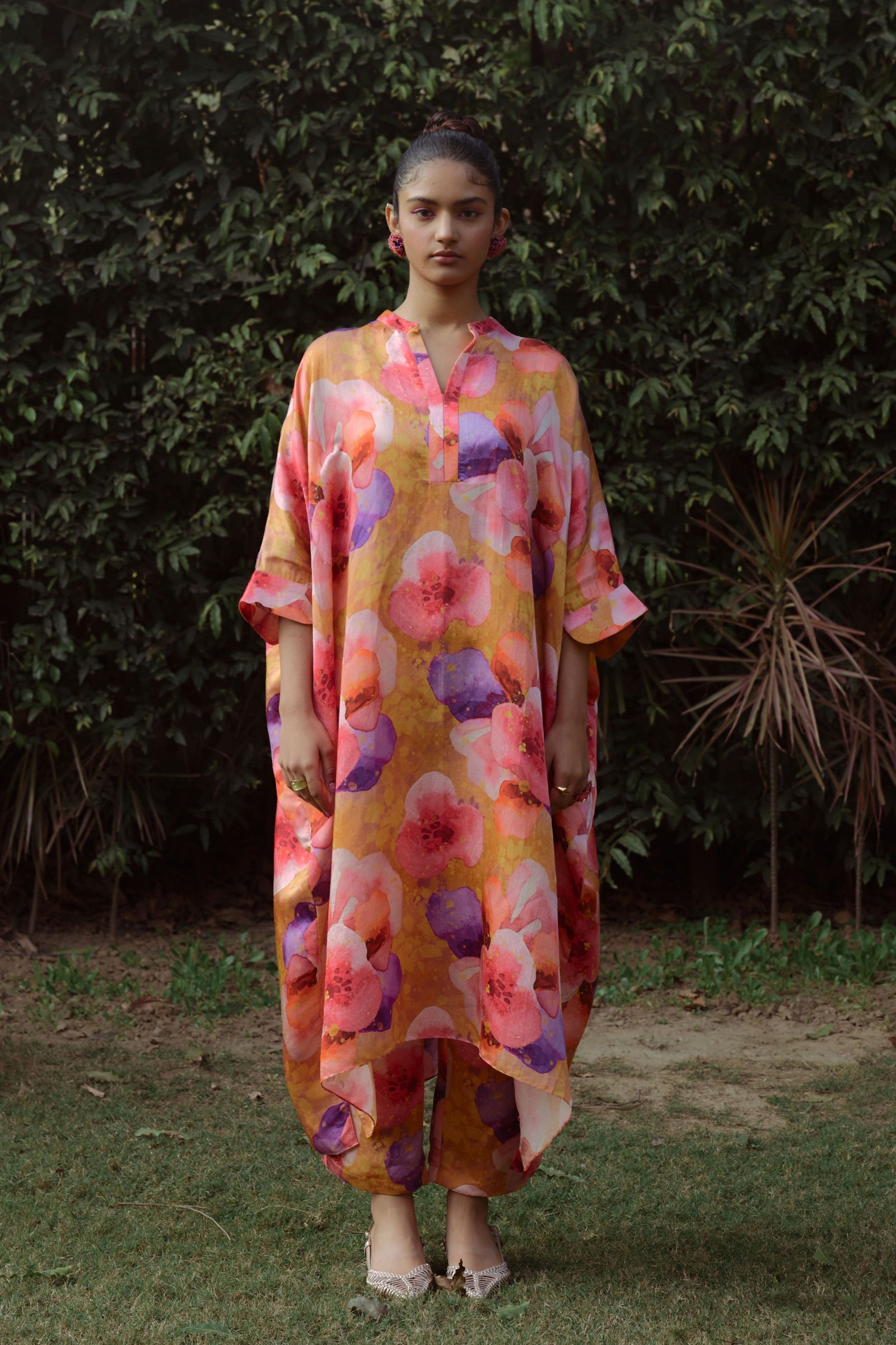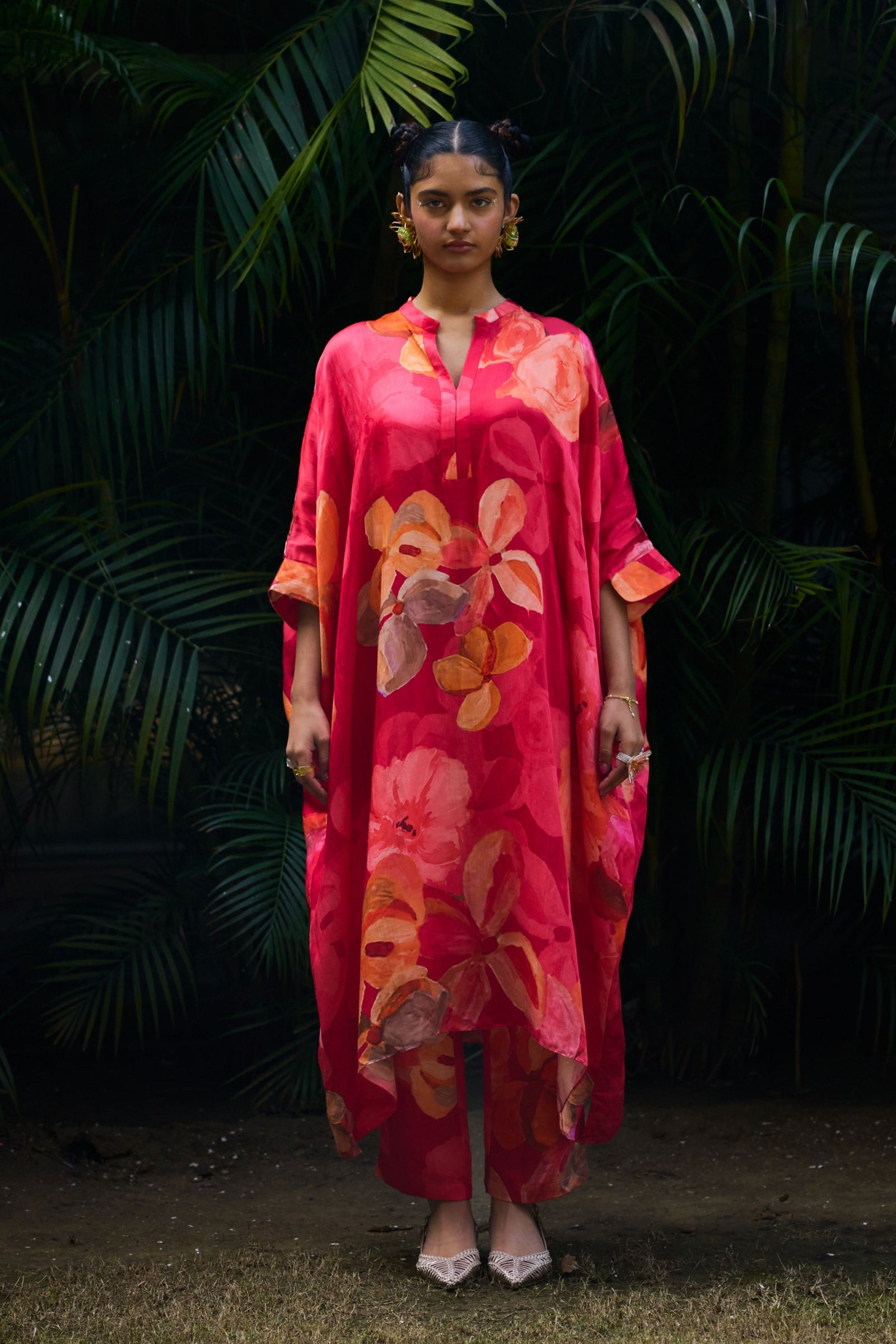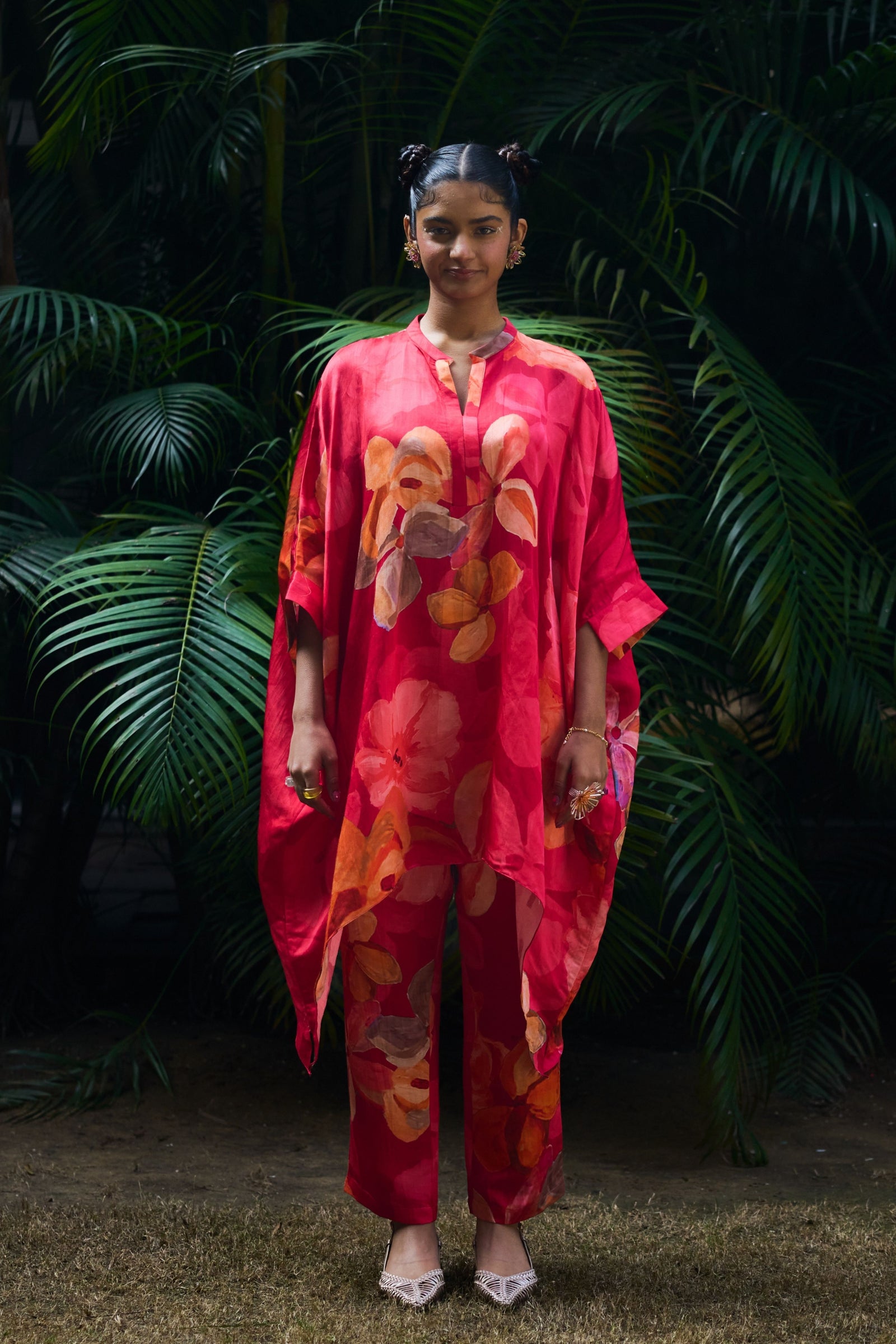 • The Pink Linen Satin Kaftan Set in Mulitihued Print highlights effortless elegance with its relaxed short kaftan and wide-leg pants. The abstract motifs add a dynamic touch, enhancing the linen satinÆs sheen. A refined choice for getaways.