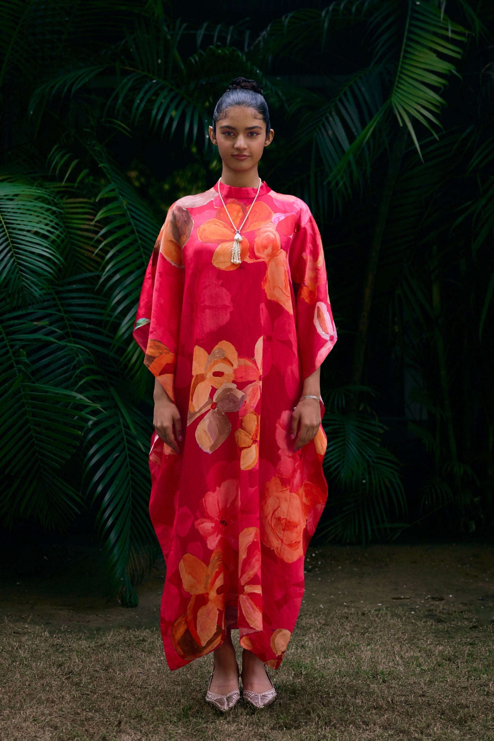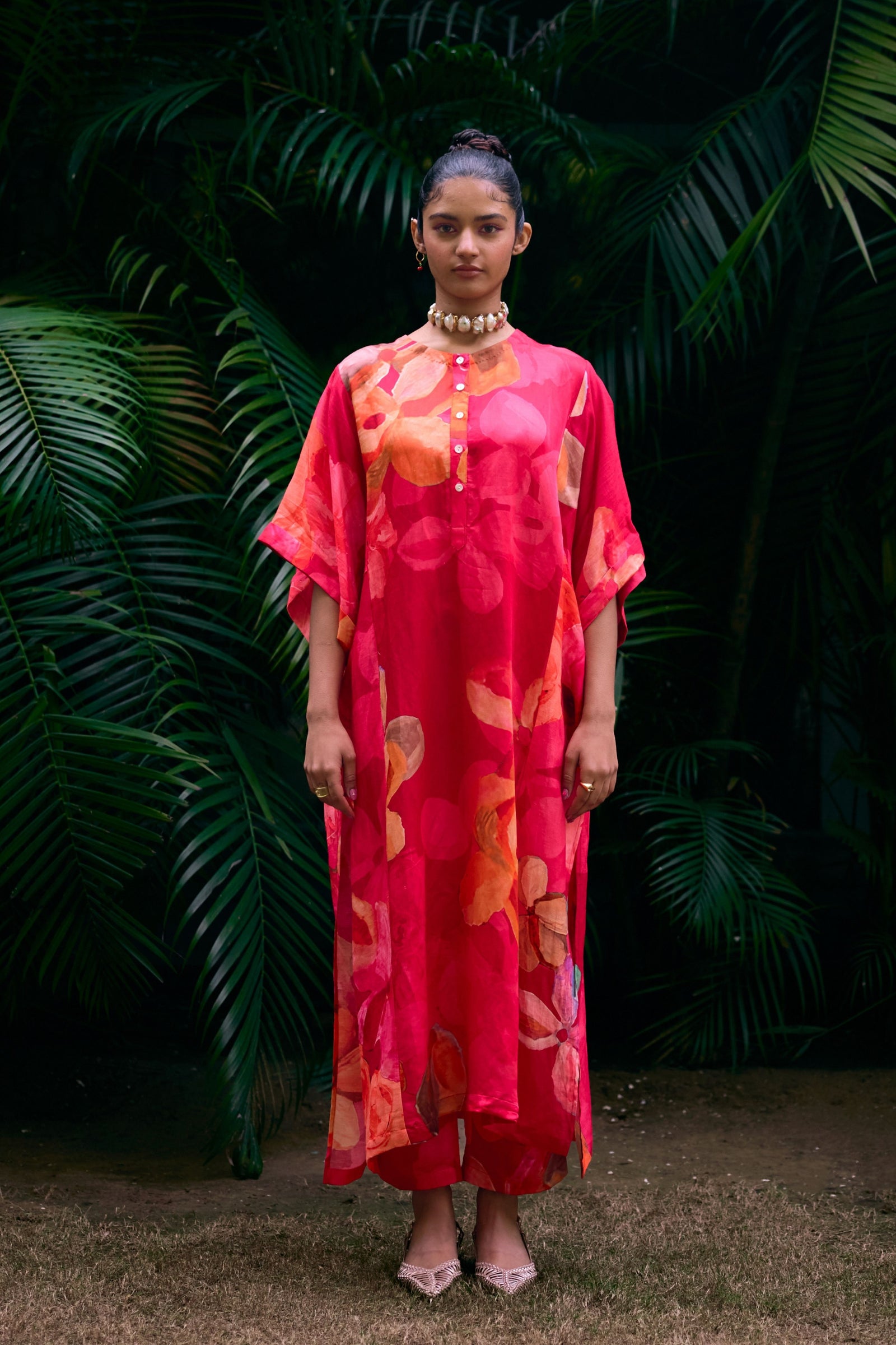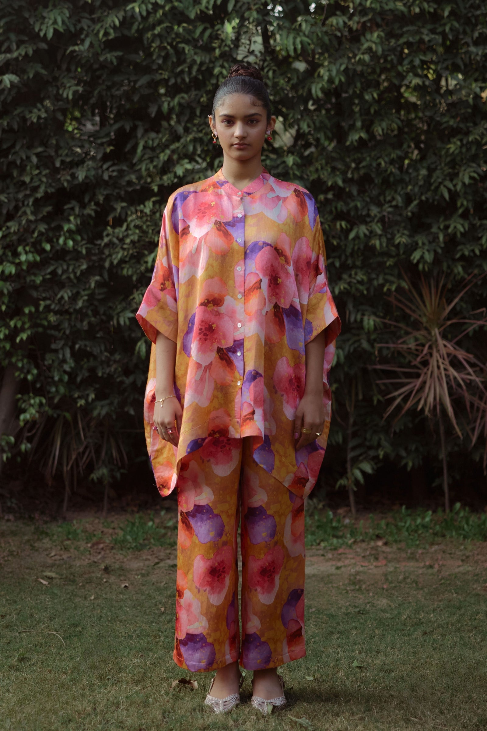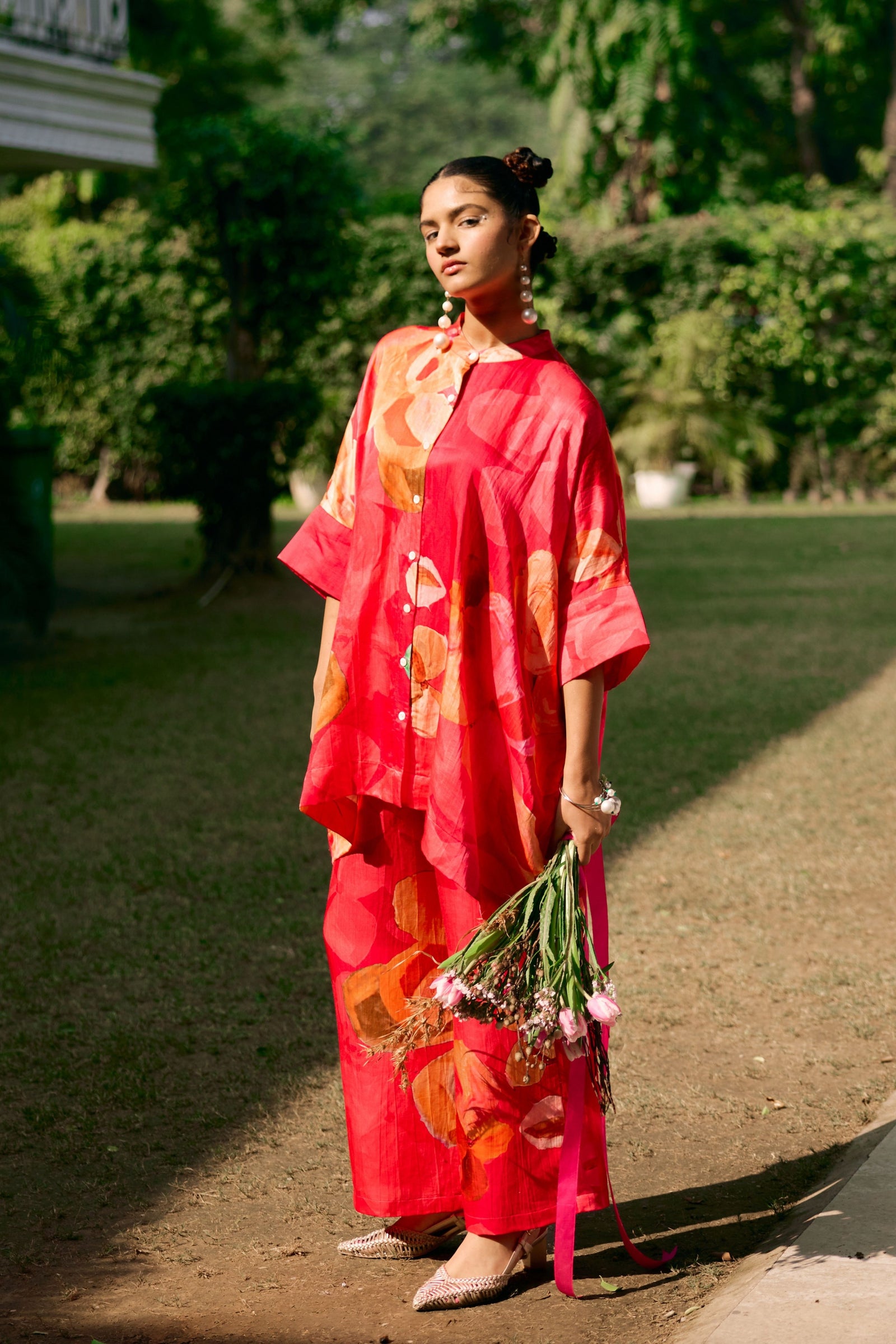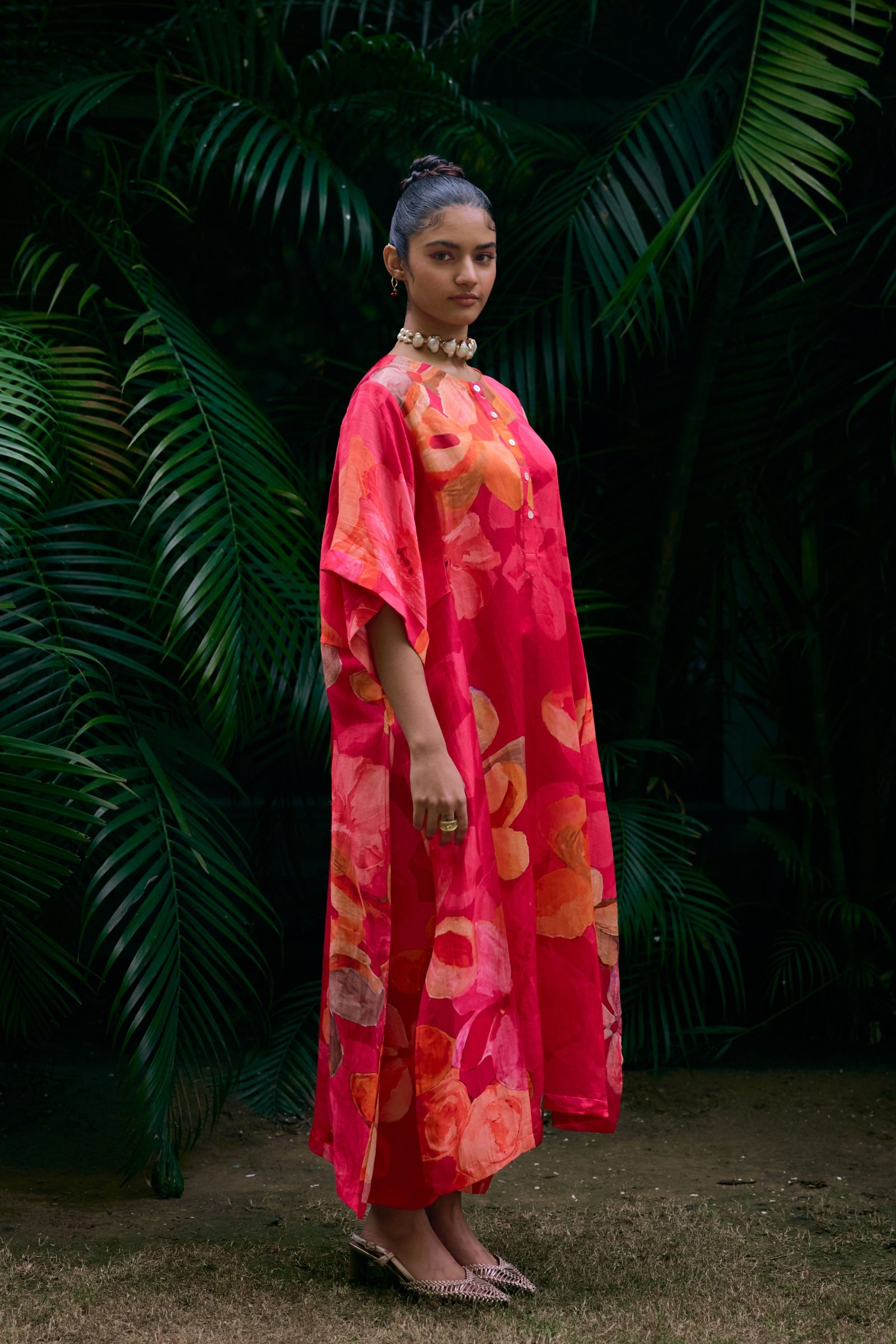 • The Pink Linen Satin Kaftan Set in Mulitihued Print highlights effortless elegance with its relaxed short kaftan and wide-leg pants. The abstract motifs add a dynamic touch, enhancing the linen satinÆs sheen. A refined choice for getaways.