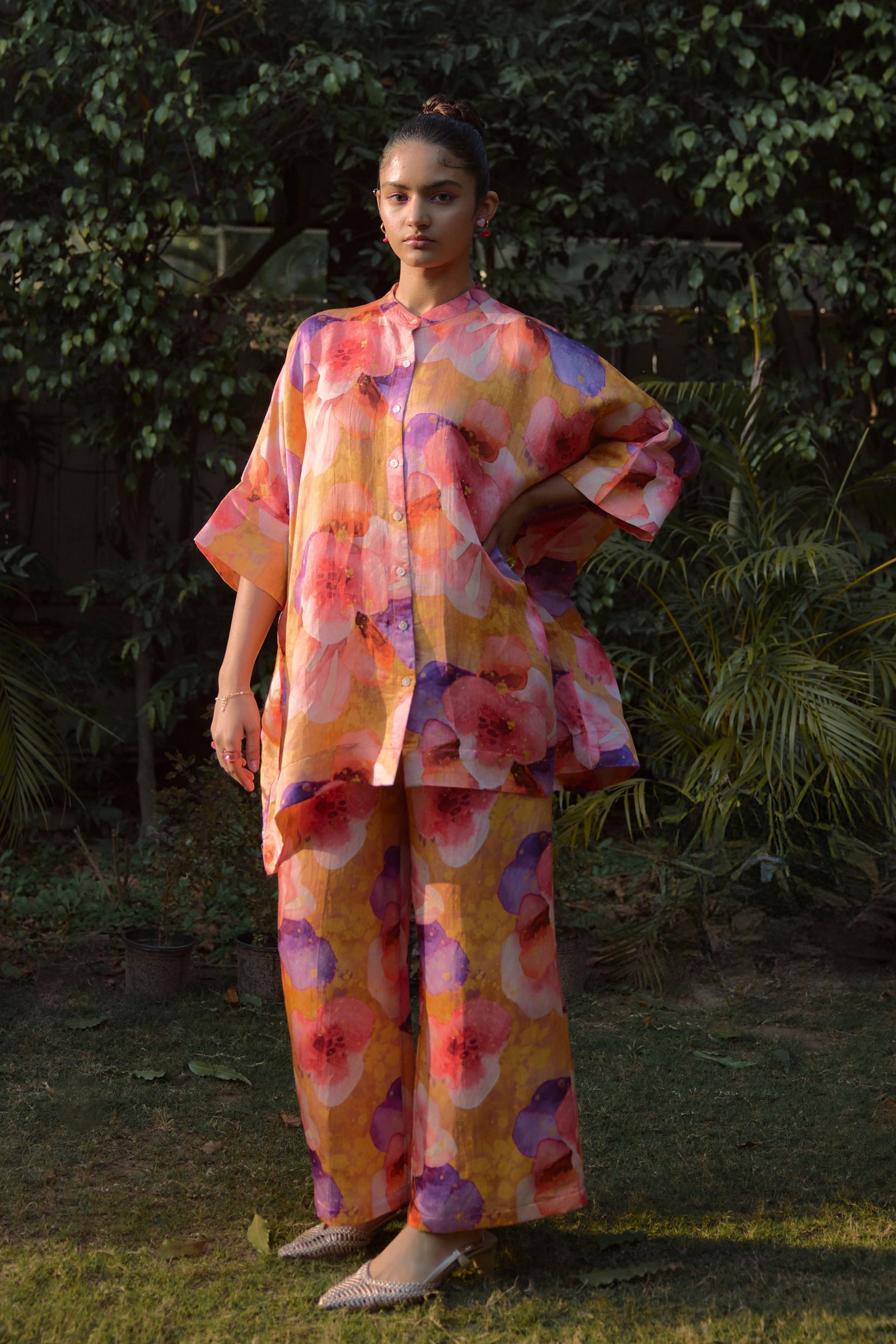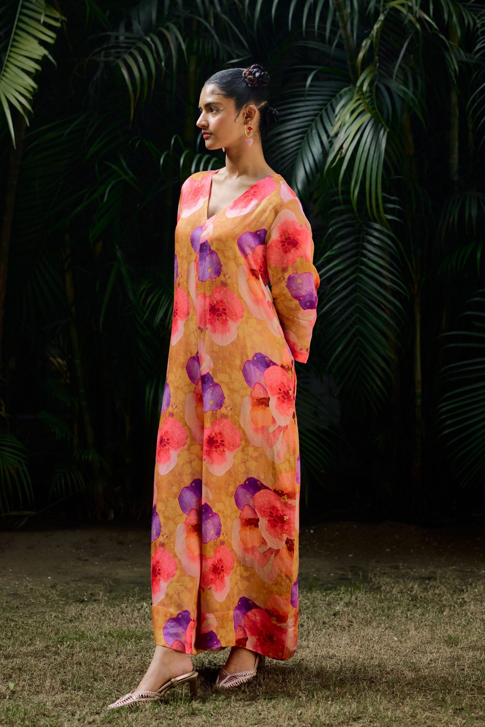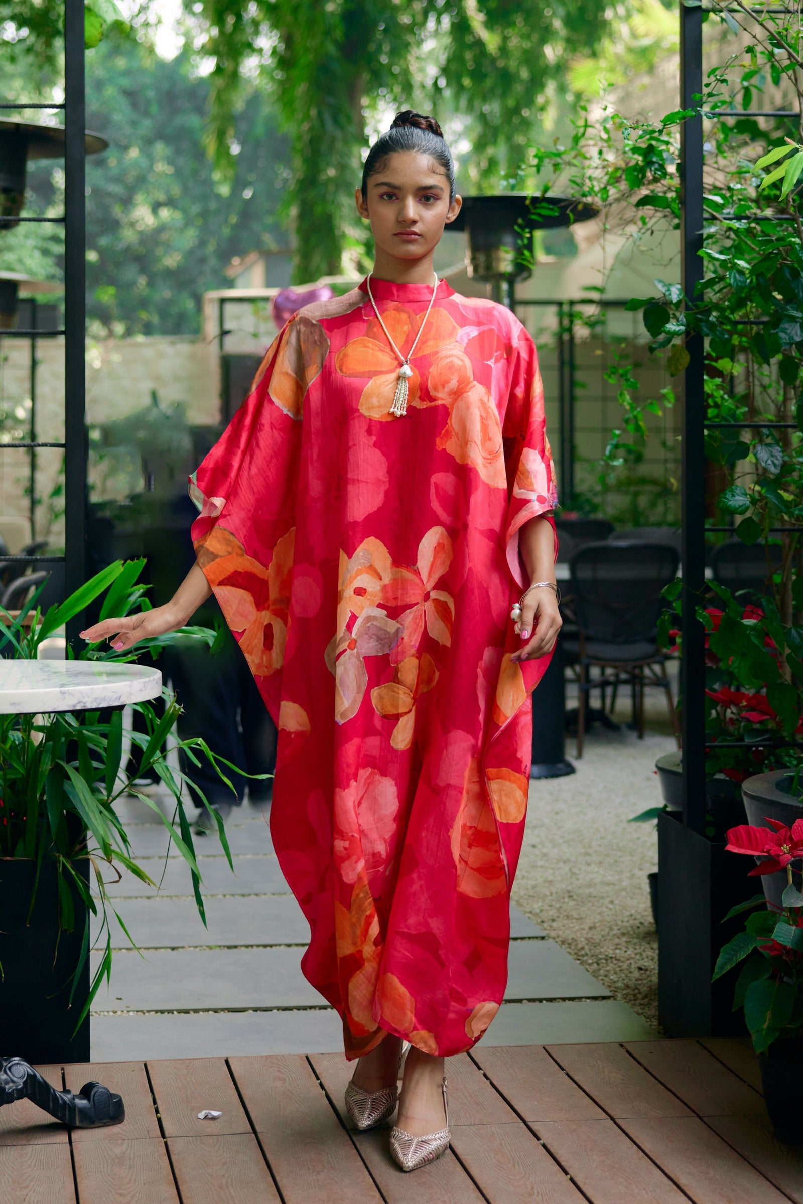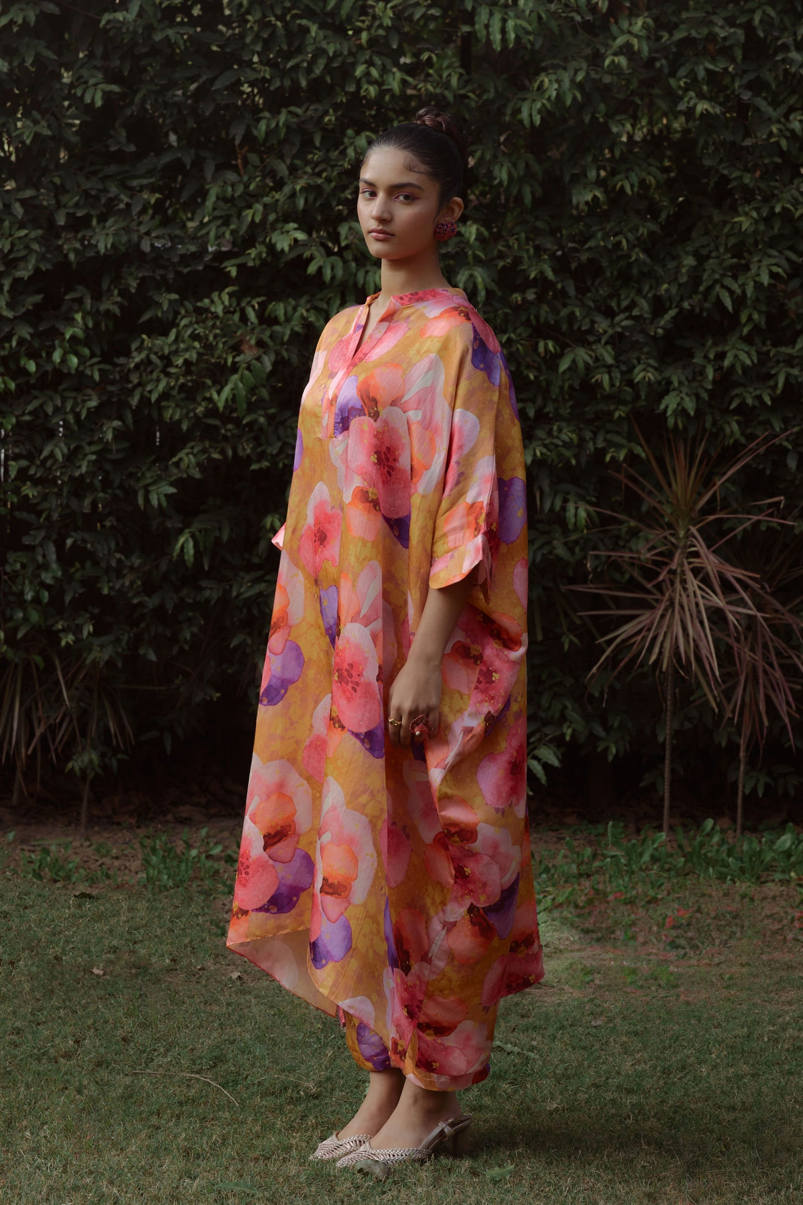 • The Pink Linen Satin Kaftan Set in Mulitihued Print highlights effortless elegance with its relaxed short kaftan and wide-leg pants. The abstract motifs add a dynamic touch, enhancing the linen satinÆs sheen. A refined choice for getaways.