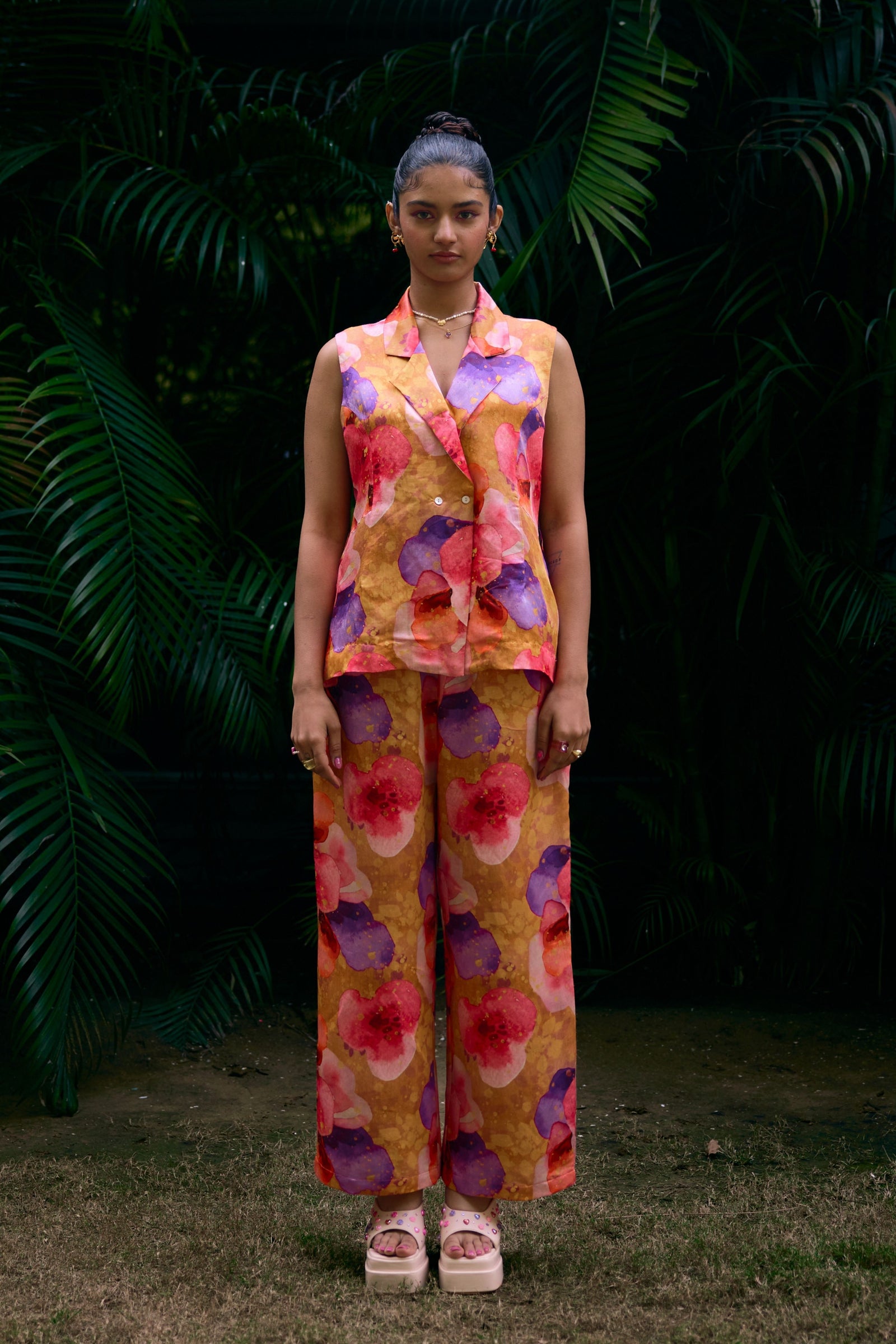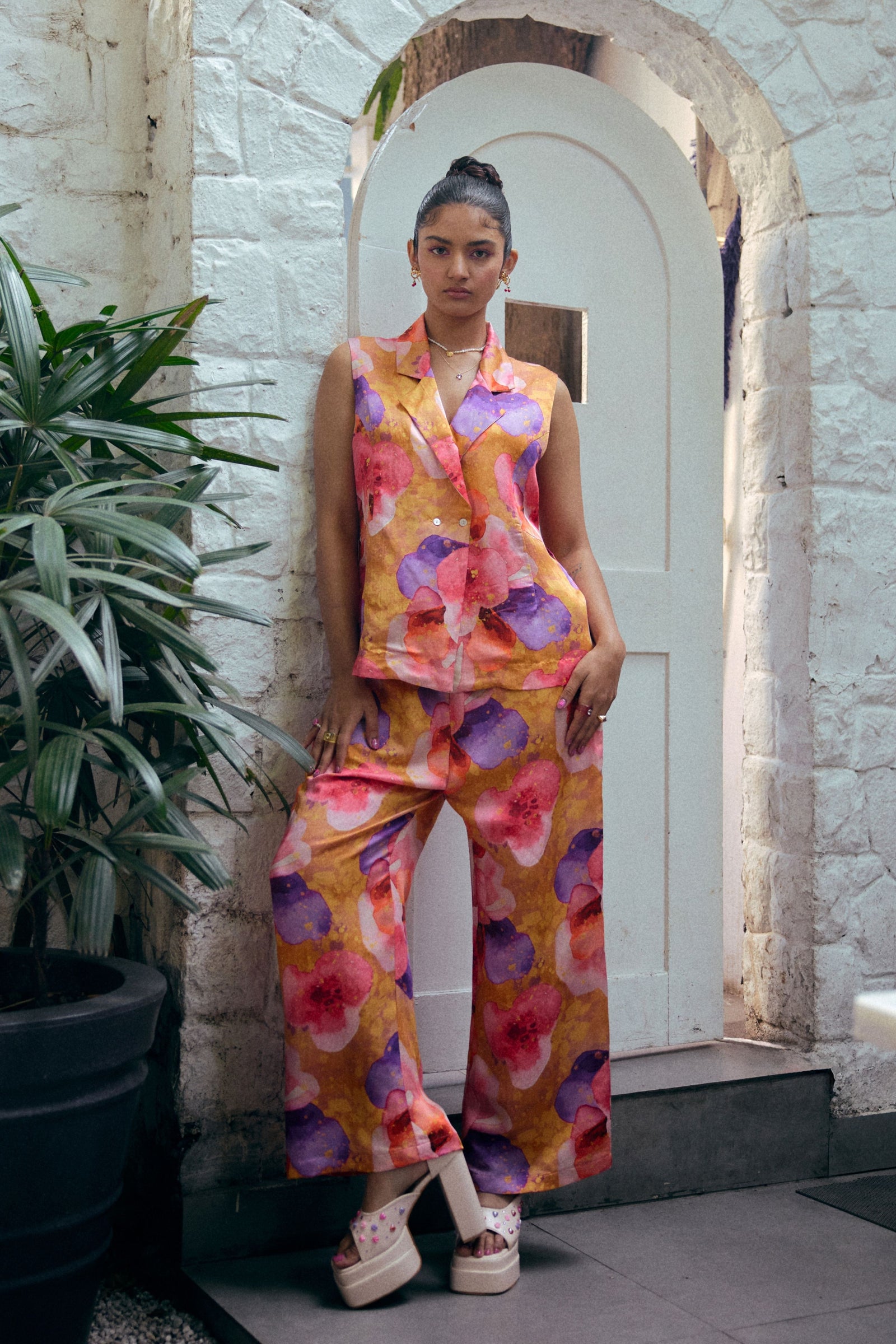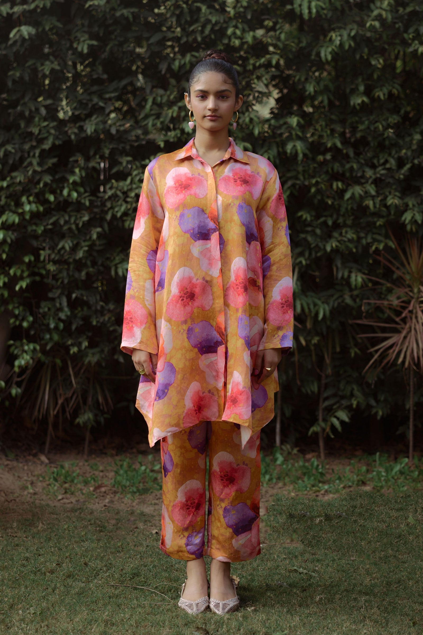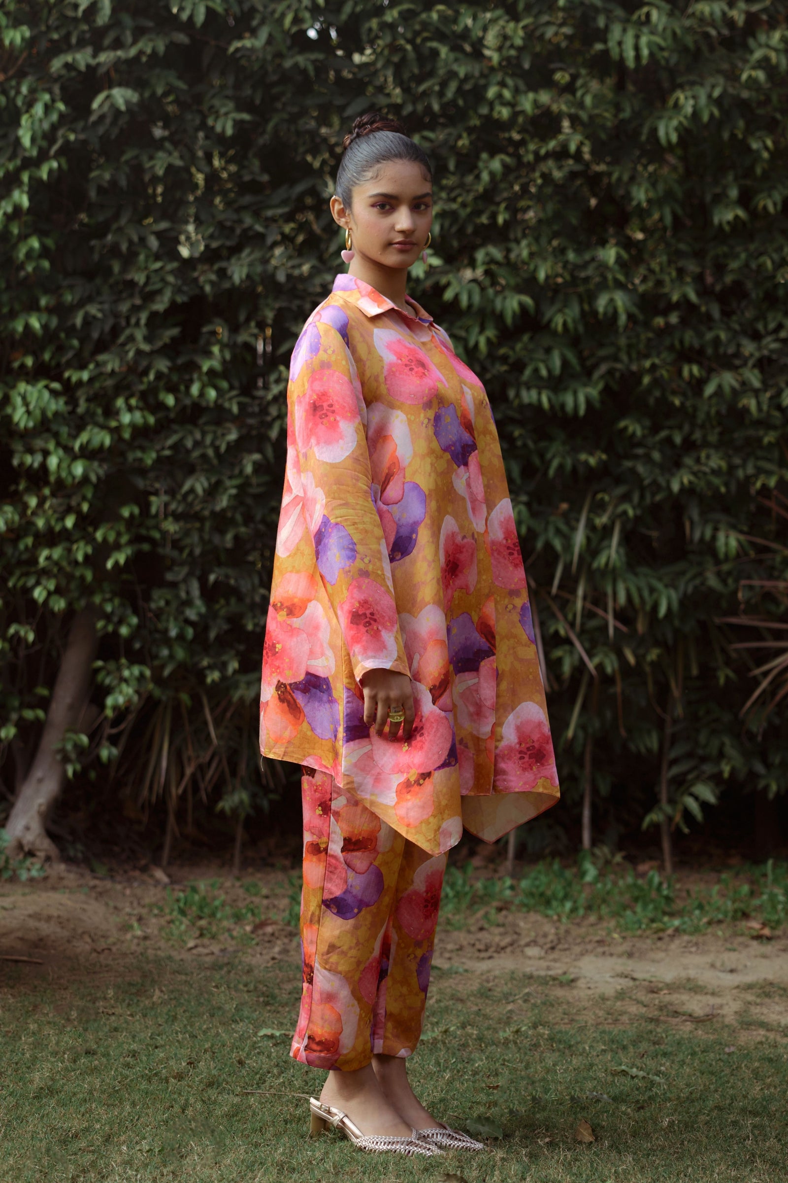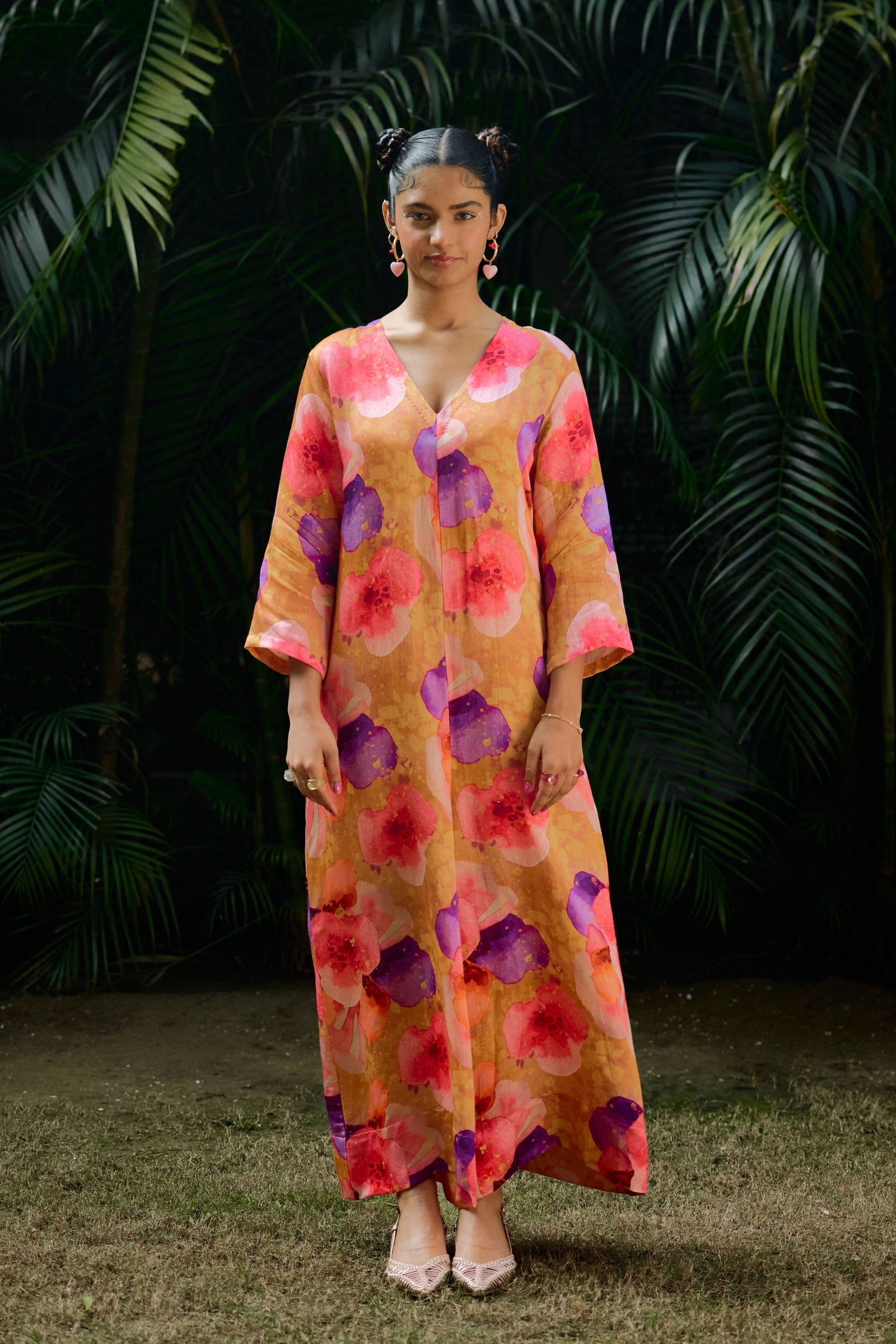 • The Pink Linen Satin Kaftan Set in Mulitihued Print highlights effortless elegance with its relaxed short kaftan and wide-leg pants. The abstract motifs add a dynamic touch, enhancing the linen satinÆs sheen. A refined choice for getaways.