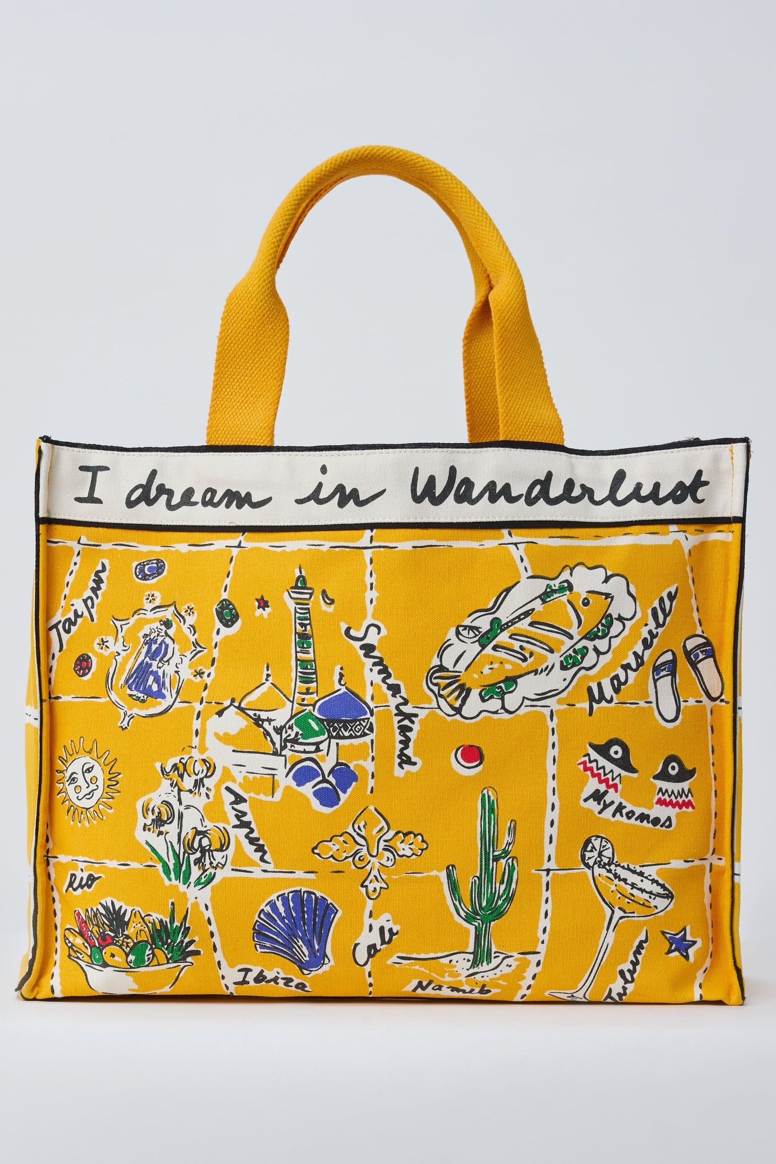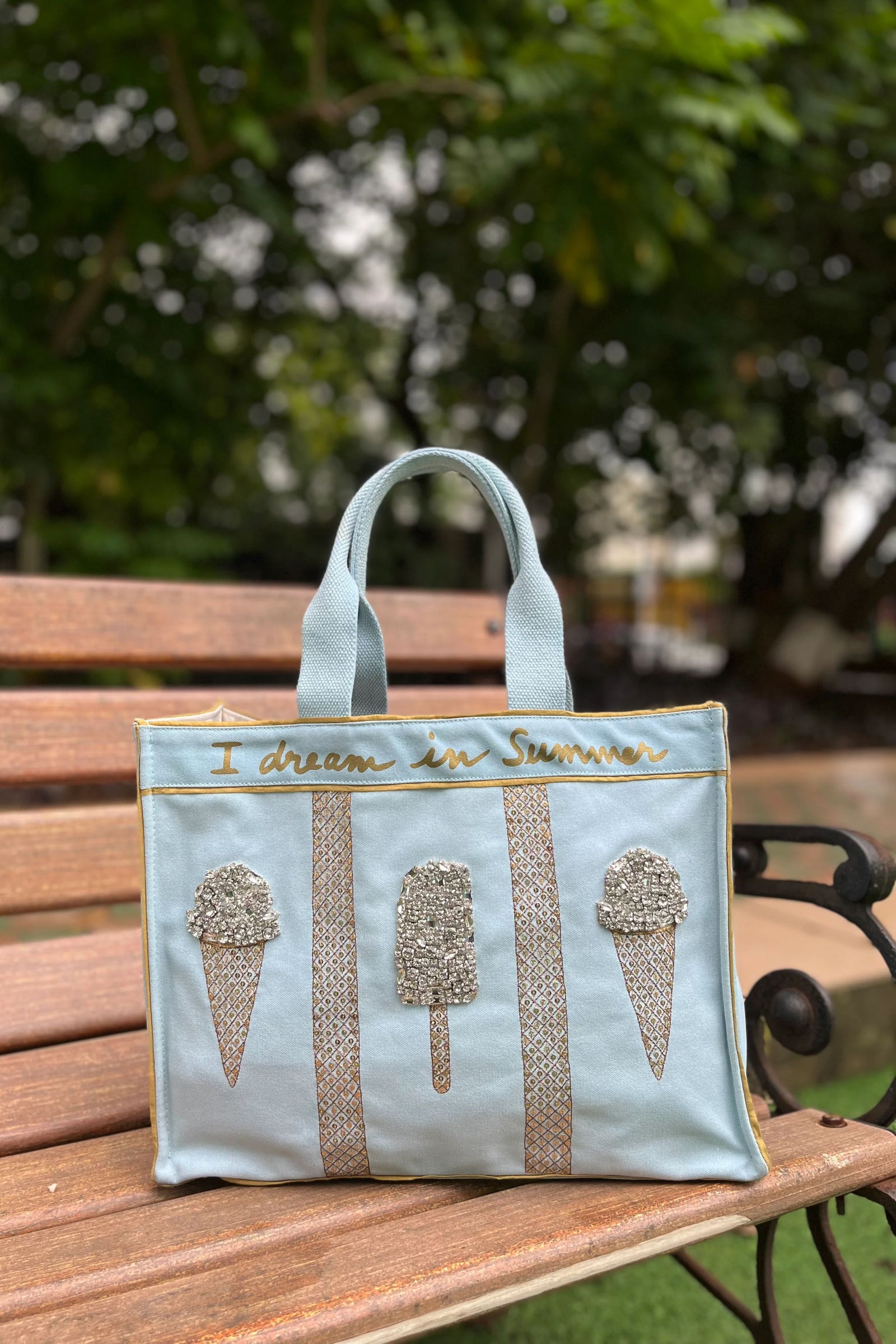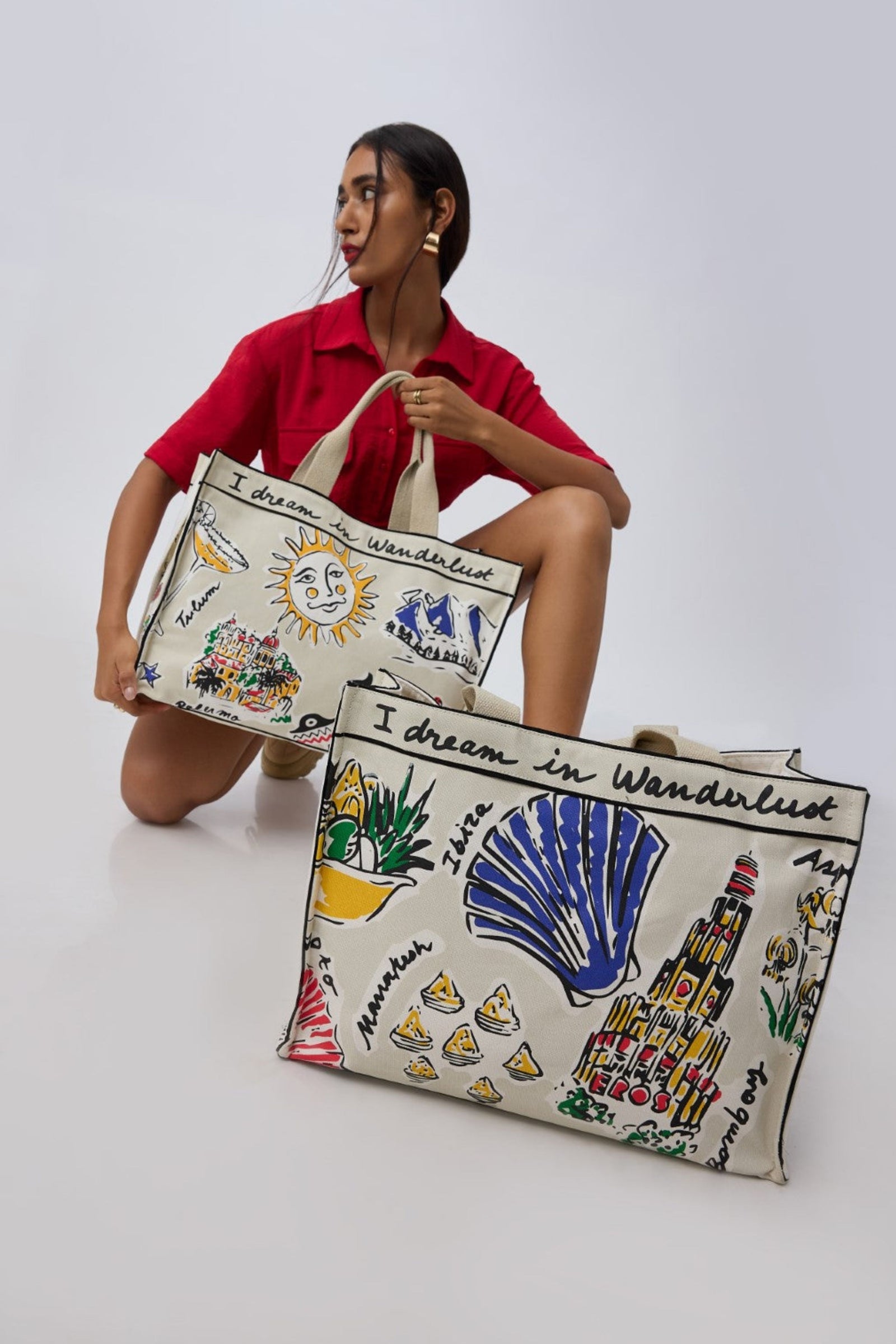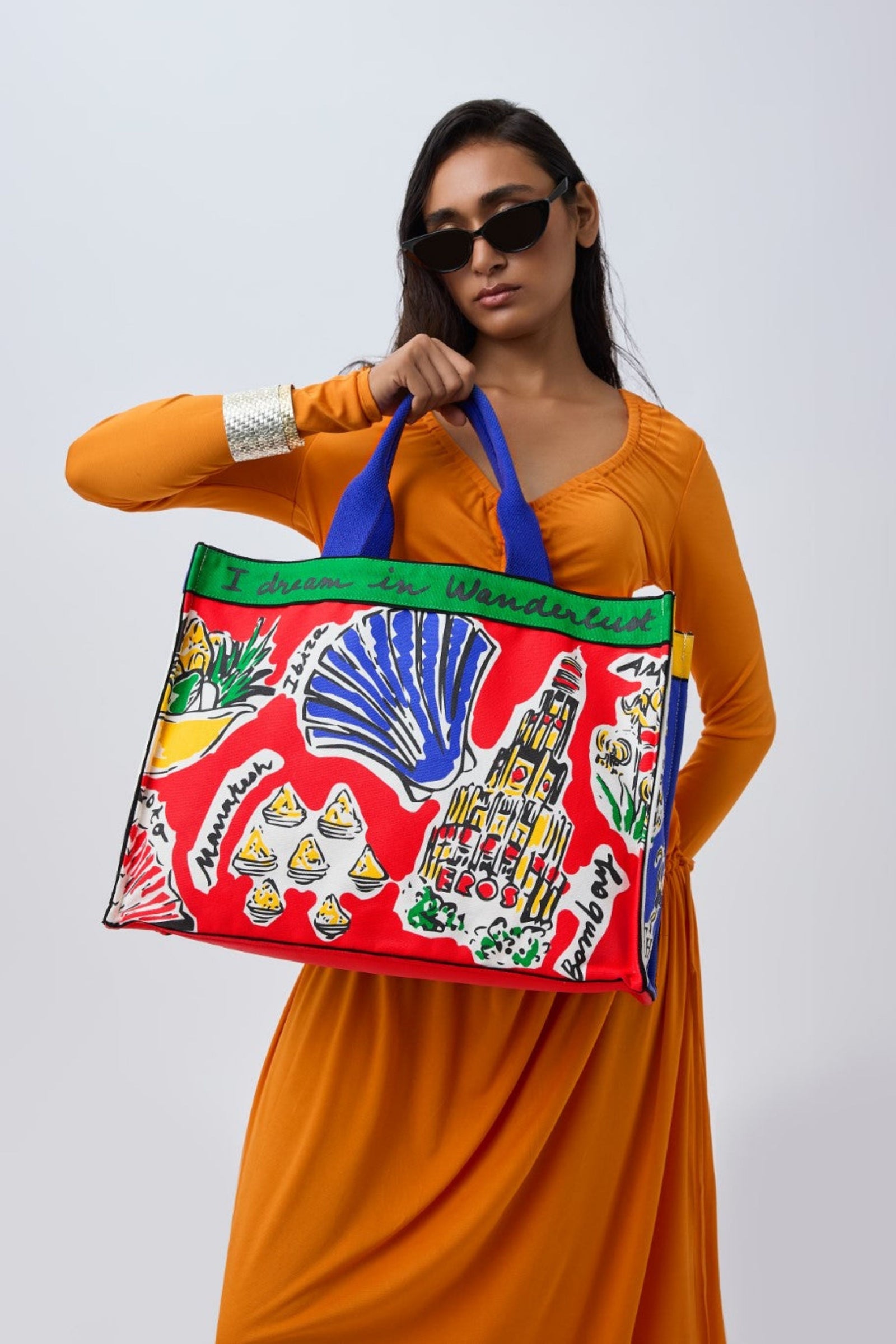 • The india tote brings alive ‘the wild indian garden’ with the rogue palace money and the smirking sun on a cream canvas base with nautical blue handles. Inviting you to dream in india.