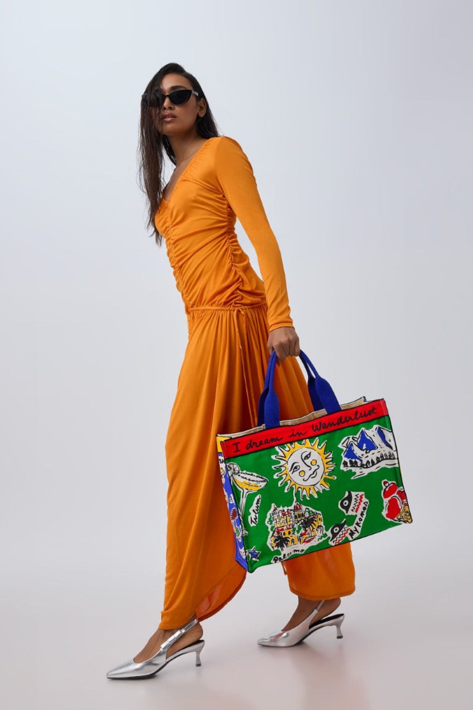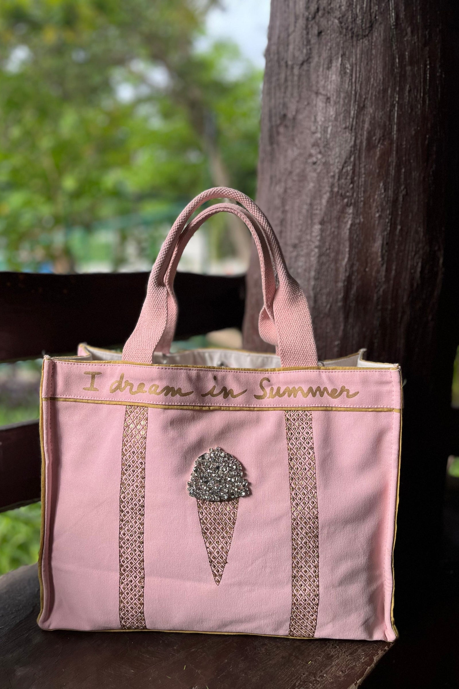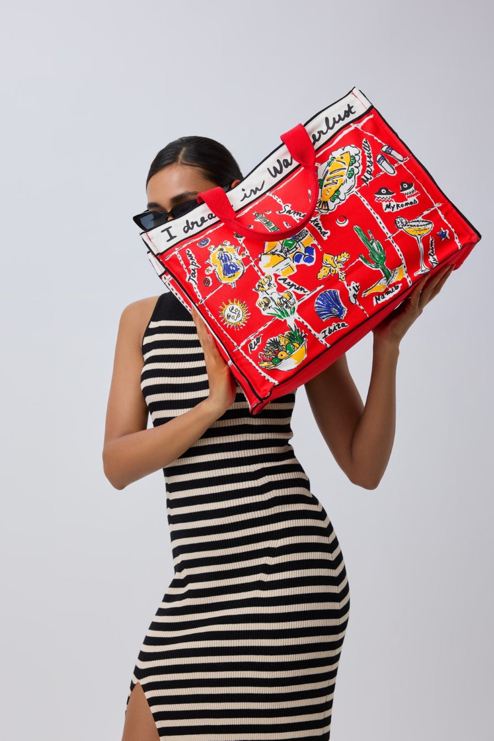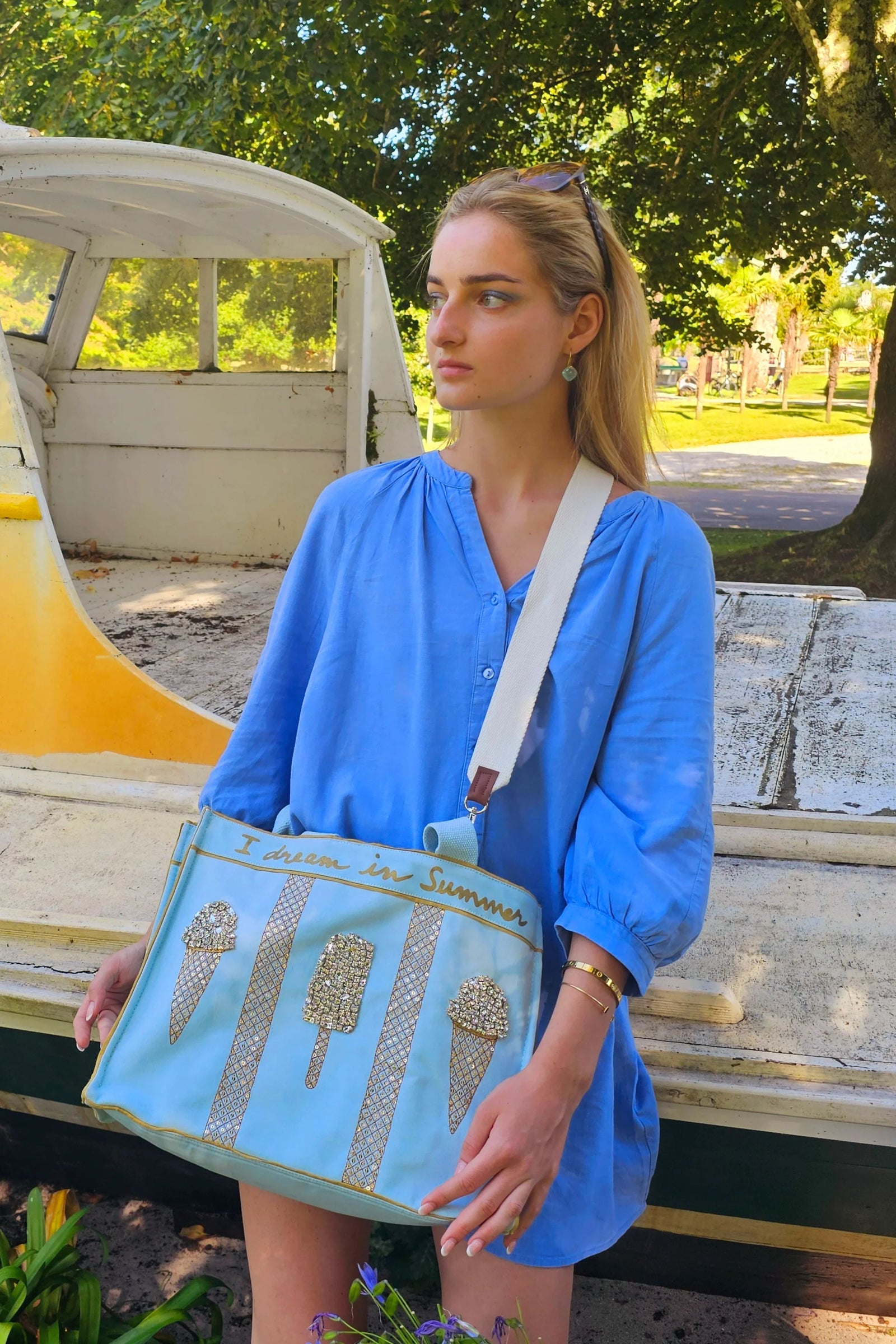 • The india tote brings alive ‘the wild indian garden’ with the rogue palace money and the smirking sun on a cream canvas base with nautical blue handles. Inviting you to dream in india.