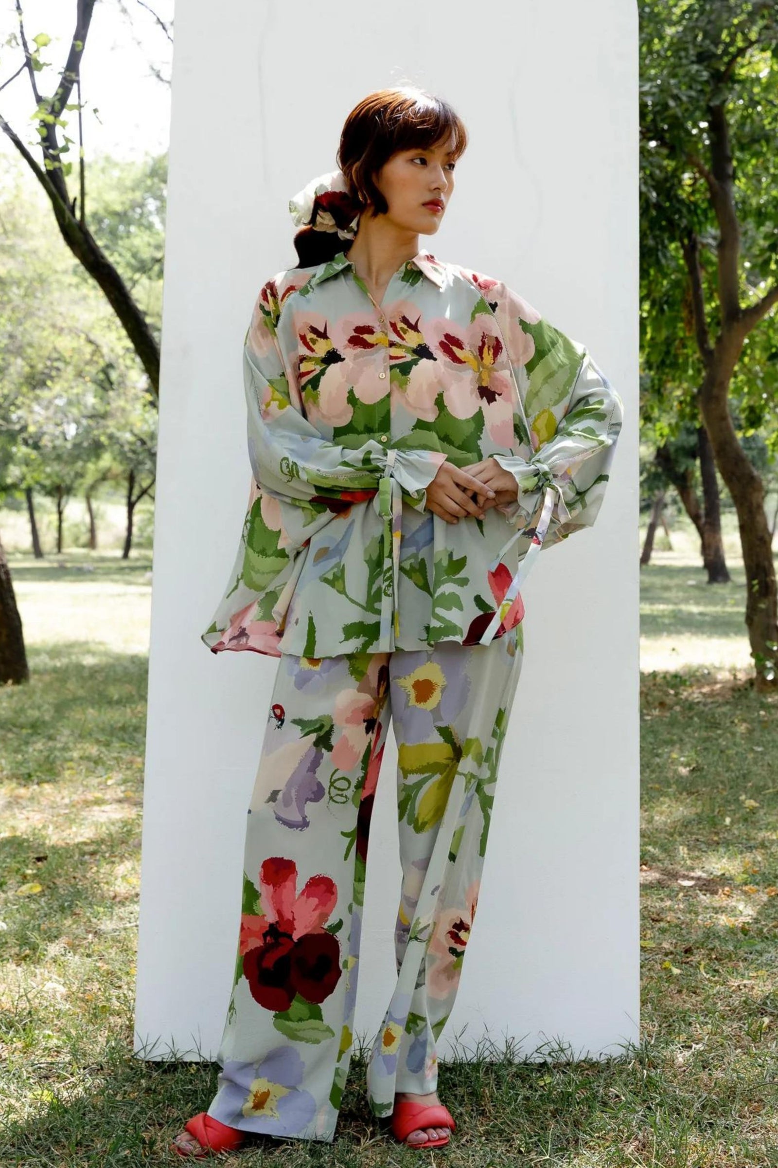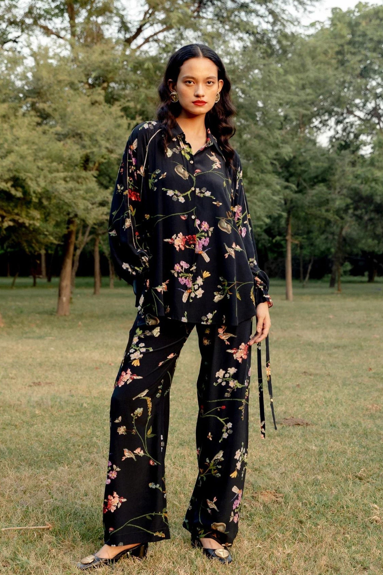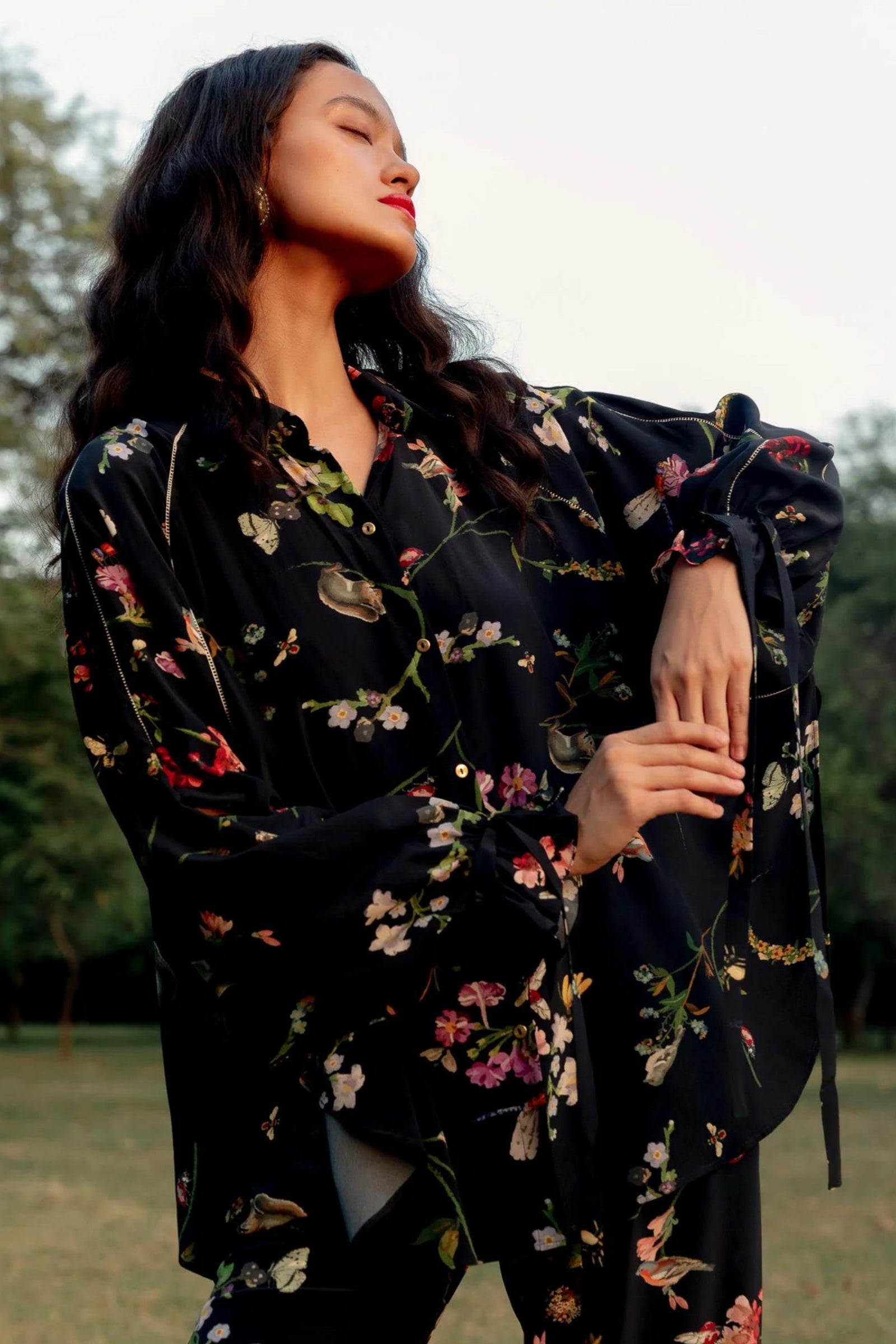 • This floral structured corset made in our hidden treasures print is a great piece to style with your trousers or skirt. 10 Inches in length. Smocking detail in back to allow ease. Side double sided brass zip closure